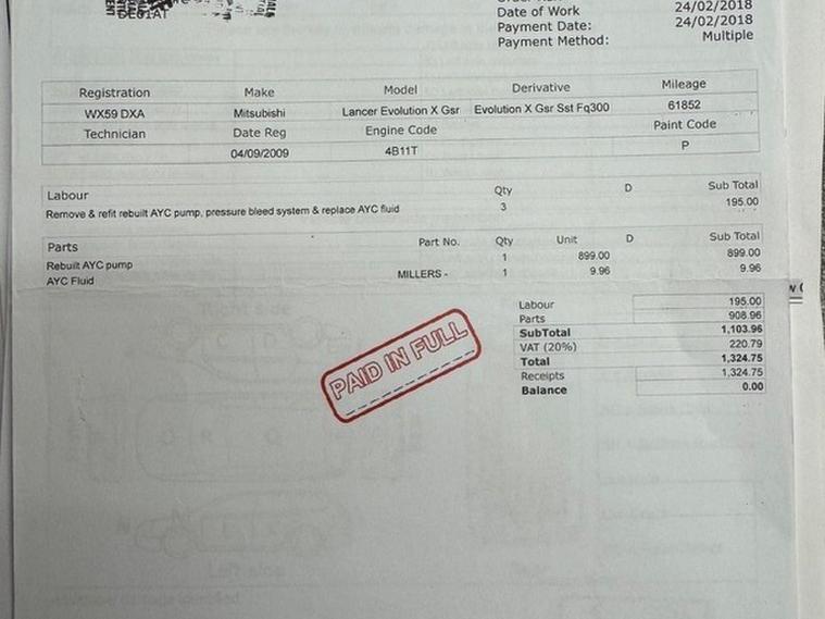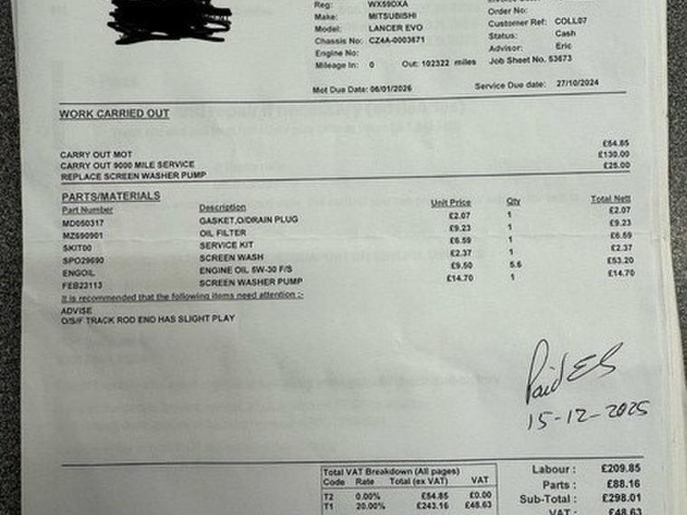 2009 (59) Mitsubishi Lancer Evolution X 2.0 GSR FQ-300 4dr SST in Black. Full Main Dealer Service History with 14 Services (13 Main Dealer Services), last serviced 102, 322 December 2025 by Fields Mitsubishi. This example has had the FQ-330 factory upgrade which included a remapped ECU (295bhp with 300 lb-ft torque to 329bhp with 322 lb-ft torque), High performance exhaust with downpipe, Upgraded intercooler pipe and racing suction pipe. Previous rebuilt AYC Pump done at Auto Torque at a cost of over £1300. Good condition inside and out, wheels to be refurbished for the asking price. Runs and Drives brilliantly, sounds lovely without being too much and turns heads. 6 Months Warranty Included. January 2027 MOT completed by Mitsubishi main dealer. The Evolution X is the end of production model for this iconic rally inspired sports saloon, the evolution models will always have a cult following and with the rest of the evolution models over £20, 000, its only a matter of time until the Evolution X joins them in that category. A really nice example with Full Main Dealer Service History.