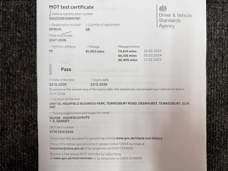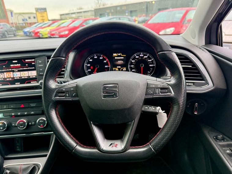 ABSOLUTE CARS have this 5 Door SEAT Leon 1.4 EcoTSI FR Euro 6 (s/s) in Metallic Grey with Alloys. An Ideal Family car + Only £35 a Year Tax ! Call in for a test drive, finance arranged & part exchange considered., 3 months warranty, Next MOT due 22/12/2026, Last serviced on 23/12/2025 at 81, 093 miles, Full service history, Grey Cloth interior, 5 seats, Metallic Grey, 1 owner, Upgrades - Front Parking Sensors, Space-Saving Spare Wheel, Standard Features - 12 Volt Power Supply in Centre Console, 17in Alloy Wheels - Dynamic, 3.5in Drivers Display, ABS - Anti-Lock Braking System and TCS Traction Control System with De-activation, Active Front Head Restraints, Additional Heating-Ventilation Outlet in Rear Centre Console, Alarm - Perimeter and Interior Monitoring with Back-up Horn and Tow-Away Protection, Aluminium Front Door Sill Trims with FR Logo, Ambient Spot Lighting and Footwell Illumination, Anti-Theft Roof Antenna, Automatic Warning Lights, Bluetooth Phone Connection, Body-Coloured Door Handles, Body-Coloured Door Mirrors with Integrated LED Indicators, Bumpers - Exclusive FR Front and Rear, Cargo Rings in the Boot, Child Locks on Rear Doors, Chrome Interior Dashboard Detailing, Chrome Interior Decorative Mouldings, Cruise Control, Cupholders - Front Centre Console x2, Dark Tinted Rear Windows, Daytime Running Lights - Halogen, Driver and Front Passenger Airbags, Driver and Passenger Sunvisor with Covered and Illuminated Mirrors, Drivers Knee Airbag, Drivers Seat Lumbar Adjustment, Dual Zone Climate Control, Dust and Pollen Filter, ESC - Electronic Stability Control with EBA - Emergency Brake Assist, Electric Windows - Front with One-Touch and Anti-Squeeze, Electric Windows - Rear with One Touch and Anti-Squeeze, Electrically Folding Door Mirrors, Electro-Mechanical Power Steering - Speed-Sensitive, Electronic Differential Lock System - XDS, Electronic Engine Immobiliser, Emergency Tyre Repair Kit, Exhaust Pipe - Twin, Front Armrest - Height and Reach Adjustable with Storage Compartment, Front Assist, Front Courtesy Light with Front and Rear Reading Lights, Front Fog Lights with Cornering Function, Front Grille Frame - Chrome, Front Passenger Airbag De-Activation, Front Seat Back Storage Pockets, Front Side Airbags, Fuel Filler Flap linked to Central Locking, Gearshift Indicator, Gloss Black Pillars, Head Restraints - Height Adjustable Front, Head Restraints - Height Adjustable Rear x3, Headlights - Coming Home Function, Height Adjustable Passenger Seat, Height and Reach Adjustable Steering Wheel, Height-Adjustable Drivers Seat, Hill Hold Control, ISOFIX Points in Outer Rear Seats with Top Tether Anchorage Points, Illuminated Boot, Instrument Lighting with Brightness Control, Interior Ambient Lighting - Door Panel, LED Taillights, Leather Gear Knob, Leather Handbrake, Lights Left On Warning Buzzer, Locking Wheel Bolts, Low Fuel Warning Light, Media System Colour, Multi-Collision Braking System, Outside Temperature Gauge, Passenger Door Mirror with Kerb Function when Reversing, RPM Counter, Rear Courtesy Light with Rear Reading Lights, Rear Fog Light, Rear Parking Sensors, Rear Wash - Wipe, Remote Central Locking with Deadlocks, Remote Door Mirror Folding Function, SEAT Drive Profile with Four Different Modes - Eco-Normal-Sport-Individual, SEAT Logo Tailgate Release, Seatbelt Reminder - Front, Seats - Passenger Lumbar Adjustment, Seats - Sports, Speakers x8, Split Folding Rear Seats - 60-40, Sports Suspension, Steering Wheel - Flat-Bottomed Perforated Leather with Red Stitching and FR Logo, Three-Point Seat Belts, Tinted Windows, Trip Computer, Twin-Bulb Front Halogen Headlights with Electrical Adjustment, Two Curtain Airbags, Two Remote Keys with Window Open-Close - Door Mirror Folding and Boot Opening Functionality, Tyre Pressure Monitoring System, Visible VIN in Windscreen, AS WE ARE AN AA CARS DEALER THIS VEHICLE COMES WITH 12 MONTHS AA BREAKDOWN COVER.
