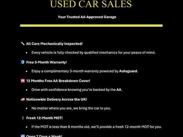 For complete peace of mind, all of our vehicles are supplied with 12 months AA Breakdown Cover and a 3-month warranty. We also offer flexible finance options, and as an FCA-regulated dealer, all finance is provided responsibly and transparently to suit individual needs. Nationwide delivery is available from just £49, making it easy and convenient to buy from us wherever you are.