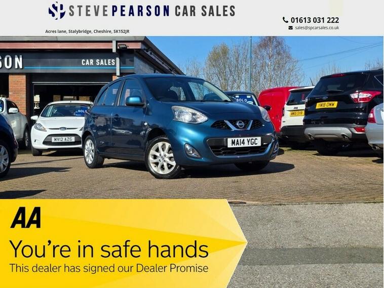 Steve Pearson Car Sales are Pleased to Present this Low Mileage Nissan Micra 1.2 Acenta Automatic 5 Door in Metallic Blue. Only 2 Former Keepers with Full Service History. All usual Nissan refinements include... ABS, air conditioning, alloy wheels, cd player, central locking, climate control, electric windows/mirrors, power steering, adjustable steering, 12v power socket, body coloured bumpers, bluetooth, cruise control, cup holders, ESP, folding rear seats, ISOFix anchor point, MP3, touch screen media system, radio, satellite navigation, speakers, steering wheel controls, traction control etc..... Looks and Drives Superb. This car comes with 2 Keys, professionally valeted and fully HPI checked. We welcome Part Exchange and can offer Great Finance Deals, Please take a look at our TESTIMONIALS On our Website and Buy In confidence from a long Established Family Firm at dealer's website where we have over 60 cars in stock, for more information please telephone or pop in for a cup of tea! Our showroom and floodlit forecourt are open 7 days a week, , Tameside's Finest Collection of Low Mileage Quality Cars