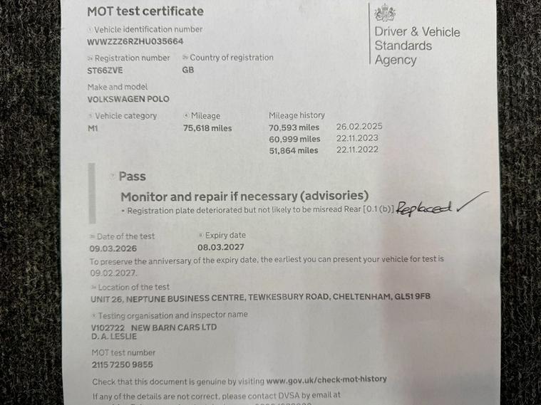 ABSOLUTE CARS have this 5 Door Volkswagen Polo 1.0 BlueMotion Tech Match Edition Euro 6 (s/s) in Metallic Black with alloys & Parking Sensors. An Ideal First Car + Only £20 a Year Tax ! Call in for a test drive, finance arranged & part exchange considered., 3 months warranty, Next MOT due 08/03/2027, Last serviced on 07/03/2026 at 75, 617 miles, Part service history, Grey Cloth interior, 5 seats, Metallic Black, 2 owners, 15in Alloy Wheels - Stratford, ABS - Anti-lock Braking System with HBA - Hydraulic Brake Assist, Air Conditioning - Manual, Air Vent Surrounds - Matt Chrome, Airbags - Side Head and Thorax for Front Passenger, Alarm with Interior Protection, Automatic Post-Collision Braking System, Bag Hooks in the Luggage Compartment x2, Black Radiator Grille with Chrome Trimmed Louvres, Bluetooth Phone Connectivity, Body Coloured Bumpers and Side Sills, Body Coloured Door Handles, Body-Coloured Door Mirrors with Integrated Indicators, Car-Net App-Connect, Centre Console with Open Storage and 12V Socket with Cover, Chrome Trimmed Front Air Intake Surround, Composition Media System, Convenience Pack, Cruise Control, Cruise and Park Pack, Cup Holders - Front x2, Dark Rhodium Fine Decorative Inserts, Door Mirrors - Electrically Adjustable and Heated, Driver Alert System, Drivers and Front Passengers Airbags, Drivers and Front Passengers Safety Optimised Head Restraints, Drivers and Front Passengers Seat Height Adjustment, Drivers and Front Passengers Sun Visors with Vanity Mirrors, Dust and Pollen Filter, ESC - Electronic Stability Control including EDL - Electronic Differential Lock and ASR - Traction Control, Electric Windows - Front, Electric Windows - Rear, Electronic Engine Immobiliser, Front Fog Lights with Static Cornering Function, Front Seat Back Storage Pockets, Front Windscreen Washers and Wipers with 4 Speeds including Interval Delay, Full Size Steel Spare Wheel, Gear Lever Gaiter Surround - Matt Chrome, Glovebox, Grab Handles Front x2 Rear x2 with Integrated Coat Hooks, Halogen Clear Headlights Range Adjustable with Seperate Daytime Running Lights, Heated Rear Windscreen - Automatically Switches Off, Heating and Ventilation with 4 Speed Fan and Air Recirculation, Height and Reach Adjustable Steering Wheel, Height-Adjustable Front Three-Point Seat Belts with Tensioners, High Level 3rd Brake Light, Hill Hold Function, ISOFIX Child Seat Preparation for 2 Rear Seats, Instrument Lighting - White Adjustable Panel Illumination, Interior Lighting with Delayed Switch Off, Light and Sight Pack, Lights on Warning Buzzer, Load Sill Protector, Luggage Compartment - Variable Load Floor, Luggage Compartment Cover - Removable, Luggage Compartment Light, Manually Dimmable Interior Rear-View Mirror, Matt Chrome - Handbrake Grip Button, Matt Chrome - Internal Door Handles, Multi-function Display, Multifunction Computer, Multifunction Leather Steering Wheel Including Leather Trimmed Gear Knob and Handbrake Grip, Note Pad Holder - Pen Holder - Coin Holder in Glovebox, Parking Sensors - Front and Rear, Power Assisted Steering - Speed Sensitive, Reading Lights - Front x2 & Rear x1, Rear Tinted Glass from B Pillar Backwards - Approx 65 Percent Tinted, Rear Windscreen Washer and Wiper with Interval Delay, Speedo and Rev Counter - Electronic Odometer - Trip - Service Interval Display - Digital Clock and Fuel Gauge, Split Folding Rear Backrests 60-40, Storage Compartment in Front Doors, Storage Compartment in Rear Doors, Sunglasses Holder, Three Rear 3-Point Seat Belts, Three Rear Head Restraints, Two-Tone Horn, Tyre Pressure Loss Indicator, Vanity Mirrors - Illuminated, Warning Buzzer and Light for Front Seat Belts if Unfastened, White Turn Signal Lights At Rear, AS WE ARE AN AA CARS DEALER THIS VEHICLE COMES WITH 12 MONTHS AA BREAKDOWN COVER.
