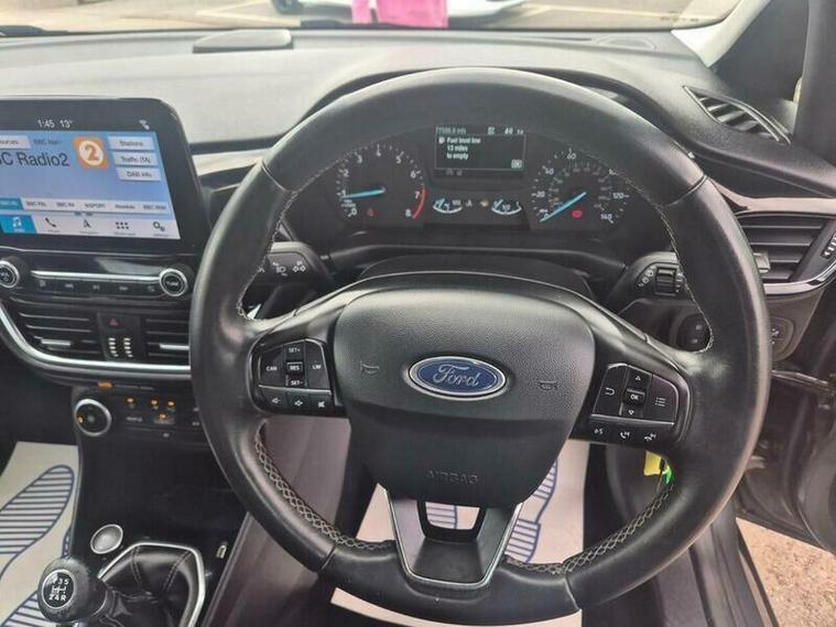 This 2019 Ford Fiesta Ti-VCT Zetec is presented with a clear vehicle history check and benefits from a 12 month MOT provided on purchase, offering peace of mind for its next owner. This 1.1L petrol model, finished in the Zetec trim, meets Euro 6 emissions standards. It comes with partial service history, with the last service recorded at 77, 388 miles. Notable features include the NCAP Pack with automatic headlights, Ford DAB Radio with Ford SYNC3 compatibility for Apple CarPlay and Android Auto, manual air conditioning, and automatic on-off headlights.