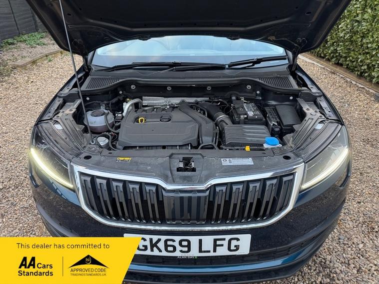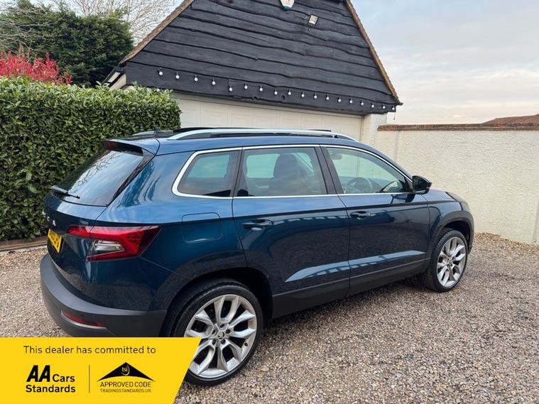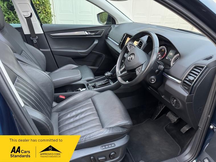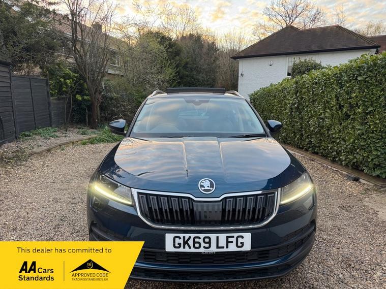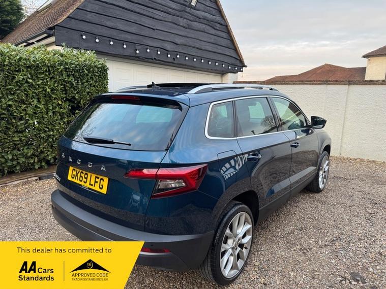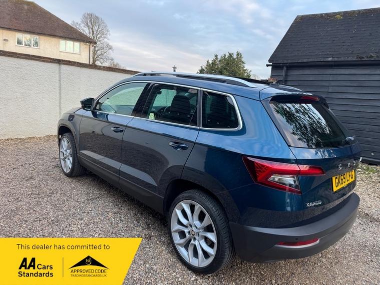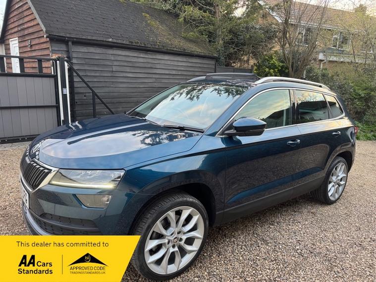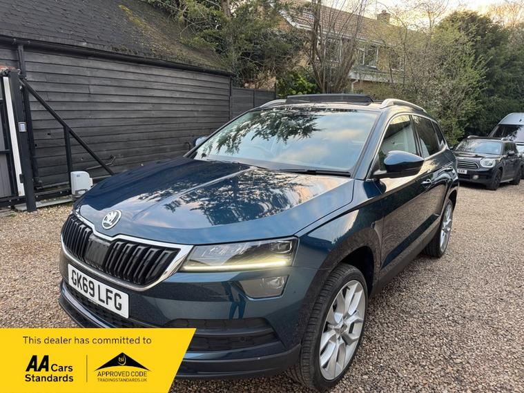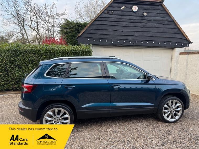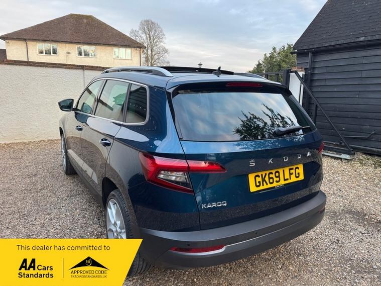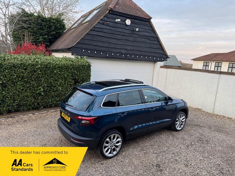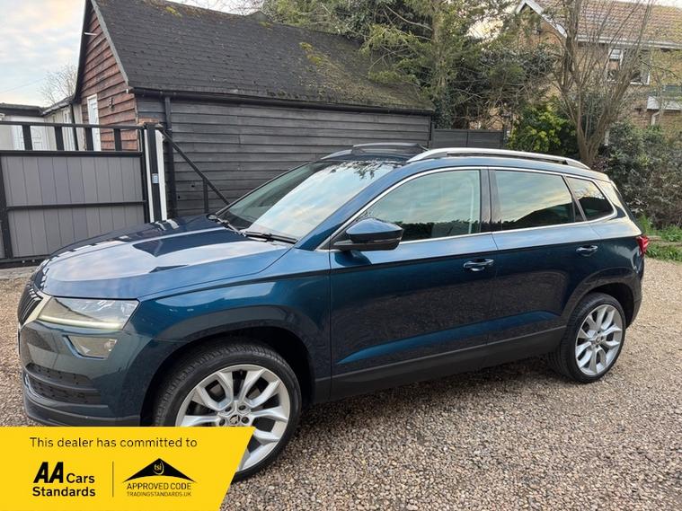 LOW MILEAGE 15, 000 MILES WITH A HUGE SPEC, Registered 28th September 2019 on a 69 plate, Petrol Blue Metallic With RARE FULL BLACK LEATHER INTERIOR, RARE PANORAMIC OPENING GLASS ROOF, 1 PREVIOUS OWNER, FULL VW SERVICE HISTORY, SERVICED AT VW 13/10/2020 @ 3, 437, 24/09/2021 @ 5, 764, 04/07/23 @ 11, 951, 28/06/24 @ 13, 178, 24/09/25 @ 14, 913, REVERSING CAMERA, APPLE CAR PLAY, KEYLESS GO, KEYLESS ENTRY, AUTOMATIC DSG ALSO WITH PADDLE CHANGE ON STEERING WHEEL, HEATED SEATS, FRONT AND REAR PARKING SENSORS, LEATHER CENTRE ARMREST, ELECTRIC MEMORY DRIVERS SEAT, ELECTRIC HEATED FOLDING MIRRORS, FRONT AND REAR FOG LIGHTS, ROOF RAILS IN CHROME, AIR CONDITIONING, DUAL CLIMATE CONTROL, REMOTE CENTRAL LOCKING, X2 REMOTE KEYS, 19 Inch ALLOY WHEELS, POWER BOOT, EURO 6, ULEZ COMPLIANT, PETROL, X4 Electric Windows, FINANCE AVAILABLE, 12 MONTHS AA BREAKDOWN COVER INCLUDED, TRADING STANDARDS APPROVED DEALER, STUNNING LOW MILEAGE SKODA KAROQ 1.5 TSI ACT EDITION 150 PS DSG IN EXCELLENT CONDITION WITH A HUGE SPEC. VIEWING BY APPOINTMENT, MOBILE 01494352785.