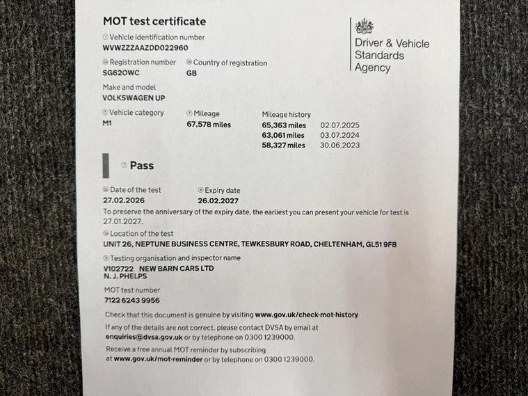 ABSOLUTE CARS have this 3 Door Volkswagen up! 1.0 High up! Euro 5 in Solid White with Alloys. An Ideal First Car + Only £20 a Year Tax & Group 2 Insurance ! Call in for a test drive, finance arranged & part exchange considered., 3 months warranty, Next MOT due 26/02/2027, Last serviced on 27/02/2026 at 67, 577 miles, Full service history, Grey Part leather interior, 4 seats, White, 3 owners, Upgrades - Full Size Steel Spare Wheel, Standard Features - 12V Socket - Centre Console, 15in Alloy Wheels - Spoke, ABS - Anti-Lock Braking System, ASR - Anti Slip Regulation, Air Conditioning, Air Vent Surrounds - Chrome Effect, Airbags - Curtain Front and Rear, Airbags - Driver, Airbags - Front Passenger, Airbags - Side, Airbags - Side Head and Thorax for Front Passenger, Aux-In Socket, Black Interior Door Handles, Black Pearl Upper Dashboard, Bluetooth Telephone Preparation for Hands Free Profile Enabled Telephones, Body Coloured Bumpers, Central Locking - Remote with 1 Remote Key, Chrome Effect Handbrake Grip Button, Chrome Effect Light and Heating Switches, Comfort Pack, Cup Holders - Front and Rear, Daytime Running Lights, Differential Lock - Electronic, Digital Clock, Door Handles - Black, Door Mirrors - Electrically Adjustable and Heated, Drivers Seat Height Adjustment, Drivers Sun Visor with Ticket Holder, ESP - Electronic Stability Programme, Electric Windows - Front, Electronic Engine Immobiliser, Front Fog Lights, Galvanised Body, Glovebox, HBA - Hydraulic Brake Assist, Head Restraints - Front Integrated, Headlights - Beam Regulator, Headlights - Halogen Clear - Range Adjustable, Heated Front Seats, Heated Rear Window, Heating and Ventilation System with 4 Speed Fan, Height and Reach Adjustable Steering Wheel, High Gloss Black Air Vent Surrounds, High Gloss Black Handbrake Button, High Level 3rd Brake Light, ISOFIX Child Seat Preparation, Instrument Lighting - White Adjustable Panel Illumination, Interior Light Delay, Lights on Warning Buzzer, Lockable Fuel Filler Cap, Luggage Compartment Cover, Maps & More Touch-Screen Navigation-Radio Infotainment Device with Integrated Voice Control and Carry Case, One Touch Indicator, Parking Lights, Power Assisted Steering - Speed Sensitive, RCD 215 Radio-MP3-CD Player, Rear Head Restraints x 2 - Height-Adjustable, Rear Wash Wipe with Intermittent Wipe, Seatbelt Reminder, Seats - Easy Entry Sliding Front, Split Folding Rear Backrests 60-40, Steering Wheel - 3-Spoke Leather Trimmed Split Grain w Chrome Insert & Gear Knob & Handbrake Grip, Storage Compartment in Front Doors, Sun Visors - Front Passengers with Vanity Mirror, TCS - Traction Control System, Tinted Glass - Heat Insulating, Tool Kit, Two-Tone Horn, Variable Boot Floor, Windscreen Wipers with Intermittent Wipe and 4 Position Delay, Winter Pack, AS WE ARE AN AA CARS DEALER THIS VEHICLE COMES WITH 12 MONTHS AA BREAKDOWN COVER.
