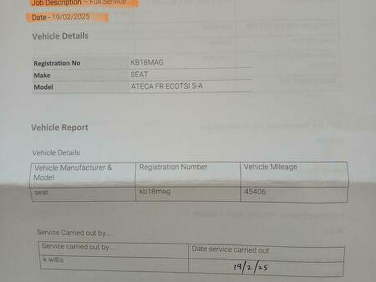 Excellent example of this Seat Ateca FR ECOTSI Auto, 1 Lady owner from new with full service history(Pictured) and lovely low miles, Part exchanges welcome, HPI Clear, All our vehicle are hand pick and specially selected to qualify for the AA Dealer Promise Program providing you with total peace of mind., We guarantee all our vehicles are 100% HPI Checked and supplied with a full 12 Mth MOT plus a 12 Mth AA RoadSide Assistance and a comprehensive AA parts and labour Warranty Package. Together with our teams no pressure sales approach and with over 40 years combined experience and good old-fashioned customer service you are in very safe hands. Part exchanges are always welcome, and help is always on hand to advise on potential finance options and the many extended vehicle warranties that are available., Zero contact home delivery available please ask for details. Zero Contact Home Delivery or Click and Collect Available on all our vehicles.