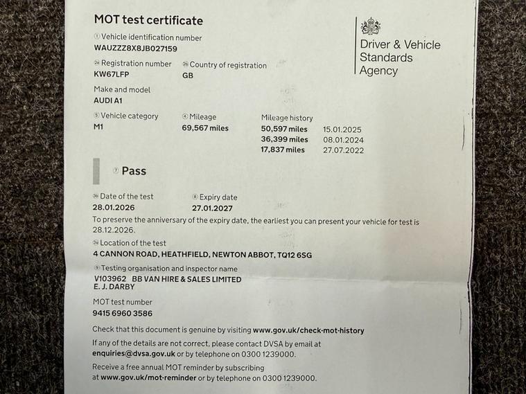 This Audi A1 TFSI Black Edition from 2017 boasts a remarkable history, having had only two previous owners. This stylish hatchback features a 1.4 litre petrol engine and meets Euro 6 emissions standards. It comes equipped with a range of desirable features, including light and rain sensors that automatically activate the headlights, as well as Xenon Plus headlights for enhanced visibility. For your convenience, it also includes a Bluetooth interface for mobile telephone preparation and electronic climate control to ensure a comfortable cabin temperature., , Experience impressive performance with this Audi A1, achieving 0 to 60 miles per hour in just 7.5 seconds, which is quicker than many other vehicles in its class. Furthermore, its fuel economy is a standout feature, delivering an excellent 57 miles per gallon, making it an economical choice for your daily journeys., 3 months warranty, Next MOT due 27/01/2027, Last serviced at 71, 681 miles, Full service history, Part leather interior, 4 seats, Metallic White, 2 owners, Upgrades - Roof Contrast Line - Brilliant Black - Gloss, Fine Nappa Leather - S Line Embossed Super Sports Seats - Black, Rear Floor Mats, Sport Suspension, Standard Features - 18in Alloy Wheels - 5-V-Spoke Design Titanium Look-Diamond Cut, AMI - Audi Music Interface, AUX-IN Socket, Adaptive Brake Lights, Air Vent Sleeves - High Gloss Black, Aluminium Trim for Control Switches-Glove Compartment-Door Handles-Door Sills, Anti Theft Locking Wheel Bolts, Audi Drive Select, Audi Sound System, Body Coloured Door Mirrors, Centre Console in High-Gloss Black, Centre Console with Two Cup Holders and 12V Socket, Cloth Headlining in Black, Concert Radio, Connectivity Package, DAB Digital Radio, Display Screen - 6.5in High Gloss Black, Door Mirrors - Electrically Adjustable and Heated, Door Sill Trims - Aluminium with S Line Logo, Driver - Front Passenger - Front Side and Head Airbag System, Driver and Front Passenger Seats with Manual Height-Forwards and Backwards Adjustment, Drivers Information System - DIS, ESC - Electronic Stabilisation Control, Electric Windows - Front, Electromechanical Power Steering, Electronic Climate Control, Exhaust Tailpipe - High-Gloss Black Trims, First Aid Kit and Warning Triangle, Front Floor Mats, Front Fog Lights, Front Passenger Airbag Deactivation Switch, Glovebox - Illuminated, Handbrake Grip - Leather, Head Restraints - Rear, Heat Insulating Glass - Windscreen and Side Windows, Heated Rear Windscreen, ISOFIX Child Seat Mounting, LED Interior Light Pack, LED Rear Lights, Light and Rain Sensors, Manually Adjustable Lumbar Support in Front Seats, Mobile Telephone Preparation - Bluetooth Interface, Non-Smoking Package, Number Plate Holder - Matt Black, Pedals in Stainless Steel, Privacy Glass, Radiator Grille - Matt Black, Radiator Grille Frame - High Gloss Black, Rear Diffuser - High Gloss Black, Rear Fog Lights, Remote Central Locking with 2 Fold Away Keys, S Line Sports Suspension, SD Card Reader, SD Card Reader x2, Seat Belt Height Adjustment for Front Seats, Seat Belt Monitoring, Seats - Front Easy Entry, Secondary Collision Brake Assist, Split Folding Rear Seat, Spoiler - Front Lip - High Gloss Black, Sports Gear Knob with Aluminium Trim, Steering Wheel - 3-Spoke Leather Sports Multi-Function Flat-Bottomed, Steering Wheel - Height and Reach Adjustable, Styling Package - High-Gloss Black, Sunband for Windscreen, Thatcham Category 1 Alarm and Immobiliser, Tool Kit and Jack, Tyre Pressure Monitoring System, Tyre Repair Kit, Washer Fluid Level Indicator, Xenon Plus Headlights, AS WE ARE AN AA CARS DEALER THIS VEHICLE COMES WITH 12 MONTHS AA BREAKDOWN COVER.