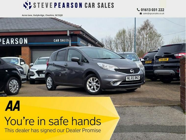 Steve Pearson Car Sales are Pleased to Present this Low Miles Nissan Note 1.2 Acenta 5 Door in Metallic Grey. Only 2 Former Keepers with Lots of Service History. **£20 Road Tax** All usual Nissan refinements include..... ABS, Air conditioning, alloy wheels, cd player. central locking, electric windows/mirrors, power steering, adjustable steering, 12v power socket, bluetooth, body coloured bumpers, brake assist, front and rear parking senors, cruise control, cup holders, daytime running lights, front airbags, front fog lights, heated rear windshield, ISOFix anchor point, mp3, radio, side impact airbags, speakers, steering wheel controls, stop start system, speed limiter, traction control etc.....Looks and Drives Superb. This car comes with 2 Keys, professionally valeted and fully HPI checked. We welcome Part Exchange and can offer Great Finance Deals, Please take a look at our TESTIMONIALS On our Website and Buy In confidence from a long Established Family Firm at dealer's website where we have over 60 cars in stock, for more information please telephone or pop in for a cup of tea! Our showroom and floodlit forecourt are open 7 days a week, , Tameside's Finest Collection of Low Mileage Quality Cars