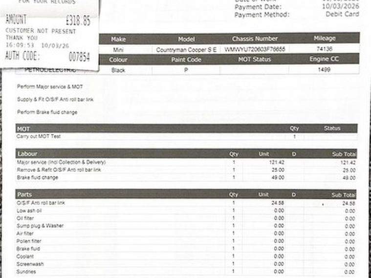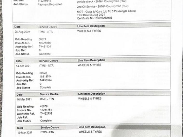 This car comes with 5 seats, Black, 2 owners, Upgrades - Acoustic Pedestrian Protection, Tyre Repair Kit, Firework Cloth - Carbon Black, Standard Features - 17in Alloy Wheels - Light Spoke, 3 Point Seatbelts on all Seats, 3rd Brake Light, Air Conditioning - Manual, Airbags for Driver and Front Passenger, Alarm and Immobiliser - Thatcham CAT 1, Anti-Lock Braking System - ABS, Bluetooth Hands Free Function with USB Audio, Body Coloured Fuel Filler Cap in Rear Right Side Panel - Linked to Central Locking, Brake Pad Wear Indicator, Charger Cable Mode 2, Charging Flap in Side Wall - Front Left, Child Seat ISOFIX Attachment, Chrome Bezels around Rear Lights and Headlights, Colour Line - Carbon Black, Condition Based Service, Crash Sensor, Cruise Control with Brake Function, Cupholders - Two in Front, DAB Tuner, DTC - Dynamic Traction Control with EDLC - Electronic Differential Lock Control, Daytime Driving Lights, Decorative Rings Surrounding Round Instruments in Chrome Plated, Door Handles - Chrome Plated, Door Handles - Interior - Chrome Plated, Door Sill Finishers - Metal Look and Model Dependent Lettering, Dynamic Brake Lights and 3rd Brake Light in LED Technology in Roof Spoiler, Dynamic Stability Control - DSC, Electronic Parking Brake, Embellisher at Bottom Edge of All Windows - Chrome Plated, Engine Scoop in Body Colour, Exhaust Tailpipe - Visible - Single - Round with Chrome Finisher, Exterior Mirrors - Aspheric on Drivers Side - Electrically Adjustable, External Visible VIN, Floor Mats, Follow Me Home Function, Front Centre Armrest, Front Fog Lights, Front Passenger ISOFIX and Airbag De-Activation Switch, Fuel Pump Automatic Cut-Off in Crash Situation, Gearshift-Selector Lever and Handrake Lever Gaiters in Sensatec, Halogen Lights for Low Beam and High Beam Headlights, Headlight - Beam-Throw Control Electrical with Manual Adjustment, Headliner - Satellite Grey, Headrests For All Seats - Manually Adjustable, Heated Mirrors and Windscreen Washer Jets, Heated Rear Window with Automatic Deactivation, Heater with Mechanical Control and Recirculating-Air Button, Intelligent Emergency Calling - E-Call, Interior Light Pack, Interior Lights - Integrated into Centre Front Headliner and Centre Light in Headlining, Interior Mirror - Mechanical Anti-Dazzle, Interior Trim - Hazy Grey, Lashing Eyes in Luggage Compartment, Locking System with Central Locking, MINI Central Display with LED Ring, MINI Connected, MINI Driving Modes, MINI Excitement Pack, MINI Mobility System, MINI Navigation System, MINI TeleServices, MINIMALISM Fuel Saving Technology, Mechanical Seat Adjustment for Drivers Seat and Passengers Seat, Microfilter, Mirror Caps in Body Colour, Model Logo Countryman in Chrome, Multifunction Controls for Steering Wheel, Multiple-Control-Arm Rear Axle, Non Smoker Package, On-Board Computer, PDC - Park Distance Control - Rear, Passenger Seat Height Adjustable, Performance Control, Personal Profile, Power Steering with Servotronic, Radiator Grille - Chrome Border with Honeycomb Structure in Matt Black with Red S Logo, Rain Sensor and Automatic Headlight Activation, Rear Fog Light, Rear Window Wiper, Revolution Counter, Roof Rails - Silver, Roof Spoiler Painted in Roof Colour, Roof in Body Colour, Security Locking Wheel Bolts, Side Scuttles Chrome-Plated with Red S Lettering with Integrated Direction Indicator White, Sills-Bumper Edges-Wheel Arches - Black with Model-Specific Bumper Trims, Single Joint Spring Strut Front Axle, Speakers - Four Mid Range in Front and Rear Doors and Two Woofers Under Front Seats, Speedometer on Steering Column, Sport Leather Steering Wheel, Sport Seats for Driver and Front Passenger, Start-Stop Button with Keyless Start, Steering Wheel Column Adjustment Mechanically in Height and Length, Storage Options in the Trim Panels of Each Front and Rear Side Panel as well as Centre Console, Sun Visors with Integrated Vanity Mirrors on Drivers and Passengers Sides, Tailgate Gas Struts Assist When Opening and Holding In An Opened Position, Tailgate Handle - High Gloss Black, Tool Kit in Luggage Compartment, Twin Horns, Tyre Pressure Indicator, Visual Boost Radio, White Indicators, Window Lifts Electrical, eDrive Button,