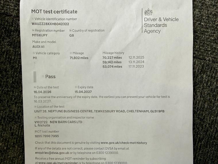 This 2016 Audi A1 TDI SE offers exceptional value with remarkably low mileage for its age, having covered just 71, 792 miles. This stylish hatchback is powered by an efficient 1.6 litre diesel engine, meeting Euro 6 emission standards. It comes equipped with air conditioning to ensure a comfortable cabin environment, making it a practical choice for everyday driving., , The Audi A1 TDI SE stands out with its impressive fuel economy, achieving an outstanding 76 miles per gallon, which is significantly better than many other vehicles in its class. Furthermore, its low CO2 emissions and low insurance group rating contribute to lower running costs, making it an economical option. This model also offers brisk performance, accelerating from 0 to 60 miles per hour in just 9.1 seconds, demonstrating a good balance of efficiency and responsiveness., 3 months warranty, Next MOT due 15/04/2027, Last serviced on 17/04/2026 at 71, 802 miles, Part service history, Black Part leather interior, 4 seats, Metallic White, 3 owners, 12V Power Socket - Centre Console, 15in Alloy Wheels - 6J 5-Arm Design, ABS - Anti-Lock Braking System, ASR - Anti Slip Regulation, AUX-IN Socket, Adaptive Brake Lights, Air Conditioning, Air Vent Sleeves - Matt Black, Airbags - Driver, Airbags - Front Passenger, Airbags - Front Side System, Airbags - Head System, Alarm - Thatcham Category 1, Anti Theft Locking Wheel Bolts, Body Coloured Door Mirrors, Concert Radio - MP3-CD Player, Cup Holders - x2 in Centre Console, DAB Digital Radio, Dashboard - Black, Daytime Running Lights, Display Screen - 6.5in High Gloss Black, Door Mirrors - Electrically Adjustable and Heated, Dynamic Suspension, EBD - Electronic Brakeforce Distribution, EDL - Electronic Differential Lock, ESP - Electronic Stability Programme, Electric Windows - Front, Electromechanical Power Steering, First Aid Kit, Front Floor Mats, Front Passenger Airbag Deactivation Switch, Glovebox - Illuminated, Halogen Headlights, Head Restraints - Rear, Headlining - Titanium Grey Cloth, Heat Insulating Glass - Windscreen and Side Windows, Heated Rear Windscreen, ISOFIX Child Seat Preparation for Rear Seats with Top Tether, Immobiliser, Non-Smoking Package, Pollen Filter, Radio Remote Control with Safelock and Anti Theft System, Remote Central Locking with 2 Fold Away Keys, SD Card Reader, Seat Belt Reminder for All Seats, Seats - Drivers Manual Height Adjustment, Seats - Front Easy Entry, Seats - Front Passenger Manual Height Adjustment, Seats - Rear x 2, Secondary Collision Brake Assist, Speakers x6 - Front and Rear, Split-Folding Rear Seats, Steering Wheel - 3-Spoke Sports, Steering Wheel - Height and Reach Adjustable, TP Memo - Automatically Saves Traffic News, Tool Kit and Jack, Two Fold Away Keys, Tyre Pressure Monitoring System, Tyre Repair Kit, Warning Triangle, AS WE ARE AN AA CARS DEALER THIS VEHICLE COMES WITH 12 MONTHS AA BREAKDOWN COVER.