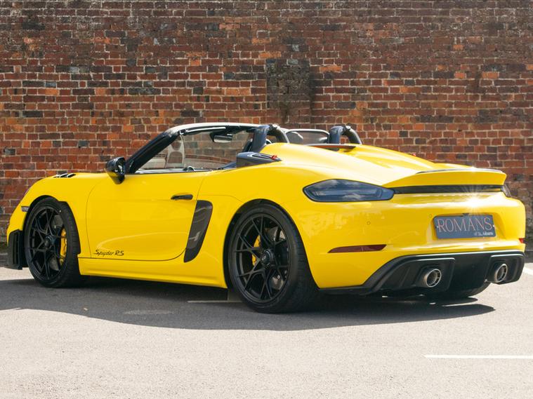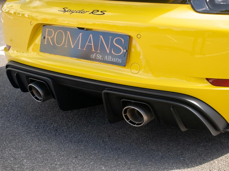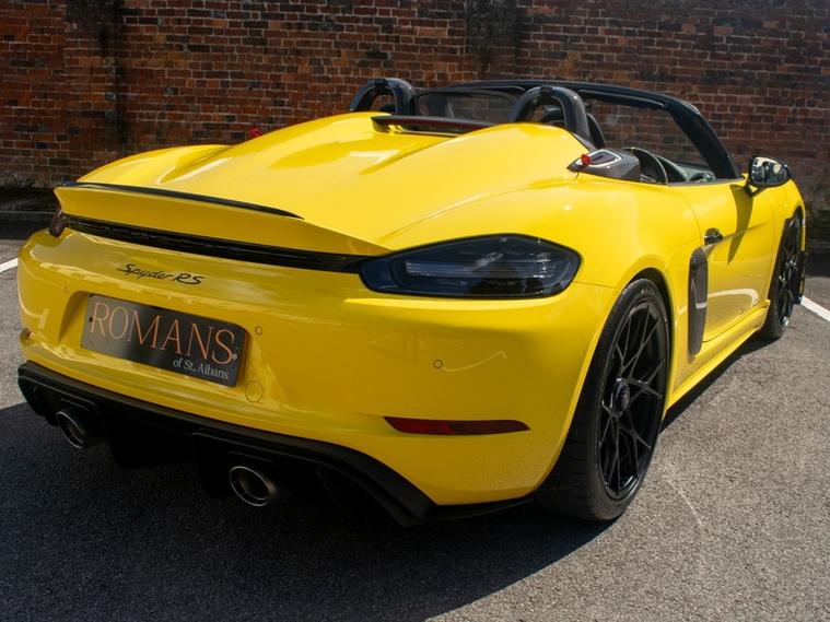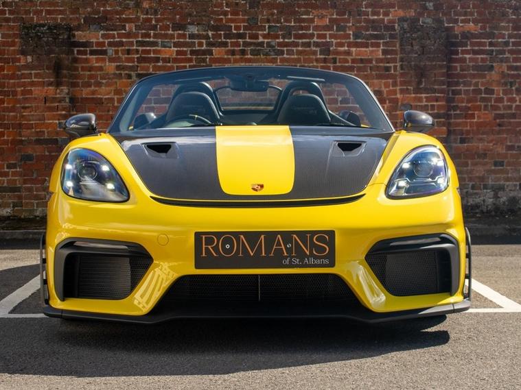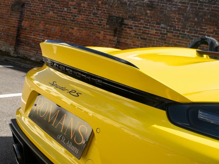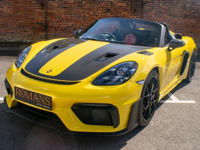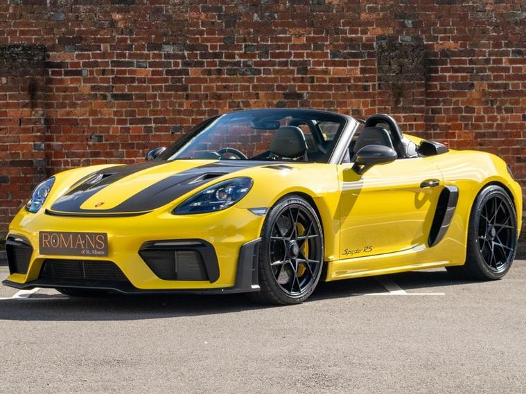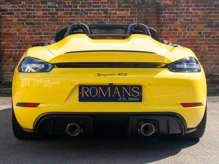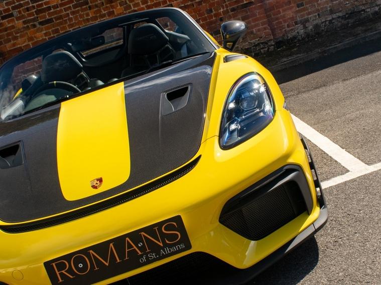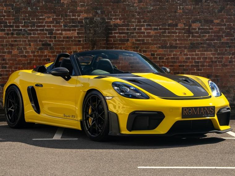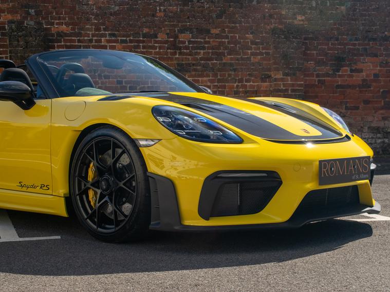 Romans of St Albans are delighted to present this 74 Plate Porsche 718 Spyder RS finished in Racing Yellow paint with Black/Arctic grey interior. As close to brand new as it gets and benefits from Porsche Warranty until 2027! This incredibly desirable example features a huge list of optional extras to include: Racing Yellow, Soft Top - Black, Weissach Package, Windscreen Frame in Black Foil, Leather Interior Weissach Package with Leather & Race-Tex, Race-Tex-Leather - Black - Arctic Grey, Full Bucket Seats, Window Triangle Trims in Carbon - Front, Bonnet in Carbon-Weave Finish with Partial Painting, BOSE Surround Sound System, Door Handles Painted in Black - High-Gloss, Front Axle Lift System, Chrono Package, PCCB - Porsche Ceramic Composite Brakes, LED Main Headlights including Porsche Dynamic Light System - PDLS, Seat Belts - Arctic Grey, Steering Column Casing in Leather, Door Sill Guards - Carbon - Illuminated, Porsche Crest on Storage Compartment Lid in Race-Tex, Fire Extinguisher, Park Assist - Rear with Reversing Camera, Light Design Package... FINANCE AVAILABLE. ULEZ COMPLIANT. FREE ON-SITE PARKING (ASK FOR DETAILS.) All of our clients have the added peace of mind that we have our own workshop facilities with free courtesy cars. Part Exchange very welcome, nationwide delivery also available. To avoid a wasted journey we highly recommend making an appointment, so call us now to get yours booked! Romans provide the highest of quality vehicles, and have at least 80 cars in stock at any one time. This means not all cars can be kept on site. This will also allow us to give you our fully undivided attention when viewing the vehicle you are interested in, WE ARE LOOKING TO BUY YOUR TOP SPEC, LOW MILEAGE, FULL SERVICE HISTORY PRESTIGE, SPORTS, AND 4X4 VEHICLES. GET MORE FOR YOUR VEHICLE BY EITHER SELLING TO US, OR ASKING US TO SELL YOUR VEHICLE FOR YOU. PRIVATE BUYERS WANT WARRANTIES, THEY WANT TO PART EXCHANGE, THEY WANT FINANCE - TAKE ADVANTAGE OF ALL OUR FACILITIES. CALL US NOW TO DISCUSS GETTING RID OF YOUR VEHICLE QUICKLY.