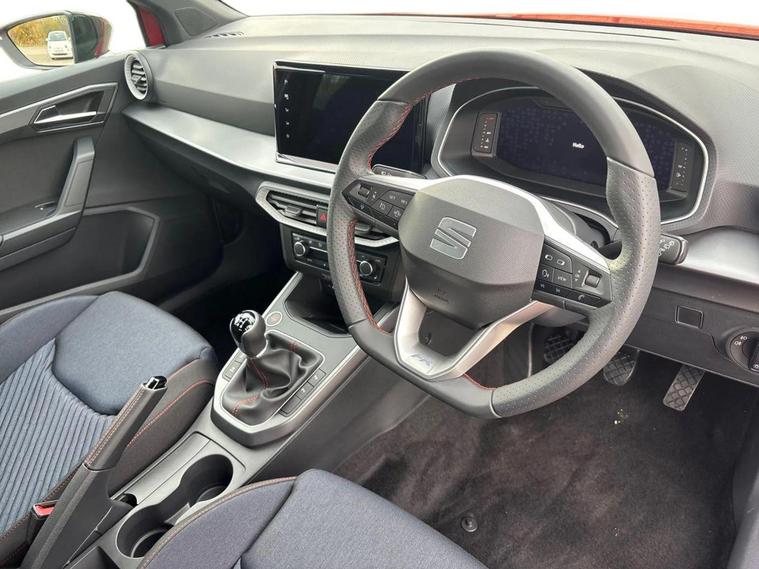 - Perforated flat bottomed leather steering wheel/gear knob/handbrake with red stitching and FR logo