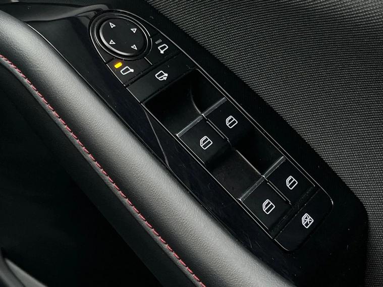 - Cloth upholstery with red stitching and interior accents