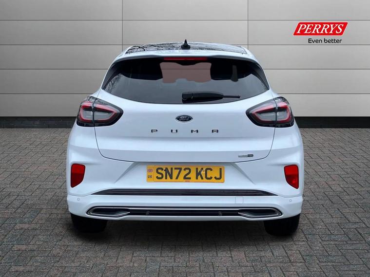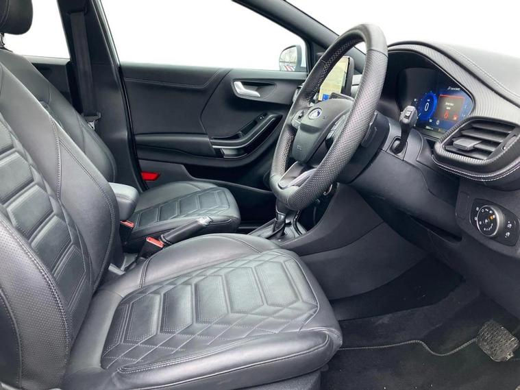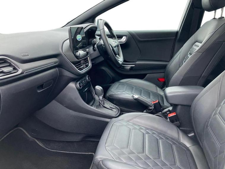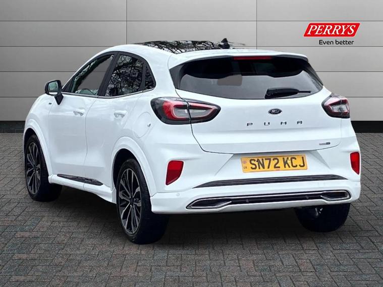 This 2022 Ford Puma ST-Line Vignale is very stylish and a compact SUV which is powered by an efficient 1.0L Petrol Hybrid engine, meeting Euro 6 emission standards. It features striking fixed LED signature headlamps and an openable panorama roof, enhancing both visibility and the driving experience.