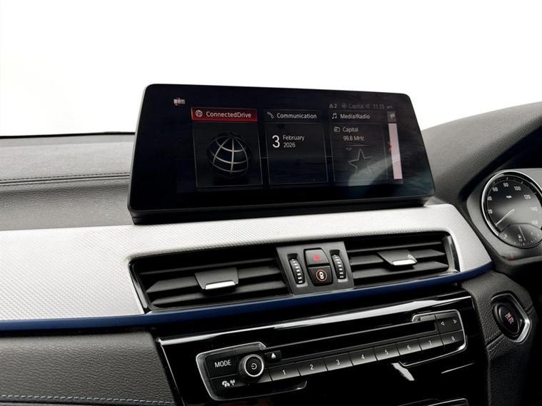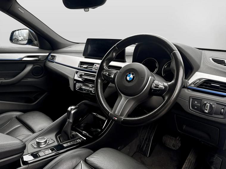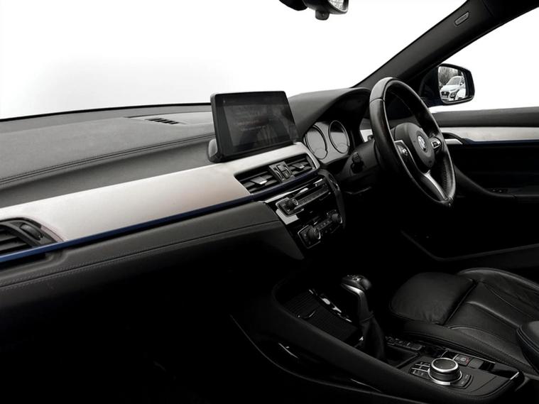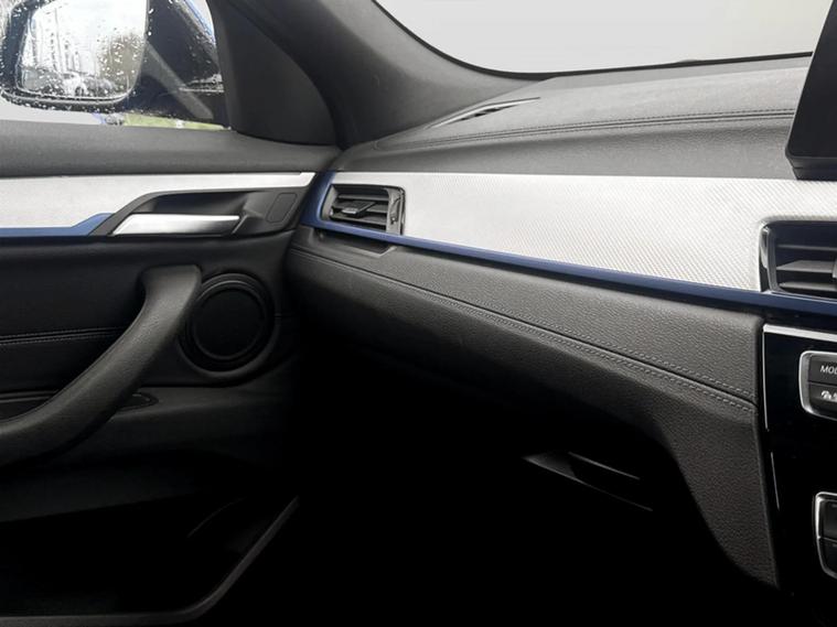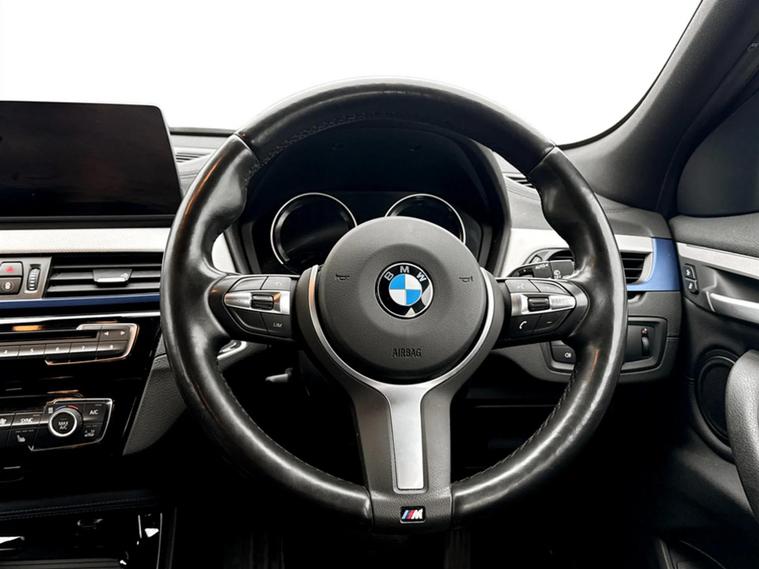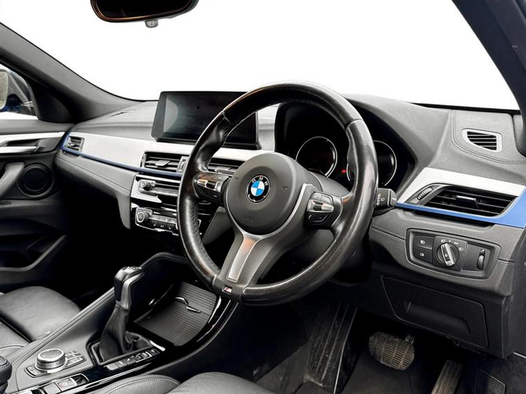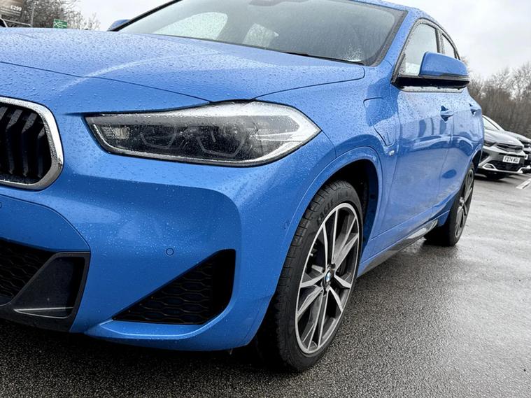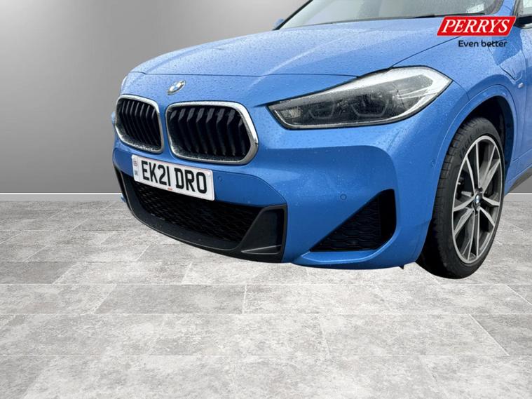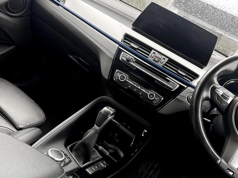 Discover this 2021 BMW X2 25e M Sport, a sophisticated plug in hybrid that offers an engaging driving experience. This four wheel drive model boasts a 1.5 litre petrol plug in hybrid engine and meets Euro 6 emissions standards. Inside, you will find a luxurious Black interior with striking blue stitching on the perforated Dakota leather upholstery. Comfort is paramount, with both driver and front passenger benefiting from lumbar support, and the driver's seat featuring memory settings. This X2 M Sport comes equipped with a comprehensive Tech Pack, enhancing connectivity and convenience with Bluetooth, a Head Up Display, and wireless phone charging. The Comfort Pack ensures a pleasant journey with a heated steering wheel, while the Driver Pack includes front and rear parking sensors to aid manoeuvrability. These carefully selected features demonstrate how this BMW X2 is designed to offer a superior level of refinement and technology compared to other vehicles in its class.