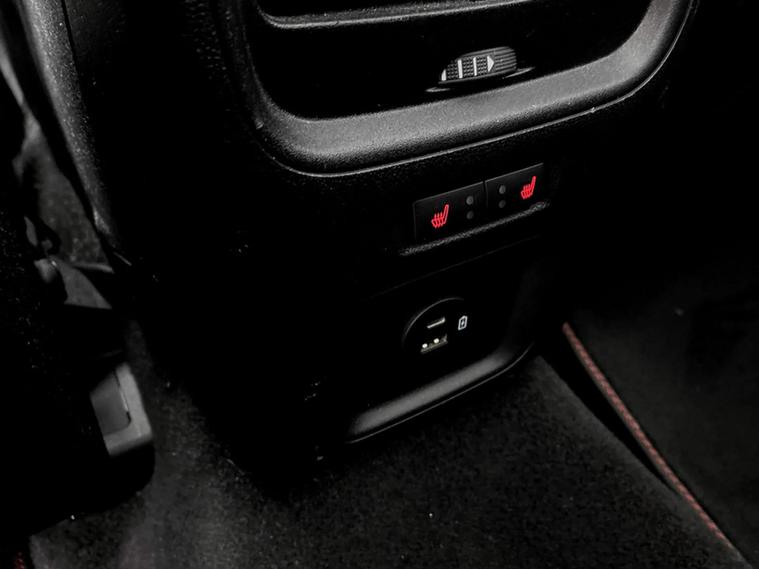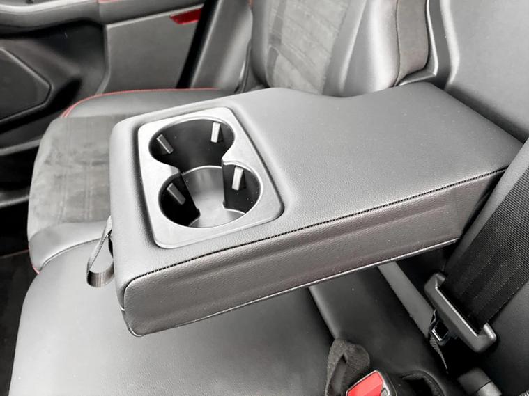 - Partial premium touch sensico leather upholstery with black cloth inserts and red stitching