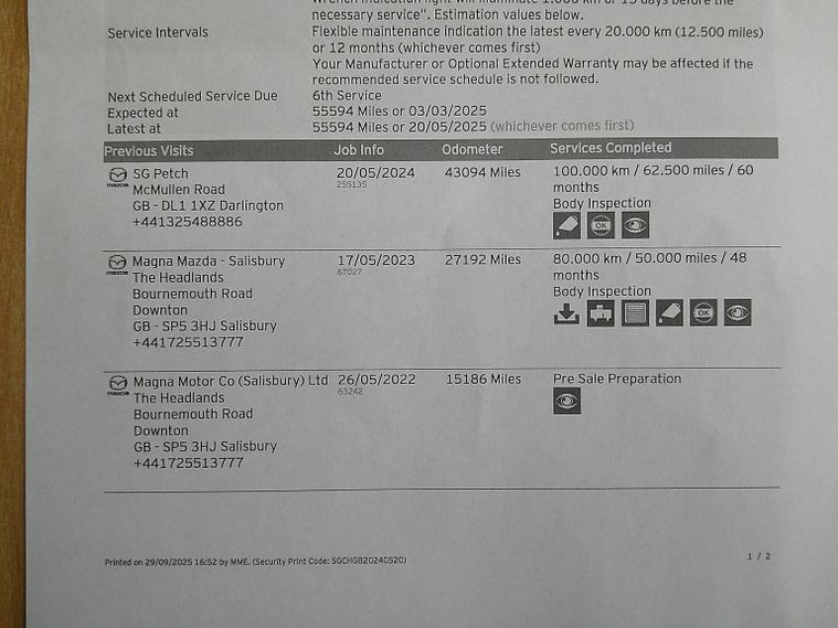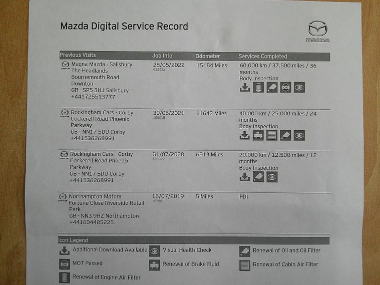 This 2019 Mazda2 SKYACTIV-G SE-L+ boasts an MOT valid until May 2026, offering you peace of mind for the road ahead. This stylish hatchback is equipped with a responsive 1.5L petrol engine and meets Euro 6 emissions standards, contributing to its low CO2 emissions. The SE-L+ trim level includes an integrated Bluetooth system for seamless connectivity, climate control air conditioning for your comfort, and rear parking sensors to assist with manoeuvring. Dusk sensing automatic headlights ensure visibility is always optimal. This vehicle comes with a 3 month warranty and has a partial service history, with the last service completed on 2025-05-12 at 55861 miles. The Mazda2 SKYACTIV-G SE-L+ stands out with its combination of practical features and efficient performance. Its low CO2 emissions highlight its environmental consideration compared to many other vehicles in its class. The inclusion of climate control, Bluetooth, and automatic headlights are features that enhance the driving experience, making this Mazda2 a well rounded choice for everyday use. Specification, 15in Alloy Wheels, ABS - Anti Lock Braking System, AM-FM Radio - Single CD Player-MP3 Audio System with 4 Speakers, AUX and USB Input, Air Conditioning - Climate Control, Analogue Speedometer, Courtesy Light with Integrated Spotlight, Cruise Control with Adjustable Speed Limiter, Dashboard Panel - Black Gloss, Door Mirrors - Electrically Adjustable - Heated - Power Folding with Integrated Indicator Lights, Door Pockets - Driver and Front Passenger, Dual Front Airbags, Dusk Sensing Automatic Headlights, Dynamic Stability Control - DSC - with Traction Control System - TCS, Electric Windows - Front and Rear with One Touch Auto Up and Down on Drivers Side, Electronic Power Assisted Steering, Emergency Stop Signalling System - ESS, Engine Start-Stop Button, Front Fog Lights - LED, Front Passenger Airbag Cut-Off Switch, Front Passenger Seat - Manual Height Adjustment, Front Passengers Seat - Manual Slide and Recline Adjustment, Front Side Airbags, Front and Rear Curtain Airbags, G-Vectoring, Gear Knob - Leather, Gear Shift Indicator, Glovebox, Grab Handles - Front Passenger and Two Rear with Coat Hooks, Halogen Daytime Running Lights, Handbrake - Leather Wrapped, Headlights - Coming-Leaving Home, Headlights - Halogen with Manual Headlight Levelling, Hill Hold Assist, ISOFIX Child Seat Anchorage - Attached to Outer Rear Seats, Integrated Bluetooth System, Luggage Compartment - Light, Rain-Sensing Front Wipers, Rear Parking Sensors, Remote Central Locking with Deadlocking, SRS - Supplementary Restraint System, Seatback Pocket - Front Passenger, Seatbelt - Reminder Screen - Driver - Passenger and Rear Seats with Audible Warning, Seatbelts - Front - 3 Point - ELR x 2 with Pre-Tensioners, Seatbelts - Rear - 3-point - ELR x 2 with Pre-tensioners, Seats - 60-40 Split Folding Rear, Seats - Drivers Manual Slide-Recline and Height Adjustment, Self-Supporting Rigid and Torsion-Resistant All-Steel Body with Defined Crush Zones for the Front and Rear Sections - Stable Passenger Safety Cell with Side Impact Reinforcement in the Doors, Steering Wheel - Leather, Steering Wheel - Mounted Remote Audio Controls, Steering Wheel - Telescopic and Tilt Adjust, Sunvisors - Drivers and Front Passengers with Covered Vanity Mirror and Drivers Ticket Holder, Thatcham Category 1 Alarm and Immobiliser, Three Height Adjustable Rear Head Restraints, Trip Computer, Tyre Pressure Monitoring System, Tyre Repair Kit, Wipers - Front Adjustable Speed with Intermittent, Wipers - Rear Adjustable Speed with Intermittent, i-Stop Status