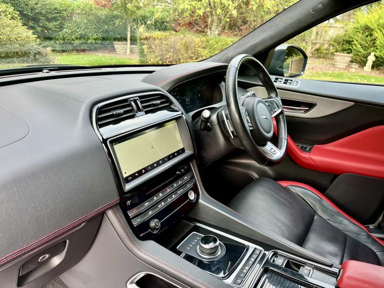 THIS STUNNING FULLY LOADED JAGUAR F-PACE 3.0 D300 V6 S AUTO COMES WITH AN AMZING SPEC WITH OVER 8K OF FACTORY ECTRAS, INCLUDING A PANORAMIC SUNROOF, RED AND BLACK LEATHER SEATS, 22 ALLOY WHEELS AND A SURROUND CAMERA SYSTEM. IT COMES WITH FULL SERVICE HISTORY, SERVICED 7 TIMES IN TOTAL, INCLUDING JUST FULLY SERVICED AND MOTD. WE HAVE ALSO REPLACED THE CAMBELT AS PART OF THE SERVICE. Full service history, Excellent bodywork, Multicolour Full leather interior - Excellent Condition, Four wheel-drive, 5 seats, Santorini Black - metallic, 3 owners, Upgrades - 22in Alloy Wheels - 15 Spoke Style 1020 with Silver Finish and Contrast Inserts, Privacy Glass, Sliding Panoramic Roof, Surround Camera System, Cabin Pre-Conditioning with Remote, Interactive Driver Display, Metallic Paint705, Garage Door Opener - HomeLink, 4-Way Electric Lumbar Adjust, Heated Steering Wheel, Gloss Black Grille with Gloss Black Surround, S rear bumper with corner in body colour and diffuser in Gloss Black, Auto-dimming, power fold, heated door mirrors with memory and approach lights, Loadspace Safety Partition Net210, Illuminated metal loadspace scuff plate150, Perforated Grained Leather - Ebony-Pimento Duotone, Standard Features - 10-Way Electric Front Seats, 2-Zone Climate Control, 20in Alloy Wheels - 5 Spoke Style 5035 with Grey Diamond Turned Finish, 3-Flash Lane Change Indicators, 350mm Front Brakes, 40-20-40 Split Fold Rear Seat, 5in Display with Instrument Panel, ABS - Anti-locking Braking System, AEB - Autonomous Emergency Braking, ASPC - All Surface Progress Control, Adaptive Dynamics, Airbags - Front Side, Airbags - Full Length Side Window Curtain, Ambient Interior Lighting, Approach Illumination, Auto-Dimming - Power Fold - Heated Door Mirrors with Approach Lights, Auto-Dimming Interior Rear View Mirror, Bluetooth Audio Streaming, Bluetooth Telephone Connectivity, Brake Pad Wear Indicator, Bright Metal Pedals, Centre Console - Side Stowage, Centre Console - Storage Surround Finishers - Satin Chrome, Centre Console with Armrest, Configurable Dynamics, Cruise Control with Speed Limiter, Digital Audio Broadcast - DAB - Radio, Door Mirrors - Body Coloured, Door Trim - Luxtec, Dual Tailpipes with 84mm Finishers, Dynamic Stability Control and Traction Control, Dynamic Volume Control, EBA - Emergency Brake Assist, ECO Driving Style Assistant, EPAS - Electric Power Assisted Steering, EPB - Electronic Parking Brake - Drive Away Release, Ebony Morzine Headlining, Electric Windows - Front and Rear with One-Touch Open-Close and Anti-Trap, Front Airbags with Passenger Seat Occupant Detector, Front Fog Lights, Front Headrests - S Branded Embossing, Front Parking Aid, Gloss Black Roof Rails, Gloss Black Side Window Surround, Grained Black Radiator Grille with Satin Chrome Surround, Green Tinted Glass, Hazard Lights Under Heavy Braking, Heated Front Seats, Heated Front Windscreen, Heated Rear Window, Hill Launch Assist, Hook in Loadspace, ISOFIX Rear, InControl Apps, Interior Front Door Handles with Separate Locking Switches, Jaguar Script and Leaper, Jaguar Tyre Repair System, JaguarDrive Control, Keyless Entry, LED Tail Lights, Lane Departure Warning, Loadbay - Luggage Tie Downs, Lockable Glovebox with Jaguar Script Finisher, Luxtec Wrapped Instrument Panel Topper, Manually Adjustable Steering Column, Meridian Sound System - 380W, Meshed Aluminium Trim Finisher, Metal Treadplates with S Branding, Navigation System, Outside Temperature Gauge, Overhead Lighting Console, Passive Front Head Restraints, Perimeter Alarm, Power Boot Lid, Power Operated Child Locks, Power Sockets, Power Tailgate, Premium Carpet Mats, Protect for Warranty Period, Push Button Start, Rain Sensing Windscreen Wipers, Rear Air Vents, Rear Armrest with Twin Cupholders, Rear F-Pace Badge, Rear Fog Lights, Rear Parking Aid, Rear View Camera, Red Brake Calipers, Remote Premium for Warranty Period, Reversible Boot Floor - Carpet-Rubber, S Badge Front and S AWD Badge Rear, S Body Kit, S Branded Soft