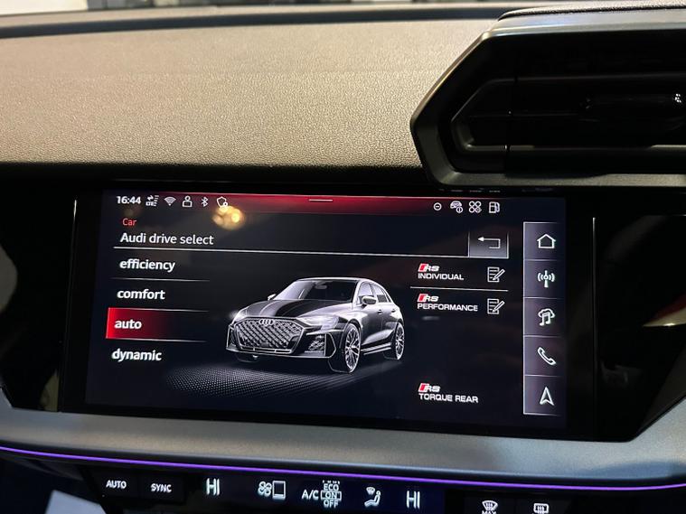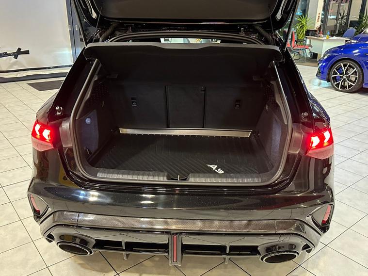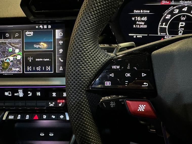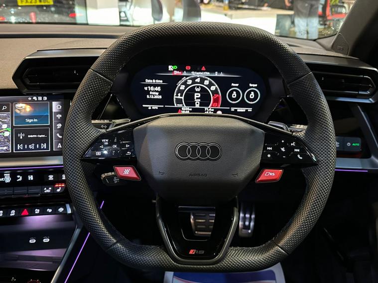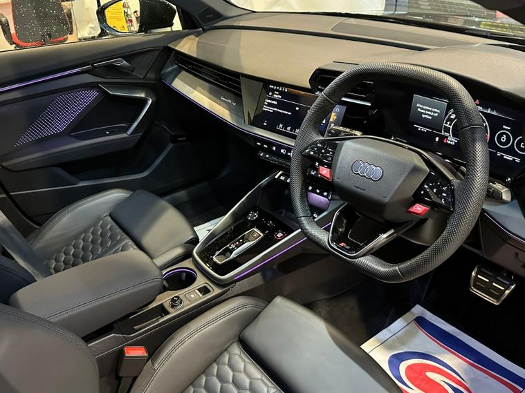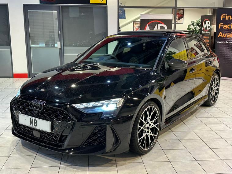 This striking 2025 Audi RS3 2.5 TFSI Carbon Vo sprung stands out with its aggressive styling, premium black finish, and a host of high-end performance and comfort features. Powered by Audis renowned 2.5-litre five-cylinder engine, it delivers thrilling acceleration, a sporty exhaust note, and exceptional grip thanks to quattro all-wheel drive. The Carbon Vo sprung specification adds sought-after enhancements including carbon-fibre exterior detailing, Matrix LED headlights, panoramic sunroof, and upgraded driver-assistance systems. Inside, the cabin blends luxury and technology with fine Napa leather RS sport seats, ambient lighting, a fully digital Virtual Cockpit, and a high-resolution MMI infotainment system with smartphone connectivity. This example benefits from adaptive suspension, RS Drive Select modes, a premium sound system, heated seats, and advanced safety features for everyday confidence. With only two owners and presenting in excellent condition, it offers an ideal mix of performance, refinement, and everyday usability. The specification and technical details in this advert are pulled through from a third-party source. MB Motor Group therefore cannot guarantee or warrant the accuracy of this information. We therefore kindly ask customers to check the specification of their chosen car to ensure it meets all of their requirements prior to purchase.