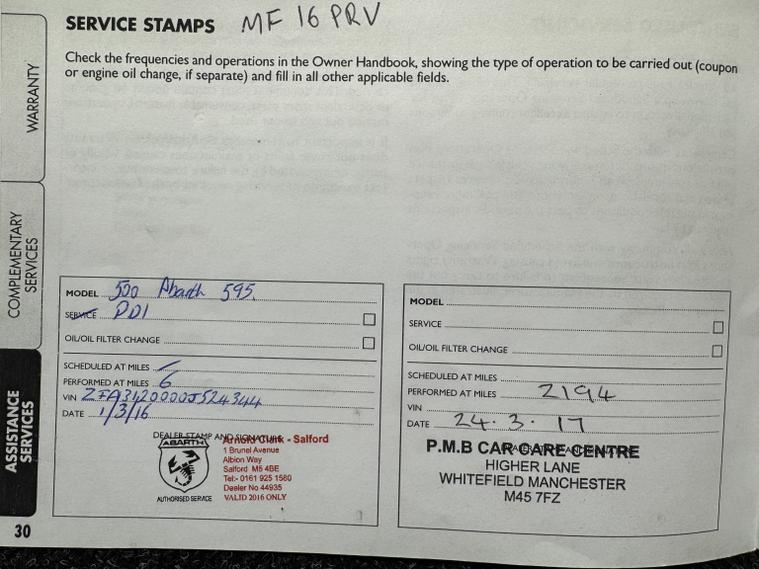 Peak Performance Cars are a family-run business with over 35 years experience in the motor trade. We are proud of our reputation for quality and customer care. Please read our Google reviews and purchase with complete confidence. We are also an AA Approved Dealership. Fiat 595 Abarth Turismo, Techno House Grey | MF16PRV, We are delighted to offer this sought after Pocket Rocket, finished in the striking Techno House Greypaintwork with contrasting Red Full Leather racing Seats, a fantastic colour combination. It has only had the 2 Owners from new and you can tell its been truely loved as it really is a beauty, Powered by the punchy 1.4 Turbo petrol engine, this car delivers great performance, so much fun to drive, you wont be able to stop smiling. Condition & History, New Cambelt and Water Pump being fitted 3rd March 2026, 72, 033 miles from new, Full Service History - serviced annually since new, Last serviced: November 2025 at 71, 794 miles, Presented in excellent condition and a real credit to its previous owner, Specification Highlights, Red Full Leather sports seats, Air conditioning, Digital Climate Control, Flat-bottom multifunction steering wheel, Bluetooth hands-free system, Sports Mode, Boost Gauge, Rear parking sensors, 17 Alloy Wheels, Electric windows, Electrically adjustable & heated mirrors, AUX & USB connectivity, Traction control, Plus much more, All manuals and documentation present, x2 keys, 3 months warranty, 12 months AA breakdown cover, MOT valid until 07/11/2026, Indoor showroom, Walk-around video available, VIEWINGS STRICTLY BY APPOINTMENT ONLY, Contact Mark: 01562211479, Peak Performance Cars have been supplying hand-selected quality vehicles since 1999. We pride ourselves on our attention to detail and exceptional customer service. Payments accepted via bank transfer and all major debit & credit cards. Vehicle registered: 01/03/2016