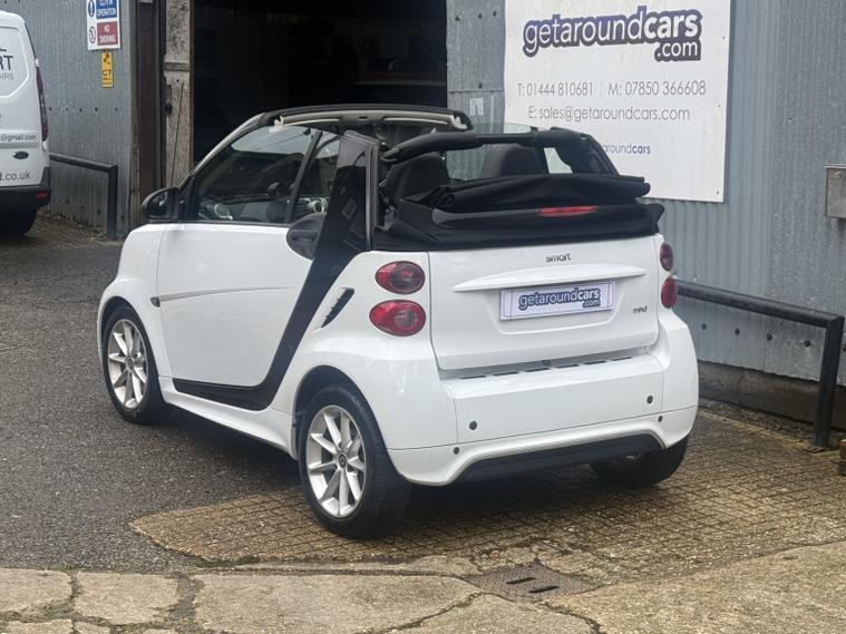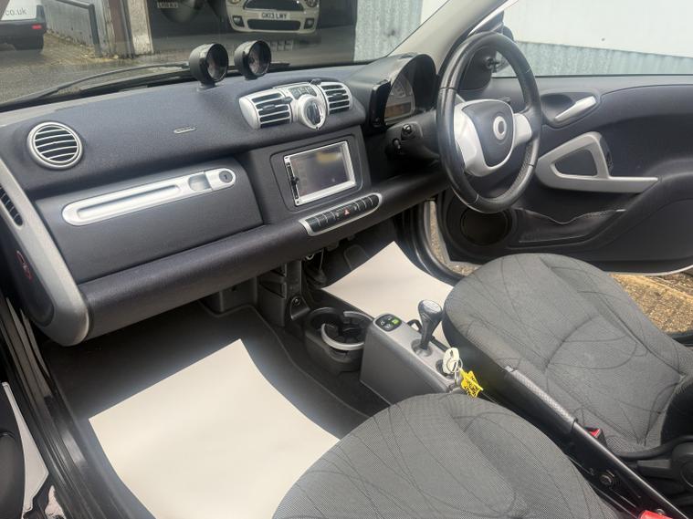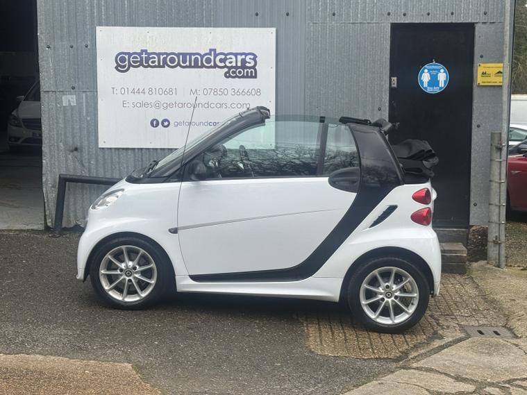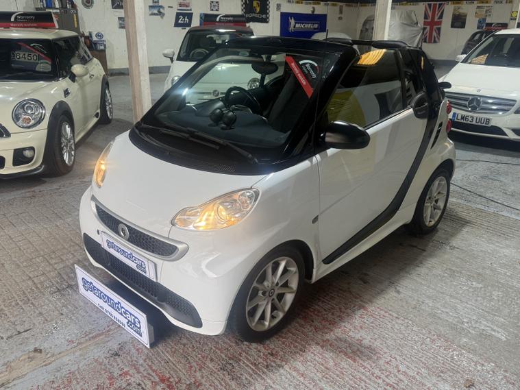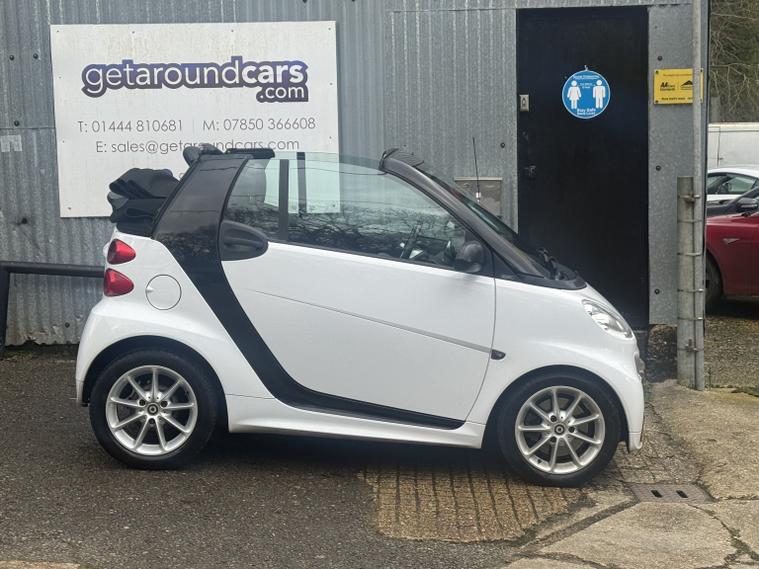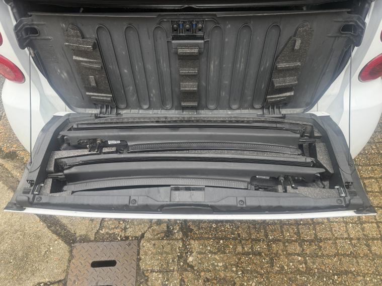 getaround in this ultimate small city car. This automatic Smart Fortwo Passion looks good finished in white with contrasting dark cloth interior and black electric folding canvas roof. It has a good spec that includes electric windows, full screen colour Sat-Nav, remote locking and air-conditioning. It has a comprehensive service history and a long MOT. It comes with the owners book pack, stamped service booklet, service receipts, and two keys. Phone, text or email for am appointment to view this sought after ulez compliant automatic convertible soon.