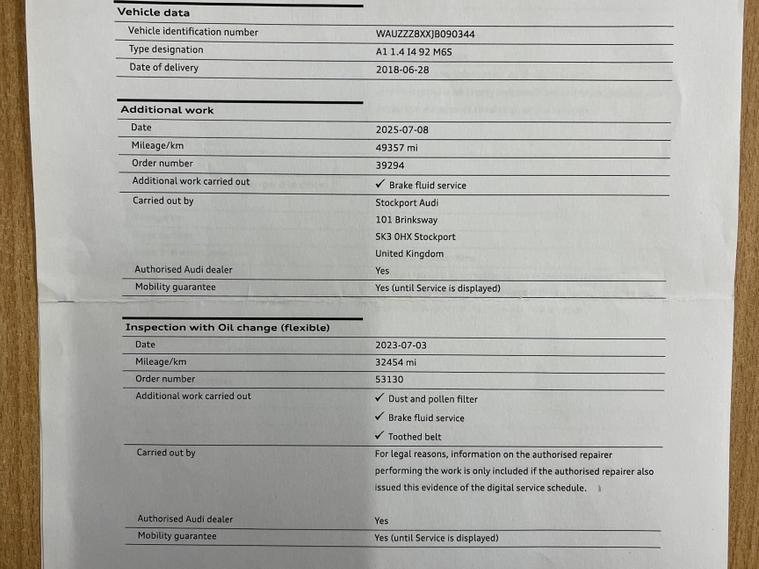 This 2018 Audi A1 TFSI S line boasts a full service history and a clear vehicle history check, ensuring complete peace of mind for its next owner. This stylish hatchback, registered in 2018, features a 1.4 litre petrol engine and meets Euro 6 emissions standards. With only 50, 200 miles on the clock, it is considered low mileage for its age. Provenance information is further bolstered by a 12 month MOT provided on purchase, and the last service was completed on 2025-07-08 at 49, 357 miles. Inside, youll find a leather handbrake grip and sports gear knob with aluminium trim, complemented by a manually retractable 6.5 inch MMI display screen. Other notable features include Xenon headlights and Hill Hold Assist for added convenience and safety. The Audi A1 TFSI S line offers an impressive fuel economy of 57 miles per gallon, making it an economical choice for everyday driving. Its acceleration from 0 to 62 miles per hour in just 8.8 seconds indicates a sprightly performance that sets it apart from many other vehicles in its class. This combination of efficiency and responsiveness, along with its comprehensive provenance and desirable features, makes this Audi A1 a compelling option. Standard spec, 17in Alloy Wheels - 10-Spoke Design High Gloss, AMI - Audi Music Interface, AUX-IN Socket, Acoustic Parking System - Rear, Adaptive Brake Lights, Air Conditioning, Air Vent Sleeves - High Gloss Black, Aluminium Trim for Control Switches-Glove Compartment-Door Handles-Door Sills, Anti Theft Locking Wheel Bolts, Audi Drive Select, Centre Console with Two Cup Holders and 12V Socket, Cloth Headlining in Black, Concert Radio, Connectivity Package, Cruise Control, DAB Digital Radio, Door Mirrors - Body Coloured with Integrated Indicators, Door Mirrors - Electrically Adjustable and Heated, Door Sill Trims - Aluminium with S Line Logo, Driver - Front Passenger - Front Side and Head Airbag System, Driver and Front Passenger Seats with Manual Height-Forwards and Backwards Adjustment, Drivers Information System - DIS, ESC - Electronic Stabilisation Control, Electric Windows - Front, Electromechanical Power Steering, First Aid Kit, Front Floor Mats, Front Fog Lights, Front Passenger Airbag Deactivation Switch, Glovebox - Illuminated, Head Restraints - Rear, Heat Insulating Glass - Windscreen and Side Windows, Heated Rear Windscreen, ISOFIX Child Seat Mounting, LED Interior Light Package, LED Rear Lights, Manually Adjustable Lumbar Support in Front Seats, Mobile Telephone Preparation - Bluetooth Interface, Polished Tailpipes, Rear Fog Lights, Remote Central Locking with 2 Fold Away Keys, S Line Badges on the Front Wings, S Line Body Styling, S Line Roof Spoiler, S Line Sports Suspension, SD Card Reader, Satellite Navigation System - SD Card Based, Seat Belt Height Adjustment for Front Seats, Seat Belt Monitoring, Seats - Front Easy Entry, Secondary Collision Brake Assist, Split Folding Rear Seat, Steering Wheel - 3-Spoke Leather - Multi-function - Sports, Steering Wheel - Height and Reach Adjustable, Thatcham Category 1 Alarm and Immobiliser, Tool Kit and Car Jack, Tyre Pressure Monitoring System, Tyre Repair Kit, Warning Triangle, Washer Fluid Level Indicator