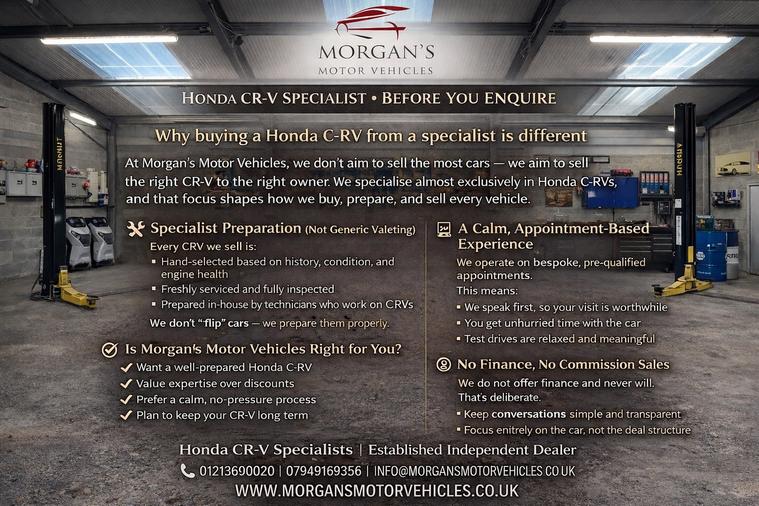 THE CAR, This well-presented Honda CR-V has covered just 104, 912 miles from new and has clearly been well maintained. It is supplied with its original service history booklet and with the next service completed by ourselves prior to handover. Every vehicle at Morgans Motor Vehicles undergoes our MMV preparation process, including a pre-MOT check of lights and levels, fresh fully synthetic Valvoline 5W30 engine oil, new oil filter, air filter, fuel filter (diesel models) and pollen filter (where applicable). Our uploaded inspection report confirms quality tyres across both axles (7.2mm front / 3.8 mm rear) and strong brakes (90% front / 80% rear remaining) with discs in healthy condition. At collection, we personally guide you through the V5 transfer and taxation process to ensure a smooth and straightforward handover. The vehicle is supplied with our 6-month MMV warranty (unlimited mileage) covering engine, gearbox, starter motor and alternator, with upgrade options available if desired. We operate strictly on an appointment-only basis and believe vehicles should be viewed and inspected in person prior to purchase. If you value careful preparation, transparency and specialist Honda knowledge, this CR-V will not disappoint. Please call Morgan your Honda specialist. At Morgans Motor Vehicles, we do things properly. A relaxed, appointment only environment with no pressure, no pushy targets, Specialist Honda knowledge with carefully selected cars, prepared to a high standard, A premium, personal experience allowing proper time and proper attention. What you can expect from us:, No rushed appointments, Transparent history and clear communication, AA Dealer Promise (where applicable):, Annual service, Full inspection report, New MOT if less than 7 months remaining, 12 months AA roadside assistance