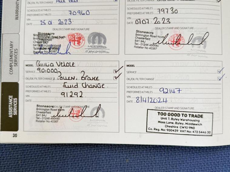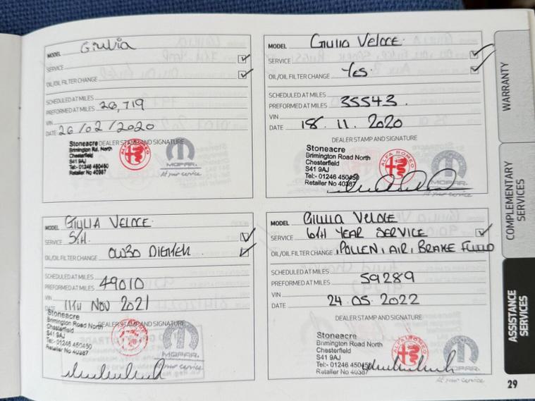 This 2017 Alfa Romeo Giulia T Veloce is presented with a clear vehicle history check , Almost Full Alfa service history up to 90000 and a 12 month MOT provided on purchase, offering peace of mind. This stylish saloon features a 2.0L petrol engine and meets Euro 6 emissions standards. Inside, youll find comfortable heated front seats and a heated steering wheel for those colder journeys. The Alfa Connect 3D Nav 8.8in infotainment system with Bluetooth keeps you connected and entertained, while Bi-Xenon headlamps with LED DRLs ensure excellent visibility. Front and rear parking sensors make manoeuvring effortless. Experience impressive performance with this Giulia, capable of accelerating from 0-62mph in just 5.7 seconds, a figure that demonstrates its dynamic capabilities compared to many other vehicles in its class. Furthermore, its fuel economy is noteworthy, achieving up to 46 mpg, which highlights its efficiency. This particular model comes with a 3 month warranty and has a partial service history, with a clear vehicle history check confirming its good provenance. We are an independent dealer based in Studley Warwickshire just 10 minutes from Junction 3 of the M42 . We have over 25 years experience and pride ourselves on our customer service. DRIVE AWAY INSURANCE AVAILABLE , Most of our cars are sourced from Main dealers and NOT Auctions , ALL vehicles come with a comprehensive warranty which includes roadside assistance , Credit /Debit cards accepted, delivery available and booking an appointment is advised .