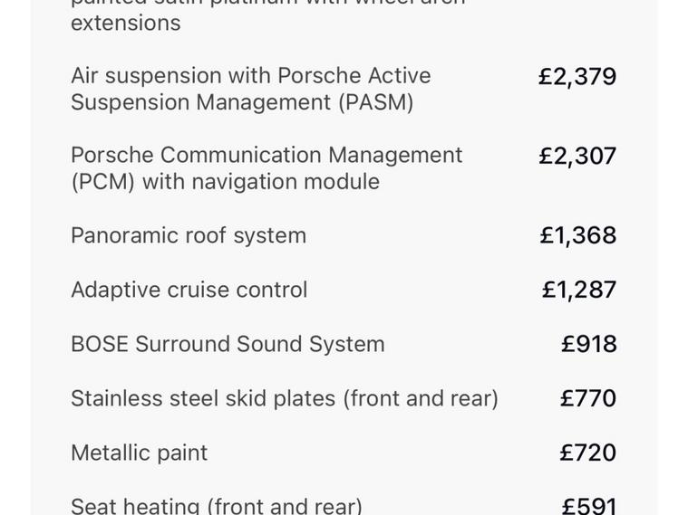 2016 Porsche Cayenne S 4.2 V8 Diesel Huge Spec | 18k Options | 67k Miles, A superb example of the highly sought-after Cayenne S Diesel, finished with an exceptional factory specification totalling nearly 18, 000 of options. Combining Porsche performance with everyday usability, this 4.2 V8 delivers effortless power, refinement, and practicality. , Key Details, 67, 000 miles from new, 4.2 V8 Diesel 385bhp, Smooth automatic transmission, 060 in ~5.4 seconds, Euro 6 compliant, , Factory Options (Nearly 18, 000), This car stands out thanks to its high-spec configuration, including:, 21-inch Cayenne Sport Classic wheels, Air suspension with PASM, Panoramic glass roof, Porsche Communication Management (PCM) with navigation, BOSE surround sound system, Adaptive cruise control, Reversing camera with ParkAssist (front & rear), Seat heating (front & rear), Metallic paint (Moonlight Blue), Stainless steel skid plates, Additional features include:, Privacy glass, Heated windscreen, Heated multifunction steering wheel, Comfort lighting package, Automatically dimming mirrors, Roof rails in matt aluminium, Tinted LED taillights, , Condition, Excellent condition throughout for its age and mileage. Clearly well cared for, with a strong road presence and premium feel expected from Porsche. , Why This Cayenne?, Finding a Cayenne S Diesel with this level of specification is rare. The combination of V8 performance, luxury options, and practicality makes it an ideal all-rounderequally at home on long motorway journeys or around town. , Summary, A high-spec, powerful and refined SUV with nearly 18k of desirable factory extrasready to be enjoyed by its next owner.