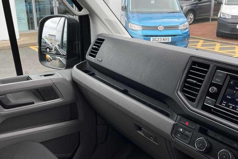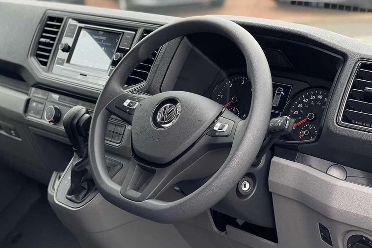 Bluetooth, Digital clock, Driver alert system, E-call + We connect basic preparation, Instrument cluster, Lights on warning buzzer, Locking fuel cap, Multi-function Display Plus, Rev counter, Service indicator, Speedometer, Voice control system, Composition media with 6.5" with we connect plus prep, 4 speaker, multifun display plus, USB, mob interface, app con, "We connect function", DAB Radio, Auto low beam mode, Leaving home function and manual coming home function, Cab doors, Convex and wide angle mirror, Driver seatbelt warning light, Electric windows, Electrically heated and adjustable door mirrors, Half painted front bumper, Heat insulating glass, Indicators in front door mirrors, One towing eye in front, Rear wing doors with 270 degree hinges, Special identification plate, Unpainted radiator grille, Air recirculation system, Ashtray, Centre console storage tray, CFCU preparation, Charcoal filter, Climatic air conditioning, Document holder on centre console, Drinks holders, Electromechanical Servotronic steering, Electronically controlled heating system, Fully adjustable suspension type driver seat, Grab handles on rear entry pillars, Height adjustable head restraints, Height and reach adjustable steering wheel, Illuminated glove compartment with lockable lid, Interior light, including 2 reading lights, Interior light, switchable by door, Jack and tool kit, Preparation for interface for external use with terminal block, Storage compartments in doors and in step, right, Storage tray on dashboard, Two 12V outlets in the cab (in the dashboard), Without rear side trim panel passenger load compartment, Non-smokers pack - Crafter, 3 point inertia reel belt on all seats, Automatic hazard light with emergency braking, Crosswind assist, Driver and front passenger airbag with front passenger airbag deactivation, Height adjustable seatbelts for outer cab seats, 1 rigid key, Anti-theft alarm with interior monitor, back up horn and tow away protect, overhead storage with two 1-DIN, reading light, SAFELOCK with 2 remote keys, Engine immobiliser, ABS, Automatic post collision braking system, EBA, EBD, EDL, ESP, Front disc brakes, HBA, Hill start assist, Parking brake - hill hold control, Start and stop system with regenerative braking, TCS, Hub cap covers,
