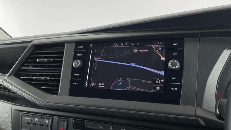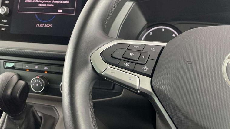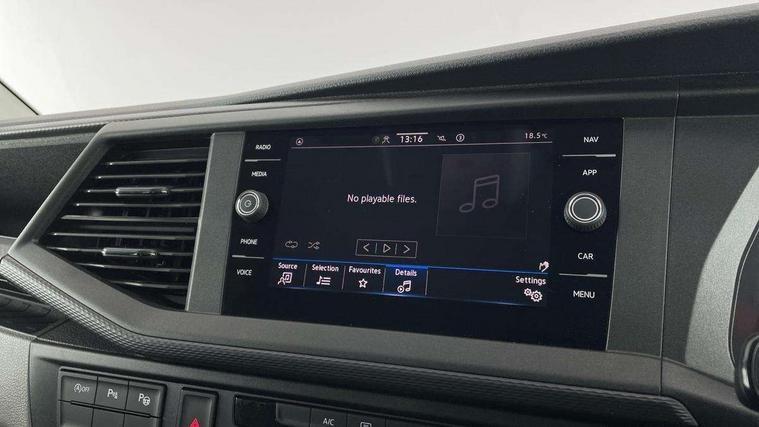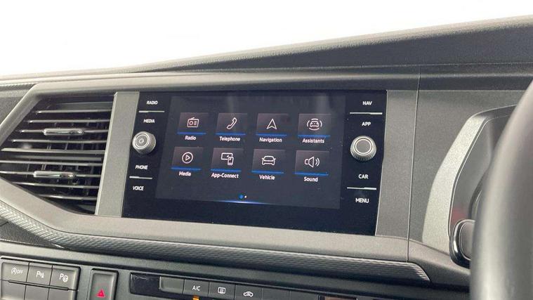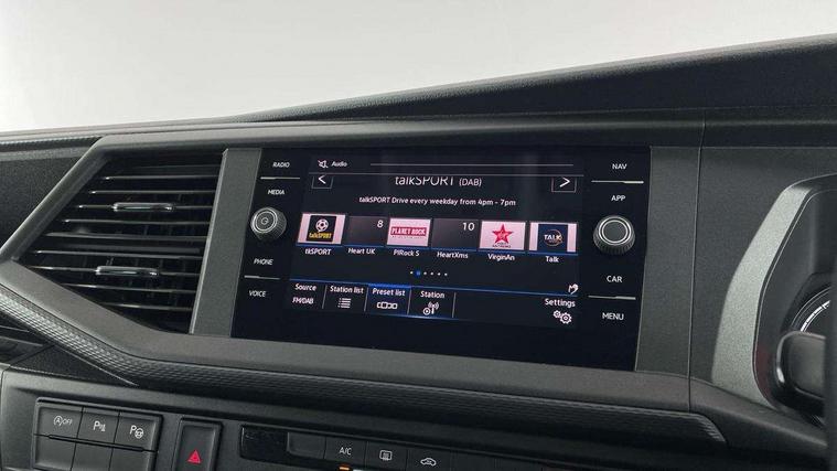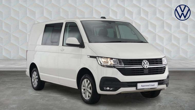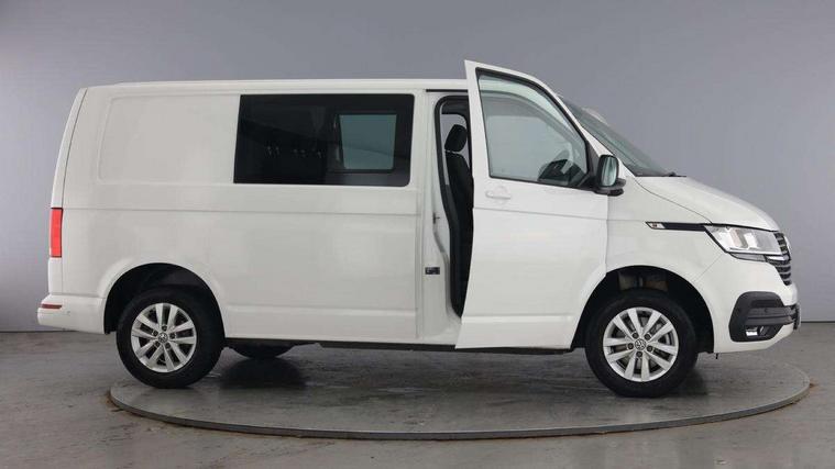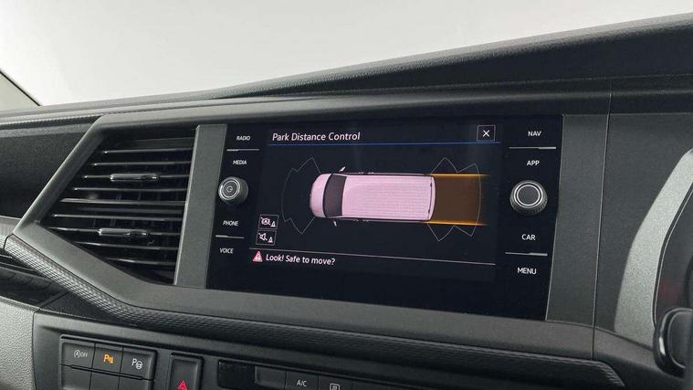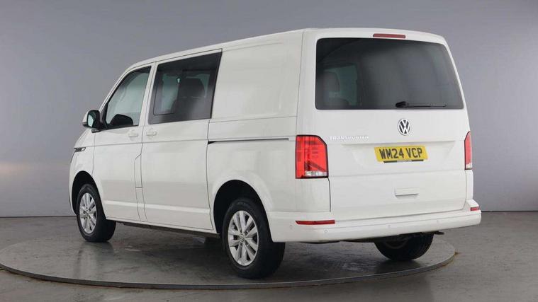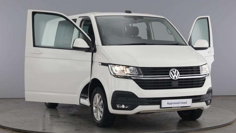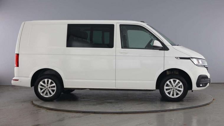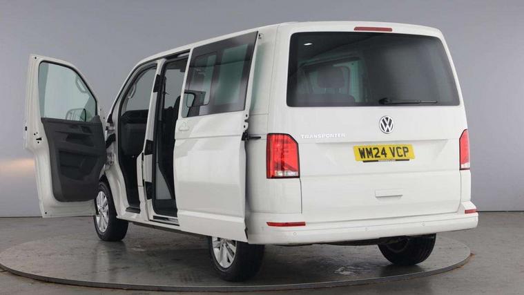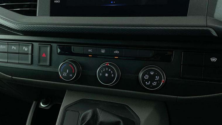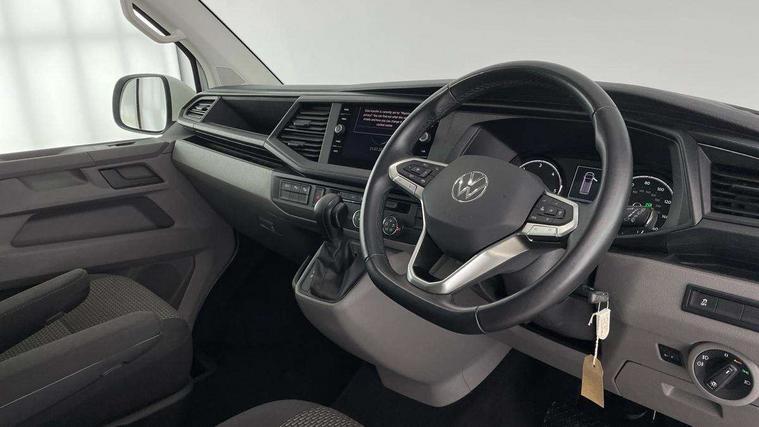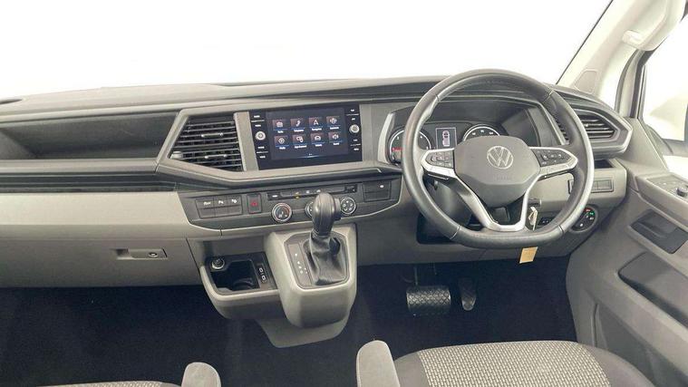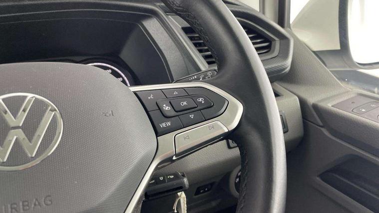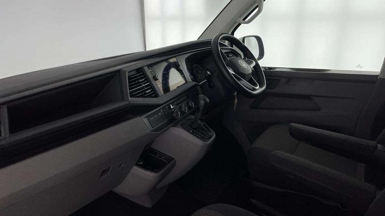 Adaptive cruise control, Child seat anchors ISOFIX and top tether in 2nd row of seats, Cross wind assist, Dimmable illuminated instruments, Driver alert with black and white multi function display plus, eCall emergency system, Forward collision warning front assist with autonomous emergency braking, Headlight range control, Mobile phone interface, Without voice control, 2 USB interfaces type C in dashboard, 4 speakers with 2 tweeters and 2 woofers, Composition colour radio with 6.5" touchscreen, Digital radio reception (DAB+), Volkswagen app connect, Automatic headlight control, leaving home and manual coming home feature, Front fog lamps with cornering light, Green heat insulating glass, Heated front windscreen, Illuminated steps in passenger/load compartment, Left convex exterior mirror, Power folding adjustable door mirrors with separately heated, Privacy glass from the B-pillar and heat-insulating glass in front, Radiator grille with 2 chrome trims, Rear window with heated insulating glass, heated rear window wiper and washer system, Right convex exterior mirror, Tailgate closing with unlatching from the inside, Transporter nameplate on the rear fender, Windshield wiper intermittent control with rain sensor for windshield wipers, Without adhesive film, 3 spoke leather wrapped multi function steering wheel, Additional sound deadening measures in cab and passenger compartment, Auto dimming breakaway interior rear view mirror, Comfort headliner in cab, hardboard roof trim in passenger and load compartment, Dust/pollen filter, Folding grab handles and storage compartments on cab seats, reading light, Front seats on the right in 1st row of seat, Glove compartment with illumination, Heavy duty tool kit and jack, Interior plastic loading edge protection, Lashing rings for load restraint system, LED Interior lighting in load and passenger compartment, Manual height adjustable and lumbar support for driver and single passenger seats, Medium height for vehicles with window aperture hardboard side trim panels in passenger/load compartment, Refrigerant R134a, Standard lower part dashboard in palladium, Without partition, Without seats in 3rd row of seats, Comfort pack - Transporter, Exterior pack without fog light- Transporter, Light and vision pack - Transporter, Non smoker pack - Transporter, 3 point height adjustable seat belts on outer seats cab with electric pretensioners, Driver and front passenger airbag with front passenger airbag deactivation, Power operated child safety lock, Warning buzzer and light for driver seat belt not fastened, Anti theft alarm system with interior monitoring in cab, backup horn and towing protection, Lockable wheel bolts, 16" chassis with 16" brake system, Additional 12V socket, Diesel particulate filter, Electronic stability control, ABS, ASR with deactivation button, hill start assist and brake assist system, Speed limiter, Start/stop system with regenerative breaking, 16" Clayton alloy wheels, Wheel trims,