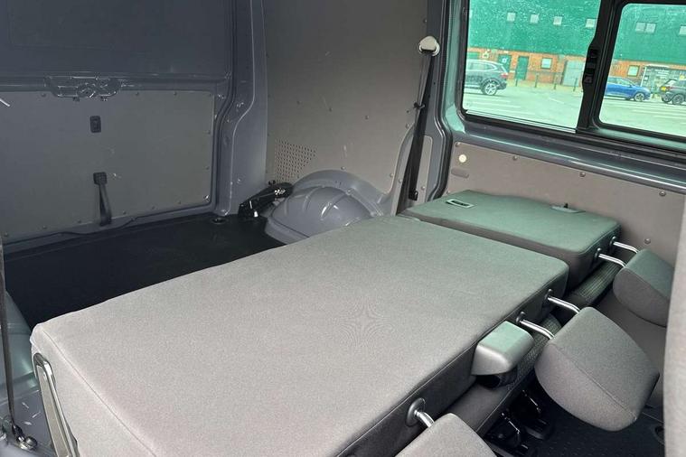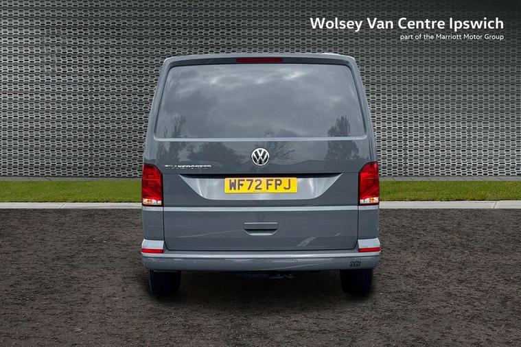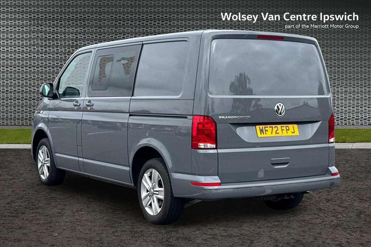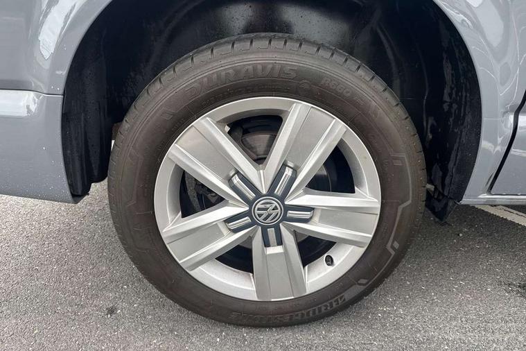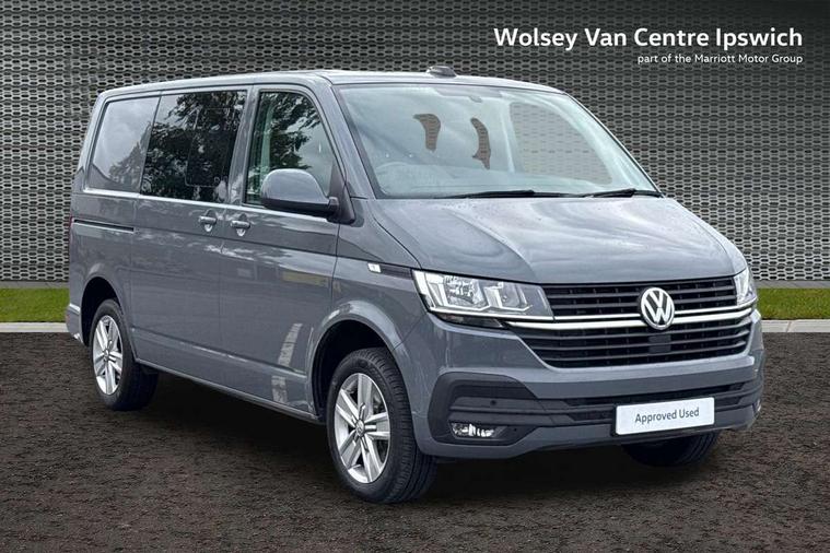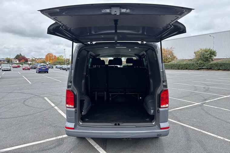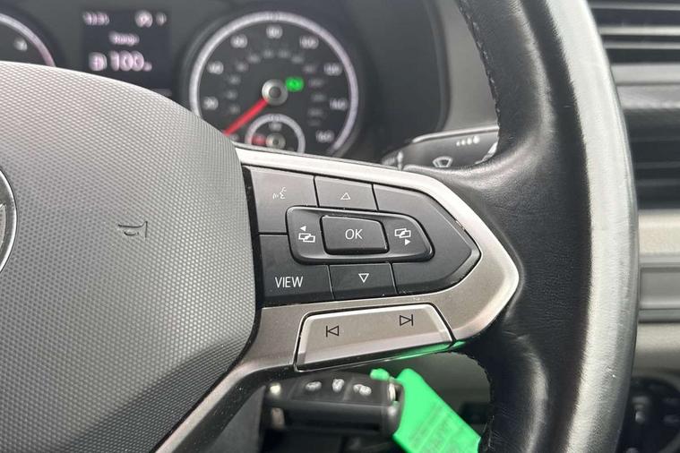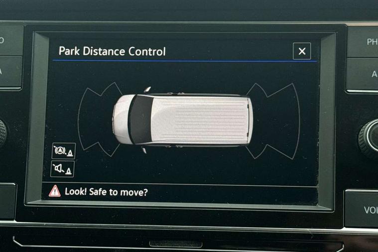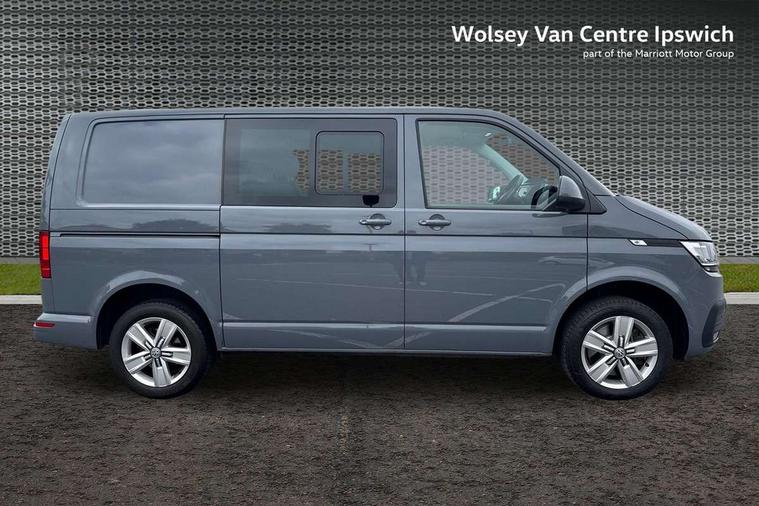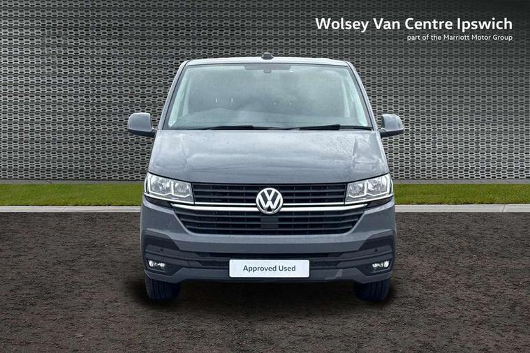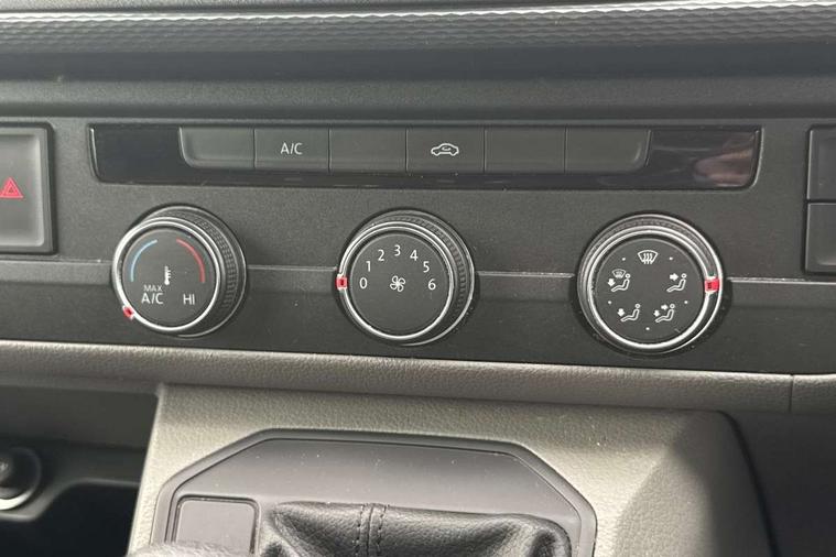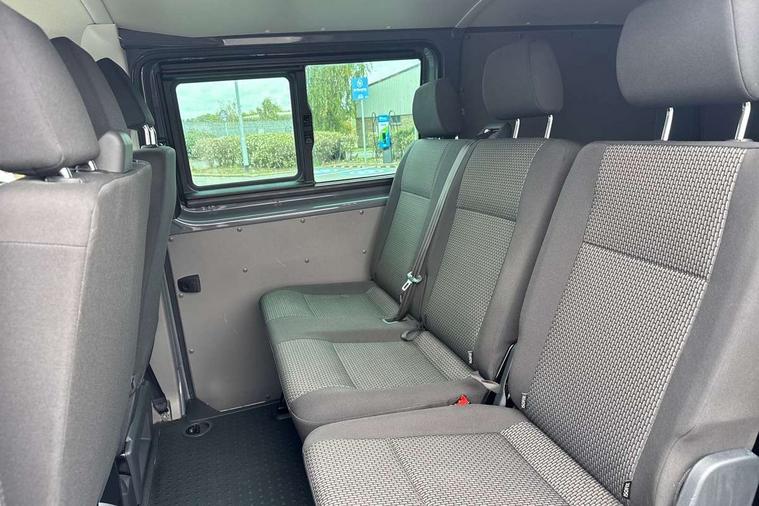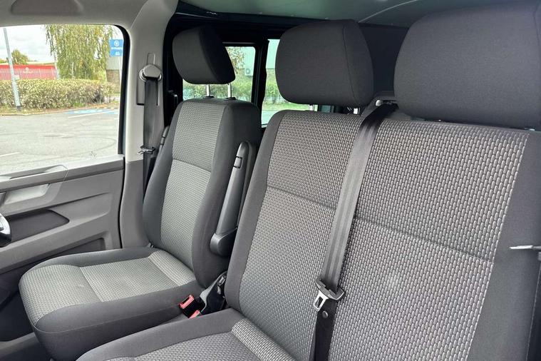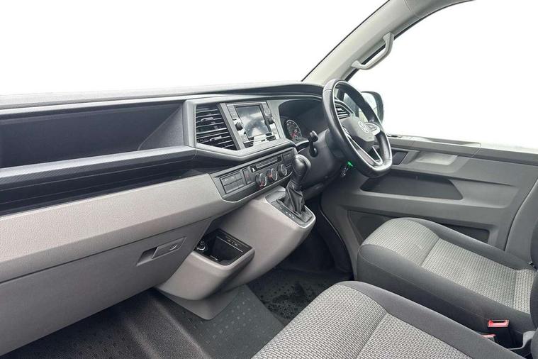 Adaptive cruise control, Child seat anchors ISOFIX and top tether in 2nd row of seats, Cross wind assist, Dimmable illuminated instruments, Driver alert with black and white multi function display plus, eCall emergency system, Forward collision warning front assist with autonomous emergency braking, Headlight range control, Mobile phone interface, Without voice control, 2 USB interfaces type C in dashboard, 4 speakers with 2 tweeters and 2 woofers, Composition colour radio with 6.5" touchscreen, Digital radio reception (DAB+), Volkswagen app connect, Automatic headlight control, leaving home and manual coming home feature, Front fog lamps with cornering light, Green heat insulating glass, Heated front windscreen, Illuminated steps in passenger/load compartment, Left convex exterior mirror, Power folding adjustable door mirrors with separately heated, Privacy glass from the B-pillar and heat-insulating glass in front, Radiator grille with 2 chrome trims, Rear window with heated insulating glass, heated rear window wiper and washer system, Right convex exterior mirror, Tailgate closing with unlatching from the inside, Transporter nameplate on the rear fender, Windshield wiper intermittent control with rain sensor for windshield wipers, Without adhesive film, 3 spoke leather wrapped multi function steering wheel, Additional sound deadening measures in cab and passenger compartment, Auto dimming breakaway interior rear view mirror, Comfort headliner in cab, hardboard roof trim in passenger and load compartment, Dust/pollen filter, Folding grab handles and storage compartments on cab seats, reading light, Front seats on the right in 1st row of seat, Glove compartment with illumination, Heavy duty tool kit and jack, Interior plastic loading edge protection, Lashing rings for load restraint system, LED Interior lighting in load and passenger compartment, Medium height for vehicles with window aperture hardboard side trim panels in passenger/load compartment, Refrigerant R134a, Standard lower part dashboard in palladium, Without partition, Without seats in 3rd row of seats, Comfort pack - Transporter, Exterior pack without fog light- Transporter, Light and vision pack - Transporter, Non smoker pack - Transporter, 3 point height adjustable seat belts on outer seats cab with electric pretensioners, Driver and front passenger airbag with front passenger airbag deactivation, Power operated child safety lock, Warning buzzer and light for driver seat belt not fastened, Anti theft alarm system with interior monitoring in cab, backup horn and towing protection, Lockable wheel bolts, 16" chassis with 16" brake system, Diesel particulate filter, Electronic stability control, ABS, ASR with deactivation button, hill start assist and brake assist system, Speed limiter, Start/stop system with regenerative breaking, 17" Devonport silver alloy wheels, Wheel trims,