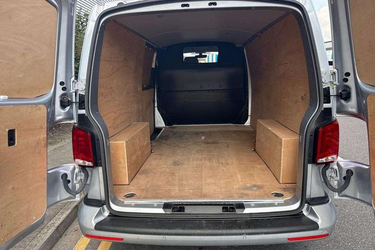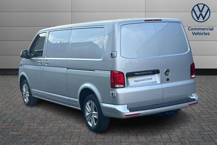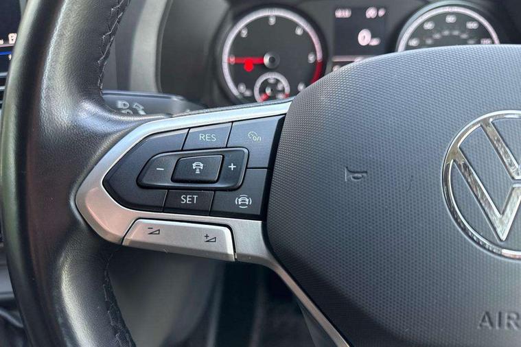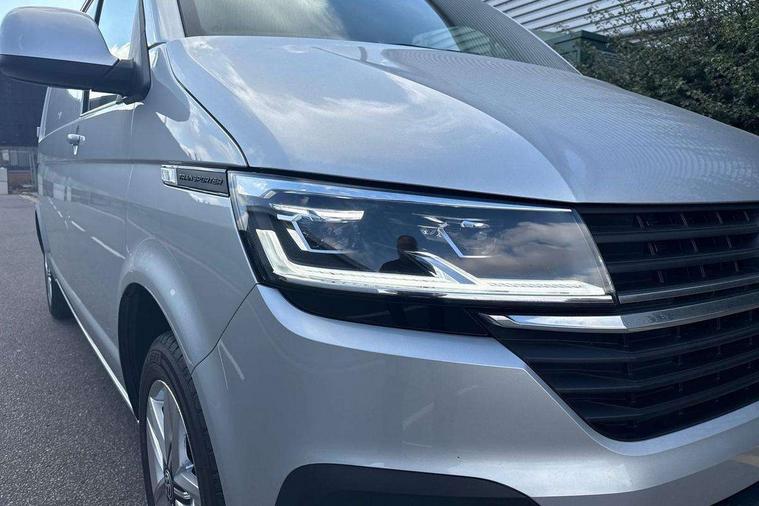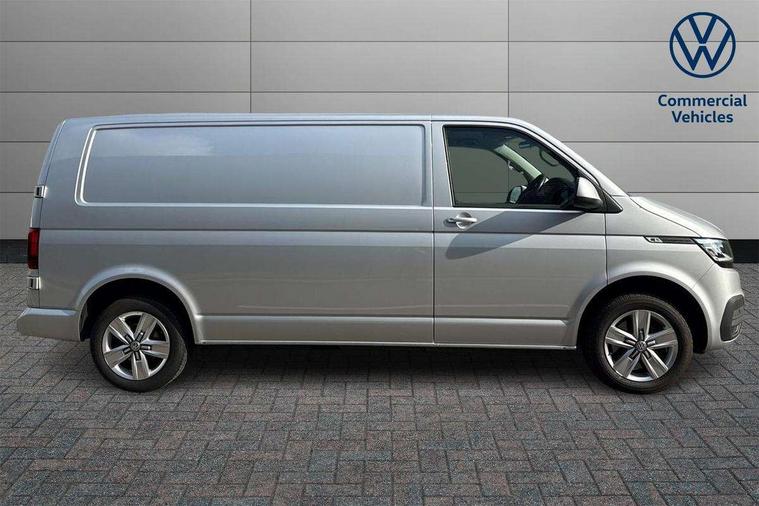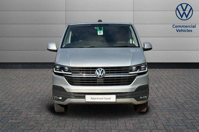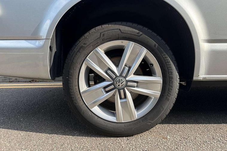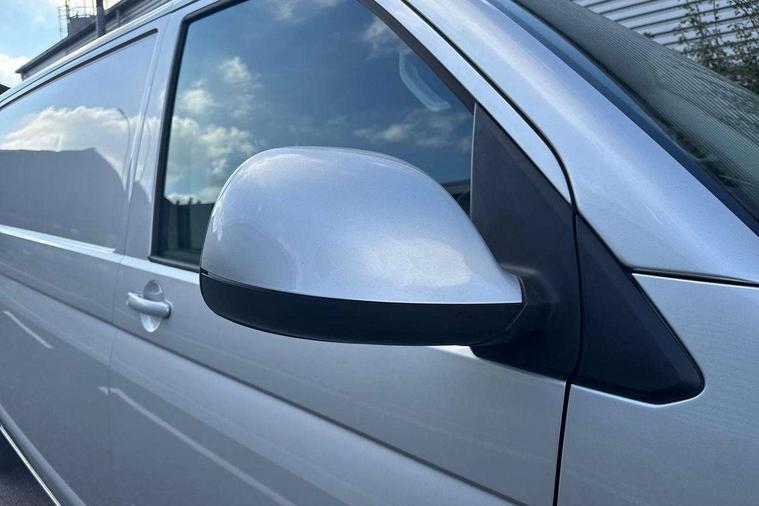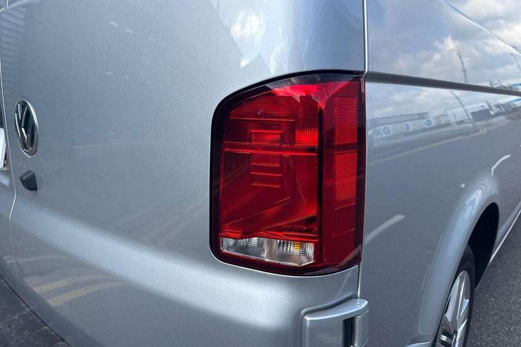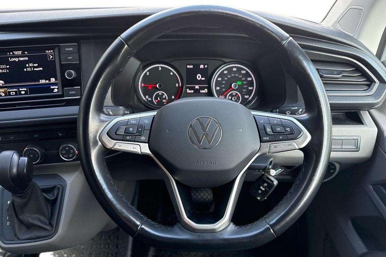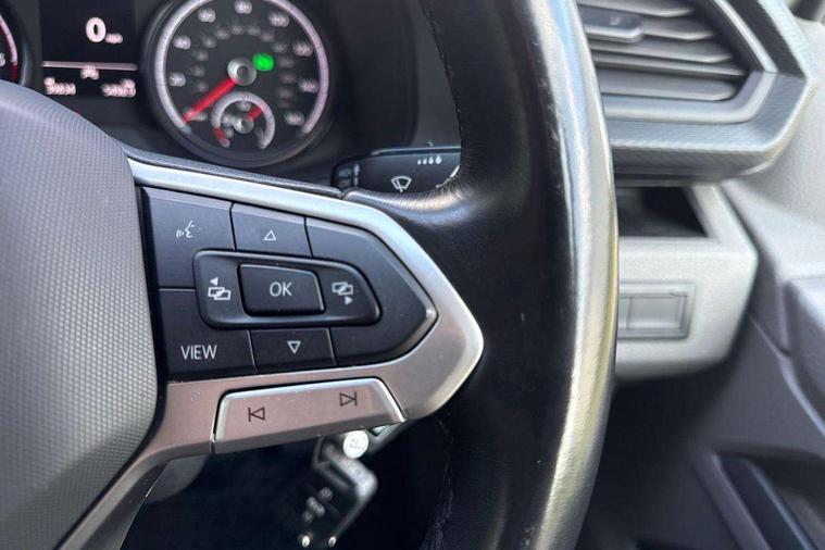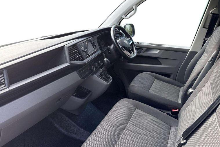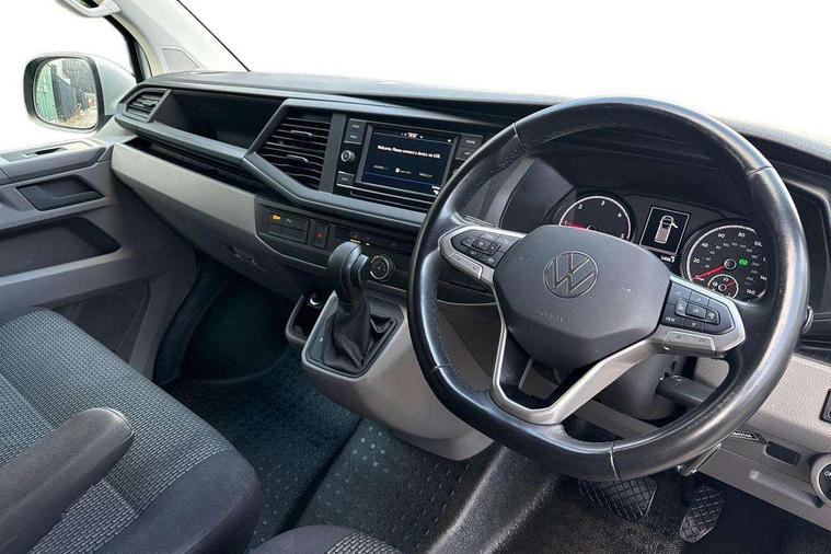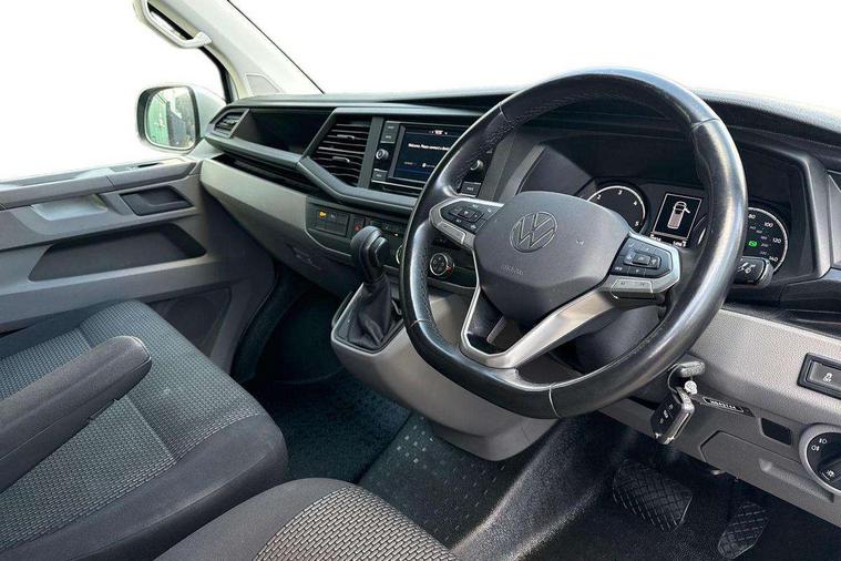 Adaptive cruise control, Cross wind assist, Dimmable illuminated instruments, Driver alert with Multi-function display plus, eCall emergency system, Forward collision warning front assist with autonomous emergency braking, Mobile phone interface, Multi function display plus with black and white display, 2 USB interfaces type C in dashboard, 4 speakers with 2 tweeters and 2 woofers, Composition colour radio with 6.5" touchscreen, Digital radio reception (DAB+), Volkswagen app connect, Automatic headlight control, leaving home and manual coming home feature, Closing rear wing door with unlatching from the inside, Front fog lamps with cornering light, Heat insulating glass (green) in cab and passenger/load compartment, Heated front windscreen, Left convex exterior mirror, Power folding adjustable door mirrors with separately heated, Radiator grille with 2 chrome trims, Rear wing doors without window apertures, Right convex exterior mirror, Transporter nameplate on the rear fender, Windshield wiper intermittent control with rain sensor for windshield wipers, 3 spoke leather wrapped multi function steering wheel, Auto dimming breakaway interior rear view mirror, Comfort headliner in cab, hardboard roof trim in passenger and load compartment, Dust/pollen filter, Front and rear left without window closed side panel in load compartment, Front seats on the right in 1st row of seat, Glove compartment with illumination, Heavy duty tool kit and jack, High partition, Interior plastic loading edge protection, LED Interior lighting in load and passenger compartment, Manual adjustable lumbar support for right single seat in 1st row seats, Refrigerant R134a, Standard lower part dashboard in palladium, Storage compartments on cab seats and reading light, Without right side window apertures in passenger and load compartment, Comfort pack - Transporter, Exterior pack without fog light- Transporter, Non smoker pack - Transporter, 3 point height adjustable seat belts on outer seats cab with electric pretensioners, Driver and front passenger airbag with front passenger airbag deactivation, Warning buzzer and light for driver and front passenger seat belt not fastened, Without child safety lock in passenger compartment, Anti theft alarm system with interior monitoring in cab, backup horn and towing protection, Lockable wheel bolts, 16" chassis with 16" brake system, Diesel particulate filter, Electronic stability control, ABS, ASR with deactivation button, hill start assist and brake assist system, Start/stop system with regenerative breaking, 17" Devonport alloy wheels,