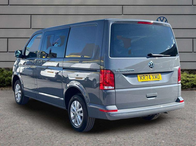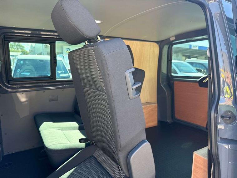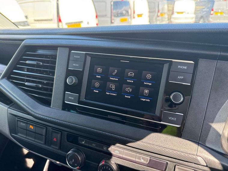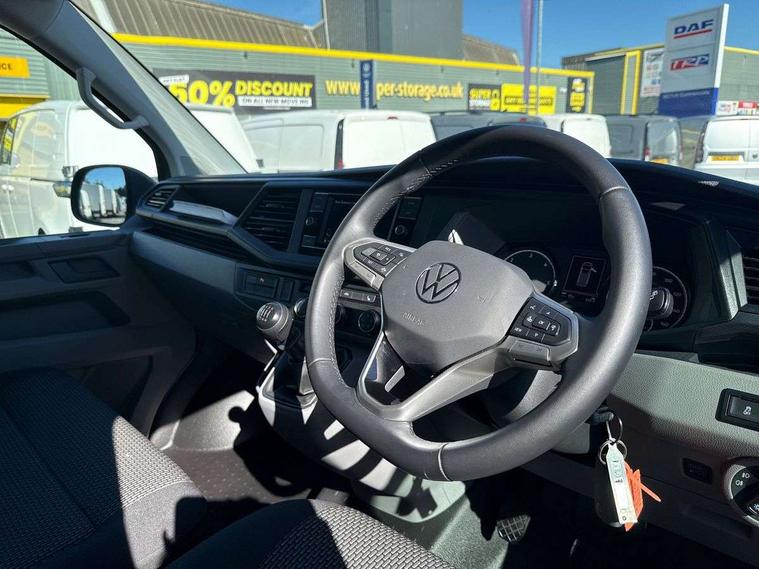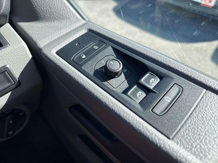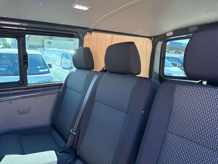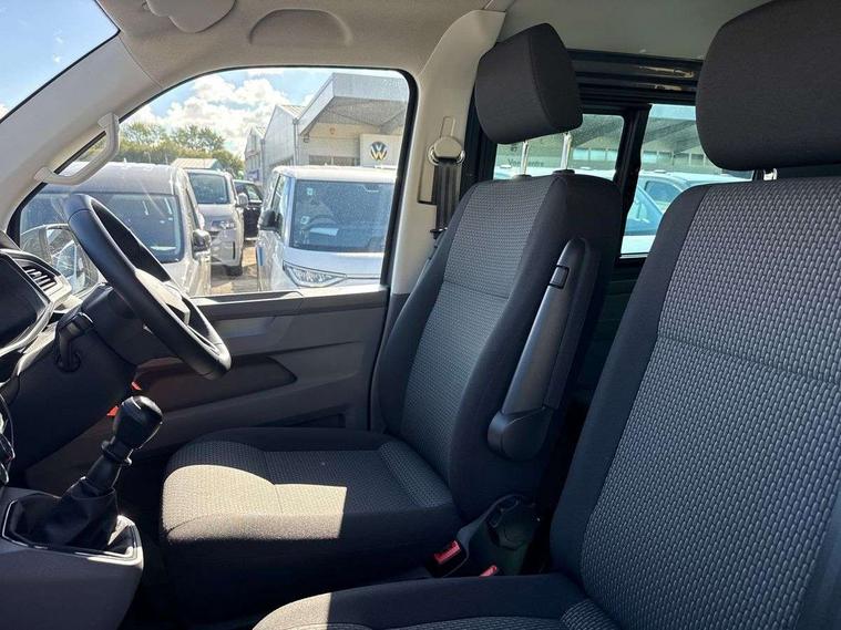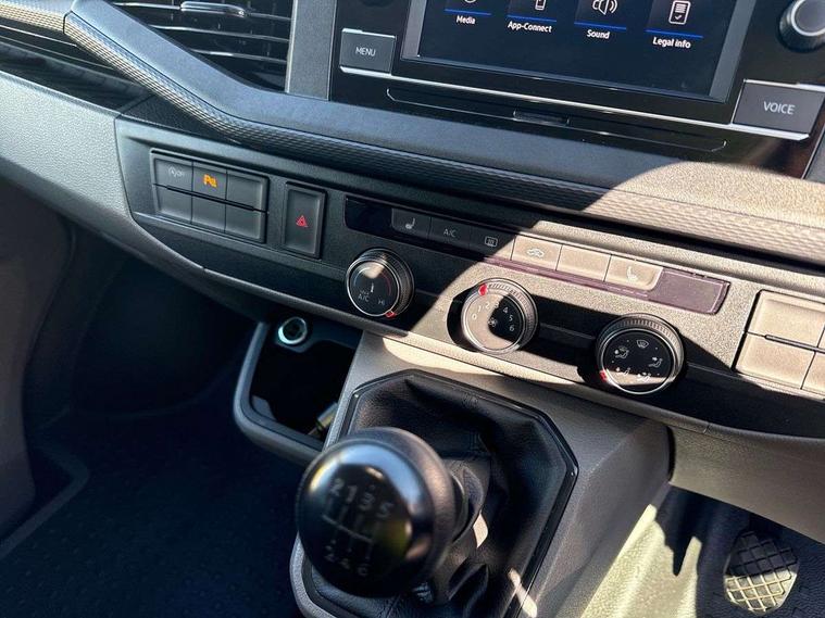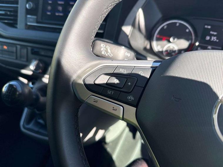 Adaptive cruise control, Child seat anchors ISOFIX and top tether in 2nd row of seats, Cross wind assist, Dimmable illuminated instruments, Driver alert with black and white multi function display plus, eCall emergency system, Forward collision warning front assist with autonomous emergency braking, Headlight range control, Mobile phone interface, Without voice control, 2 USB interfaces type C in dashboard, 4 speakers with 2 tweeters and 2 woofers, Composition colour radio with 6.5" touchscreen, Digital radio reception (DAB+), Volkswagen app connect, Automatic headlight control, leaving home and manual coming home feature, Front fog lamps with cornering light, Green heat insulating glass, Heated front windscreen, Illuminated steps in passenger/load compartment, Left convex exterior mirror, Power folding adjustable door mirrors with separately heated, Privacy glass from the B-pillar and heat-insulating glass in front, Radiator grille with 2 chrome trims, Rear window with heated insulating glass, heated rear window wiper and washer system, Right convex exterior mirror, Tailgate closing with unlatching from the inside, Transporter nameplate on the rear fender, Windshield wiper intermittent control with rain sensor for windshield wipers, Without adhesive film, 3 spoke leather wrapped multi function steering wheel, Additional sound deadening measures in cab and passenger compartment, Auto dimming breakaway interior rear view mirror, Comfort headliner in cab, hardboard roof trim in passenger and load compartment, Dust/pollen filter, Folding grab handles and storage compartments on cab seats, reading light, Front seats on the right in 1st row of seat, Glove compartment with illumination, Heavy duty tool kit and jack, Interior plastic loading edge protection, Lashing rings for load restraint system, LED Interior lighting in load and passenger compartment, Manual height adjustable and lumbar support for driver and single passenger seats, Medium height for vehicles with window aperture hardboard side trim panels in passenger/load compartment, Refrigerant R134a, Standard lower part dashboard in palladium, Without partition, Without seats in 3rd row of seats, Comfort pack - Transporter, Exterior pack without fog light- Transporter, Light and vision pack - Transporter, Non smoker pack - Transporter, 3 point height adjustable seat belts on outer seats cab with electric pretensioners, Driver and front passenger airbag with front passenger airbag deactivation, Power operated child safety lock, Warning buzzer and light for driver seat belt not fastened, Anti theft alarm system with interior monitoring in cab, backup horn and towing protection, Lockable wheel bolts, 16" chassis with 16" brake system, Additional 12V socket, Diesel particulate filter, Electronic stability control, ABS, ASR with deactivation button, hill start assist and brake assist system, Speed limiter, Start/stop system with regenerative breaking, 16" Clayton alloy wheels, Wheel trims,