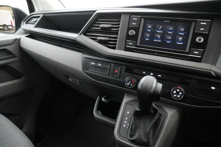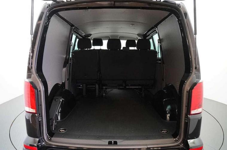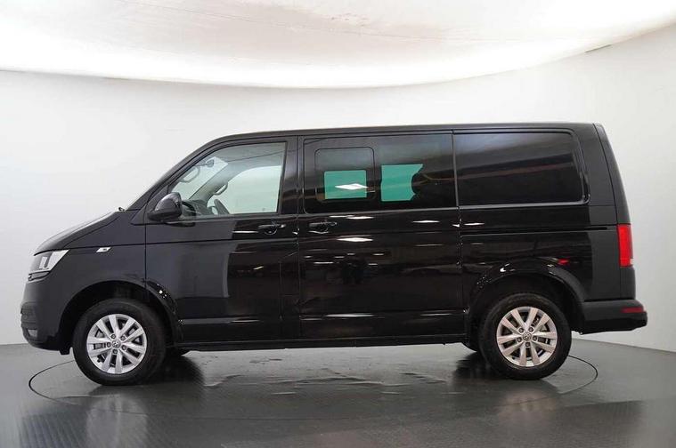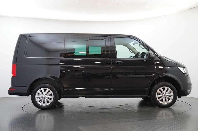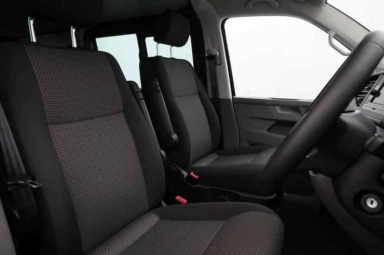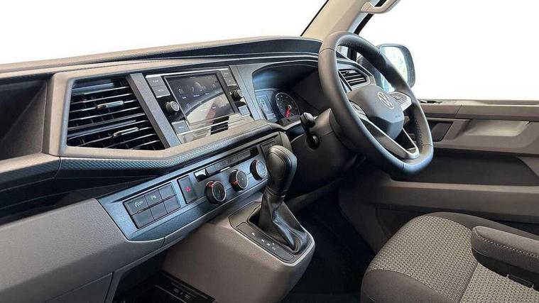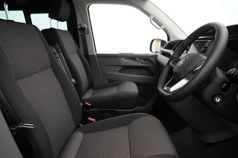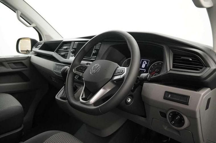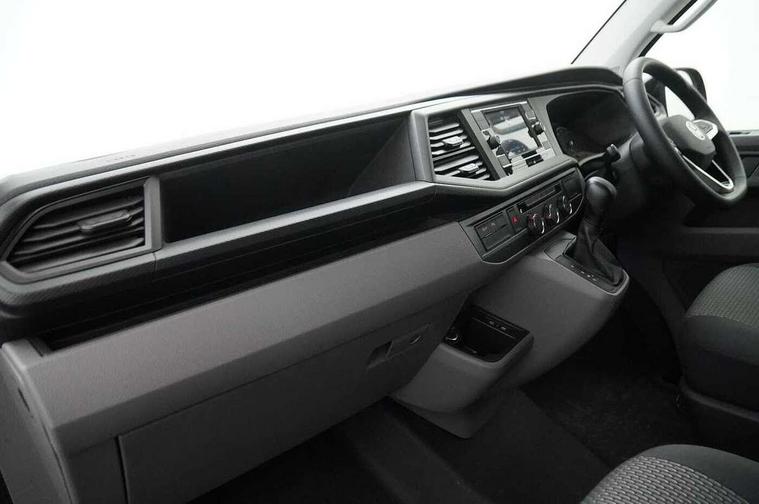 Adaptive cruise control, Child seat anchors ISOFIX and top tether in 2nd row of seats, Cross wind assist, Dimmable illuminated instruments, Driver alert with black and white multi function display plus, eCall emergency system, Forward collision warning front assist with autonomous emergency braking, Headlight range control, Mobile phone interface, Without voice control, 2 USB interfaces type C in dashboard, 4 speakers with 2 tweeters and 2 woofers, Composition colour radio with 6.5" touchscreen, Digital radio reception (DAB+), Volkswagen app connect, Automatic headlight control, leaving home and manual coming home feature, Front fog lamps with cornering light, Green heat insulating glass, Heated front windscreen, Illuminated steps in passenger/load compartment, Left convex exterior mirror, Power folding adjustable door mirrors with separately heated, Privacy glass from the B-pillar and heat-insulating glass in front, Radiator grille with 2 chrome trims, Rear window with heated insulating glass, heated rear window wiper and washer system, Right convex exterior mirror, Tailgate closing with unlatching from the inside, Transporter nameplate on the rear fender, Windshield wiper intermittent control with rain sensor for windshield wipers, Without adhesive film, 3 spoke leather wrapped multi function steering wheel, Additional sound deadening measures in cab and passenger compartment, Auto dimming breakaway interior rear view mirror, Comfort headliner in cab, hardboard roof trim in passenger and load compartment, Dust/pollen filter, Folding grab handles and storage compartments on cab seats, reading light, Front seats on the right in 1st row of seat, Glove compartment with illumination, Heavy duty tool kit and jack, Interior plastic loading edge protection, Lashing rings for load restraint system, LED Interior lighting in load and passenger compartment, Manual height adjustable and lumbar support for driver and single passenger seats, Medium height for vehicles with window aperture hardboard side trim panels in passenger/load compartment, Refrigerant R134a, Standard lower part dashboard in palladium, Without partition, Without seats in 3rd row of seats, Comfort pack - Transporter, Exterior pack without fog light- Transporter, Light and vision pack - Transporter, Non smoker pack - Transporter, 3 point height adjustable seat belts on outer seats cab with electric pretensioners, Driver and front passenger airbag with front passenger airbag deactivation, Power operated child safety lock, Warning buzzer and light for driver seat belt not fastened, Anti theft alarm system with interior monitoring in cab, backup horn and towing protection, Lockable wheel bolts, 16" chassis with 16" brake system, Additional 12V socket, Diesel particulate filter, Electronic stability control, ABS, ASR with deactivation button, hill start assist and brake assist system, Speed limiter, Start/stop system with regenerative breaking, 16" Clayton alloy wheels, Wheel trims,
