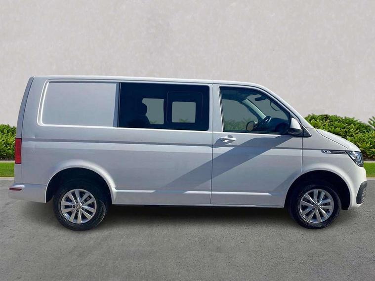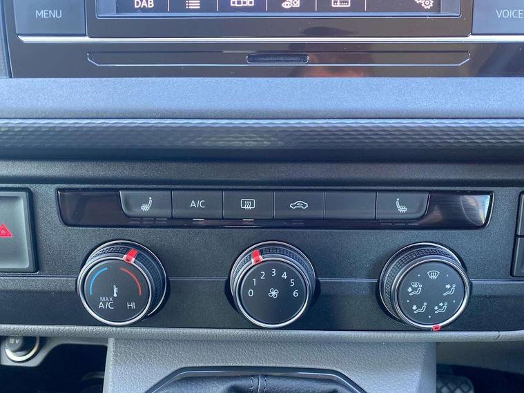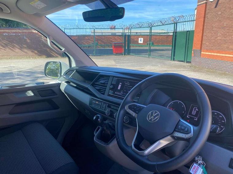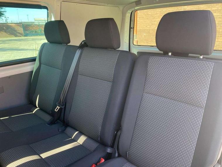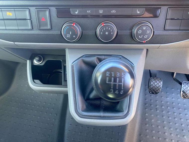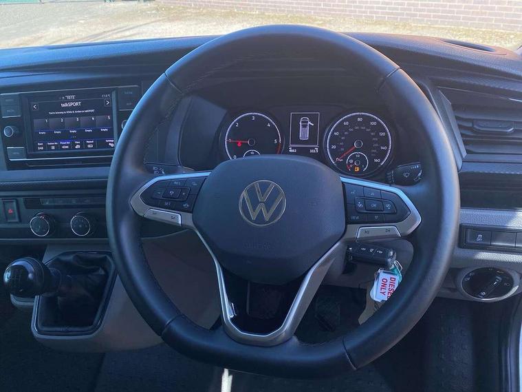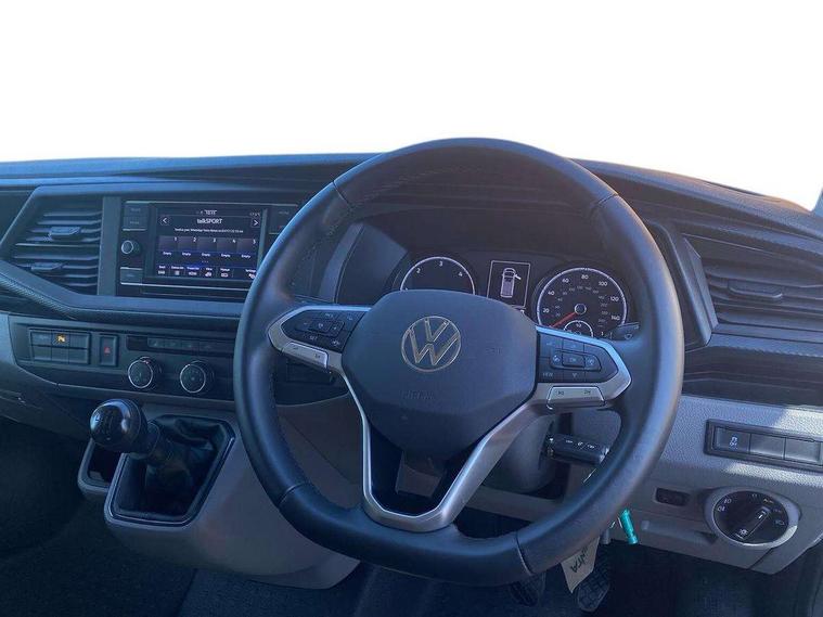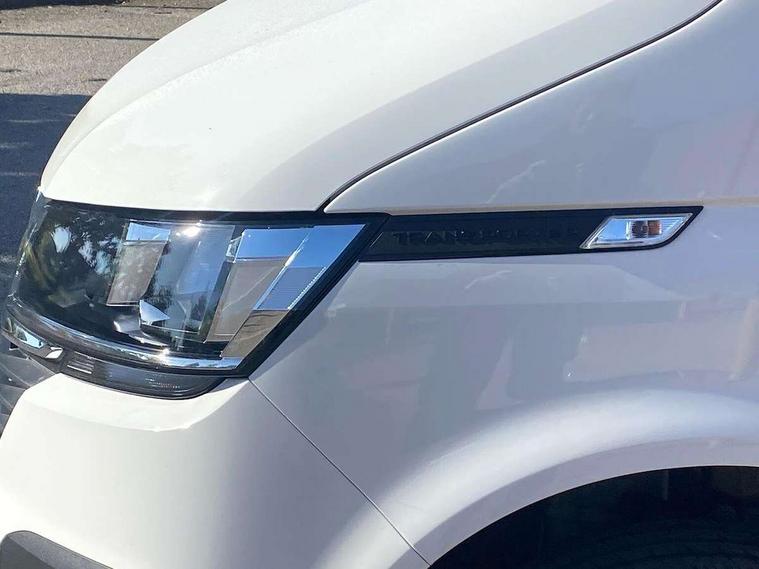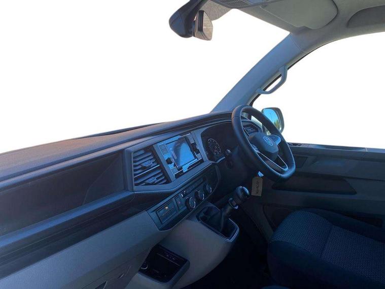 Adaptive cruise control, Child seat anchors ISOFIX and top tether in 2nd row of seats, Cross wind assist, Dimmable illuminated instruments, Driver alert with black and white multi function display plus, eCall emergency system, Forward collision warning front assist with autonomous emergency braking, Headlight range control, Mobile phone interface, Without voice control, 2 USB interfaces type C in dashboard, 4 speakers with 2 tweeters and 2 woofers, Composition colour radio with 6.5" touchscreen, Digital radio reception (DAB+), Volkswagen app connect, Automatic headlight control, leaving home and manual coming home feature, Front fog lamps with cornering light, Green heat insulating glass, Heated front windscreen, Illuminated steps in passenger/load compartment, Left convex exterior mirror, Power folding adjustable door mirrors with separately heated, Privacy glass from the B-pillar and heat-insulating glass in front, Radiator grille with 2 chrome trims, Rear window with heated insulating glass, heated rear window wiper and washer system, Right convex exterior mirror, Tailgate closing with unlatching from the inside, Transporter nameplate on the rear fender, Windshield wiper intermittent control with rain sensor for windshield wipers, Without adhesive film, 3 spoke leather wrapped multi function steering wheel, Additional sound deadening measures in cab and passenger compartment, Auto dimming breakaway interior rear view mirror, Comfort headliner in cab, hardboard roof trim in passenger and load compartment, Dust/pollen filter, Folding grab handles and storage compartments on cab seats, reading light, Front seats on the right in 1st row of seat, Glove compartment with illumination, Heavy duty tool kit and jack, Interior plastic loading edge protection, Lashing rings for load restraint system, LED Interior lighting in load and passenger compartment, Manual height adjustable and lumbar support for driver and single passenger seats, Medium height for vehicles with window aperture hardboard side trim panels in passenger/load compartment, Refrigerant R134a, Standard lower part dashboard in palladium, Without partition, Without seats in 3rd row of seats, Comfort pack - Transporter, Exterior pack without fog light- Transporter, Light and vision pack - Transporter, Non smoker pack - Transporter, 3 point height adjustable seat belts on outer seats cab with electric pretensioners, Driver and front passenger airbag with front passenger airbag deactivation, Power operated child safety lock, Warning buzzer and light for driver seat belt not fastened, Anti theft alarm system with interior monitoring in cab, backup horn and towing protection, Lockable wheel bolts, 16" chassis with 16" brake system, Additional 12V socket, Diesel particulate filter, Electronic stability control, ABS, ASR with deactivation button, hill start assist and brake assist system, Speed limiter, Start/stop system with regenerative breaking, 16" Clayton alloy wheels, Wheel trims,