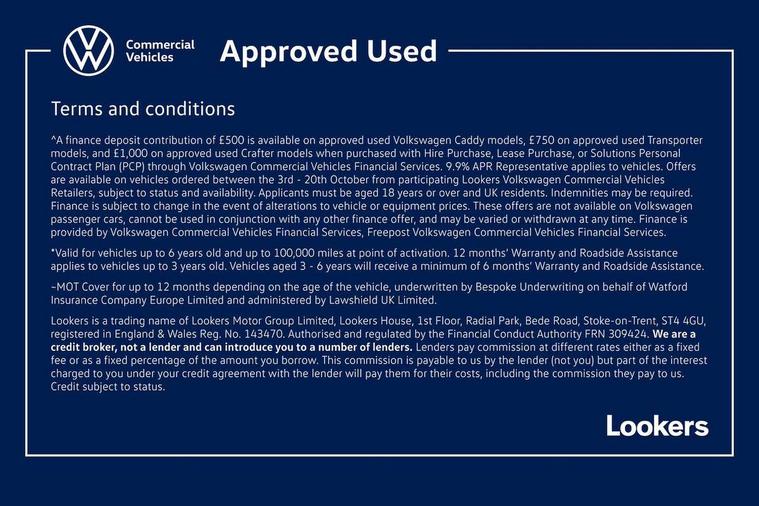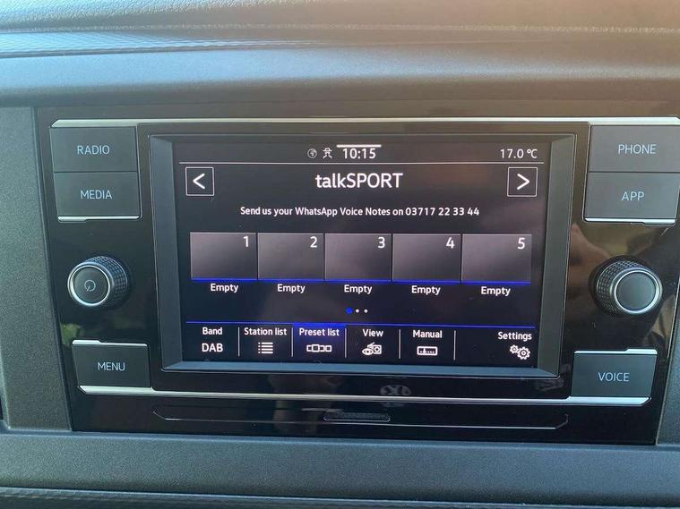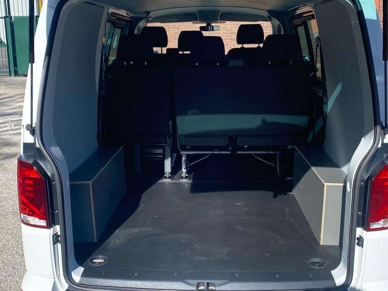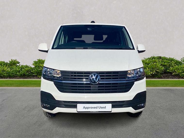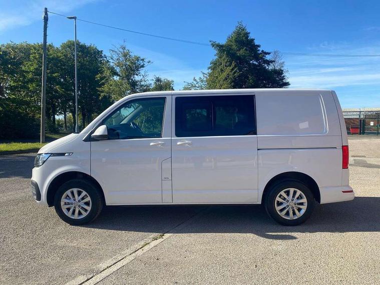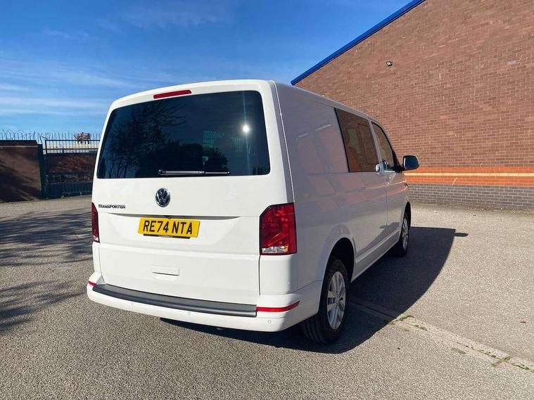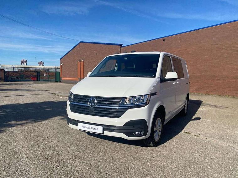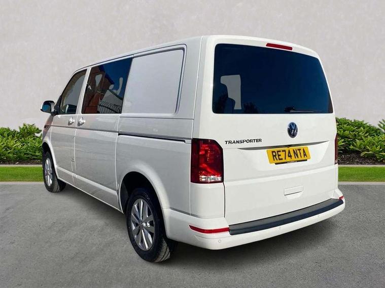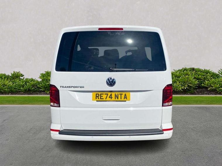 Adaptive cruise control, Child seat anchors ISOFIX and top tether in 2nd row of seats, Cross wind assist, Dimmable illuminated instruments, Driver alert with black and white multi function display plus, eCall emergency system, Forward collision warning front assist with autonomous emergency braking, Headlight range control, Mobile phone interface, Without voice control, 2 USB interfaces type C in dashboard, 4 speakers with 2 tweeters and 2 woofers, Composition colour radio with 6.5" touchscreen, Digital radio reception (DAB+), Volkswagen app connect, Automatic headlight control, leaving home and manual coming home feature, Front fog lamps with cornering light, Green heat insulating glass, Heated front windscreen, Illuminated steps in passenger/load compartment, Left convex exterior mirror, Power folding adjustable door mirrors with separately heated, Privacy glass from the B-pillar and heat-insulating glass in front, Radiator grille with 2 chrome trims, Rear window with heated insulating glass, heated rear window wiper and washer system, Right convex exterior mirror, Tailgate closing with unlatching from the inside, Transporter nameplate on the rear fender, Windshield wiper intermittent control with rain sensor for windshield wipers, Without adhesive film, 3 spoke leather wrapped multi function steering wheel, Additional sound deadening measures in cab and passenger compartment, Auto dimming breakaway interior rear view mirror, Comfort headliner in cab, hardboard roof trim in passenger and load compartment, Dust/pollen filter, Folding grab handles and storage compartments on cab seats, reading light, Front seats on the right in 1st row of seat, Glove compartment with illumination, Heavy duty tool kit and jack, Interior plastic loading edge protection, Lashing rings for load restraint system, LED Interior lighting in load and passenger compartment, Manual height adjustable and lumbar support for driver and single passenger seats, Medium height for vehicles with window aperture hardboard side trim panels in passenger/load compartment, Refrigerant R134a, Standard lower part dashboard in palladium, Without partition, Without seats in 3rd row of seats, Comfort pack - Transporter, Exterior pack without fog light- Transporter, Light and vision pack - Transporter, Non smoker pack - Transporter, 3 point height adjustable seat belts on outer seats cab with electric pretensioners, Driver and front passenger airbag with front passenger airbag deactivation, Power operated child safety lock, Warning buzzer and light for driver seat belt not fastened, Anti theft alarm system with interior monitoring in cab, backup horn and towing protection, Lockable wheel bolts, 16" chassis with 16" brake system, Additional 12V socket, Diesel particulate filter, Electronic stability control, ABS, ASR with deactivation button, hill start assist and brake assist system, Speed limiter, Start/stop system with regenerative breaking, 16" Clayton alloy wheels, Wheel trims,