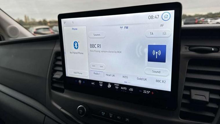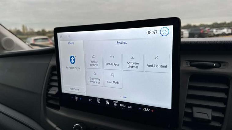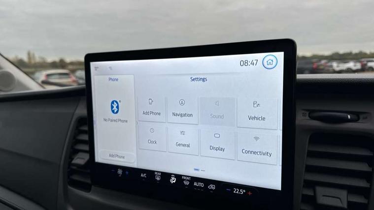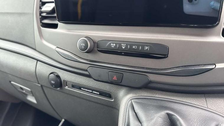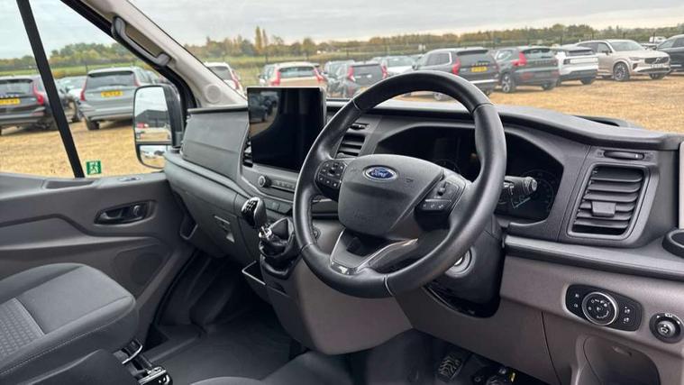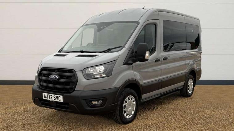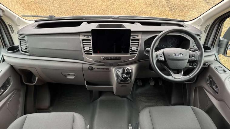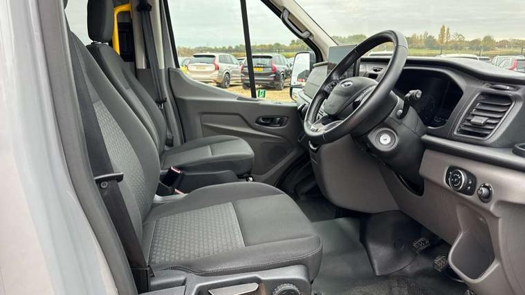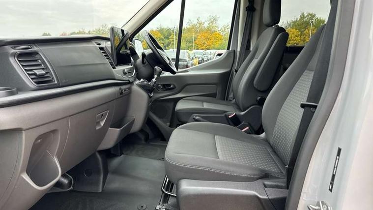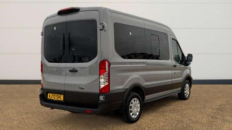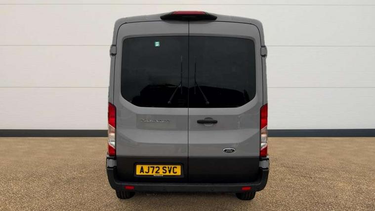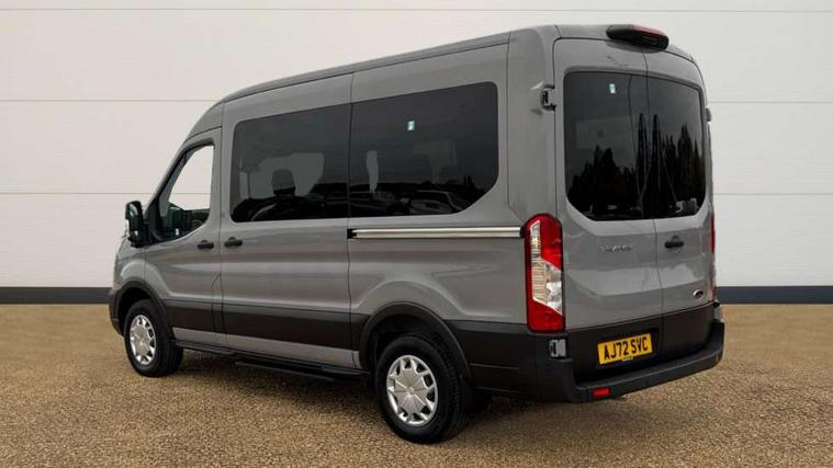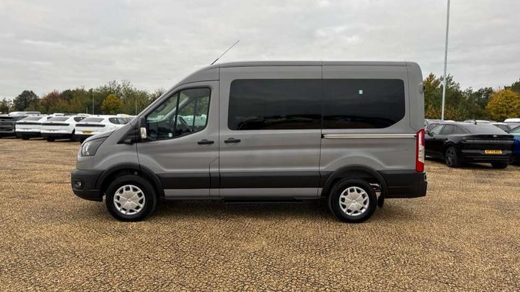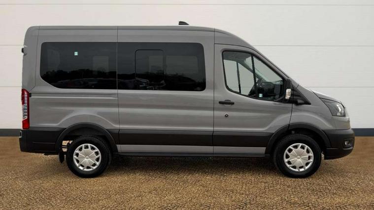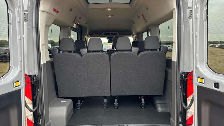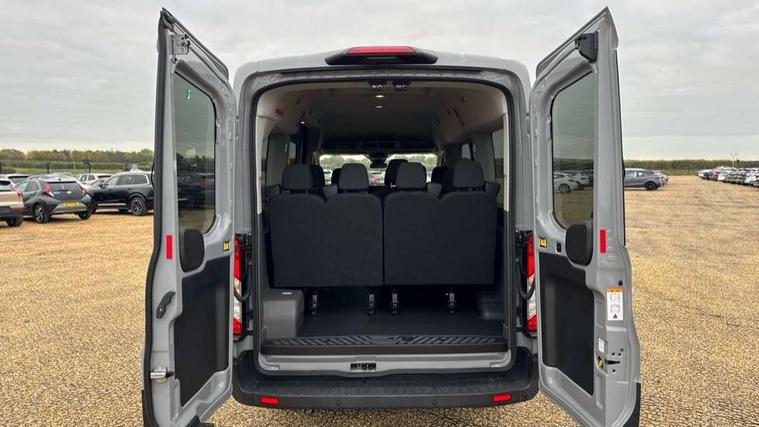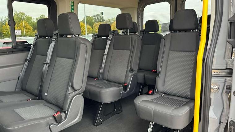 Lane departure warning system, Lane keeping aid, PAS, Selectable drive mode, Trip computer, Vehicle maintenance monitor, Auto wipers, Day/Night inside mirror, Driver large head/short arm mirror, Driver one touch up/down power windows, Dual power heated signal mirrors, Electric rear window defroster, High mounted stop lamp, Hinged rear cargo door, Kerbside side load doors, Medium roof line, Power side step, Privacy glass, Quickclear windscreen, Wide bodyside grey mouldings, Complete molded headliner, Completed rubber inside floor cover, Driver sunglasses roof storage, Glovebox with A4 file storage, Load compartment light, Locking glovebox, Premium feel steering wheel, Rake and reach steering adjustment, Rear climate control, Reclinable rear seats with armrests, Rear seat pack 6 - Transit minibus, Emergency hammer, Door entry remote control unit with 2 fobs, Keyless start, Remote central locking, 2 x 12V power outlets, 62 mph engine governor, ABS + ESP + Hill start assist, Auto start/stop system, Electronic dynamic cornering control, Heavy duty battery, Full wheelcovers, Single rear wheels, Tire Kit Repair Service,