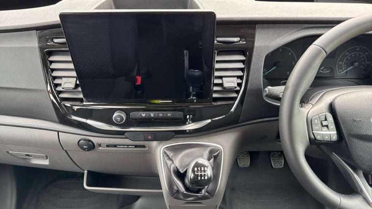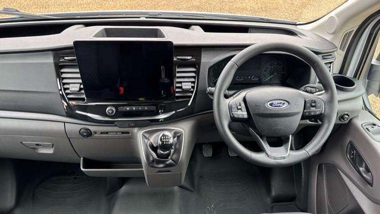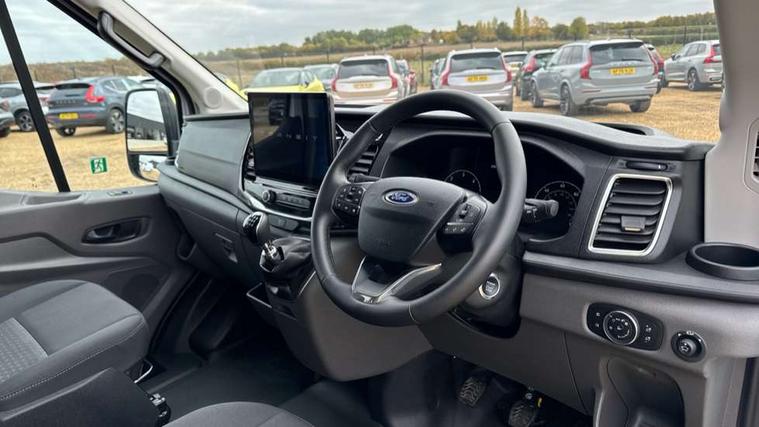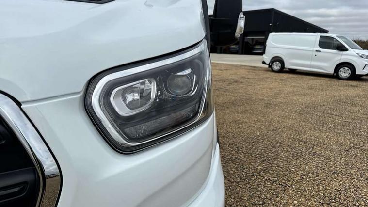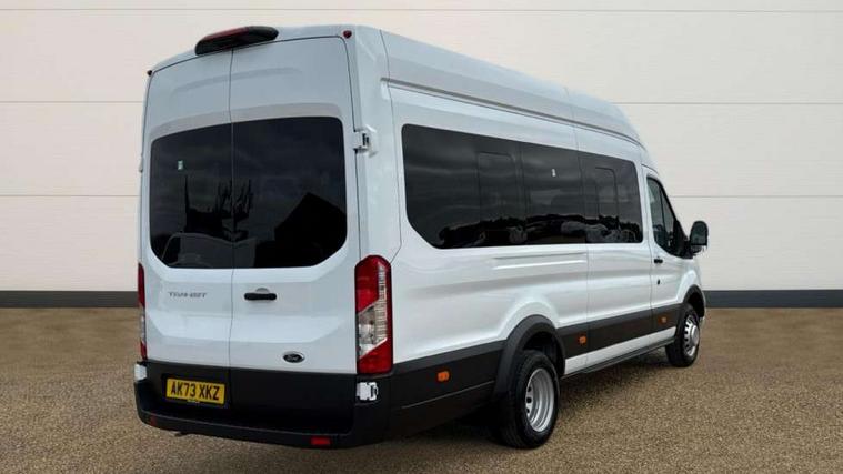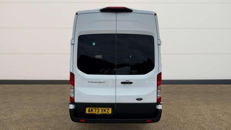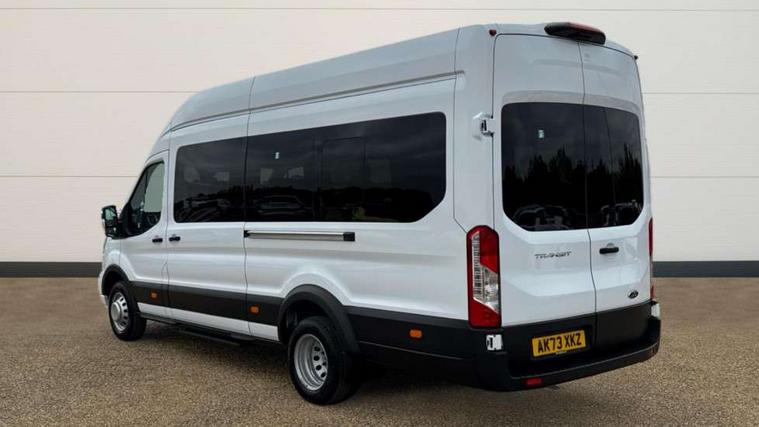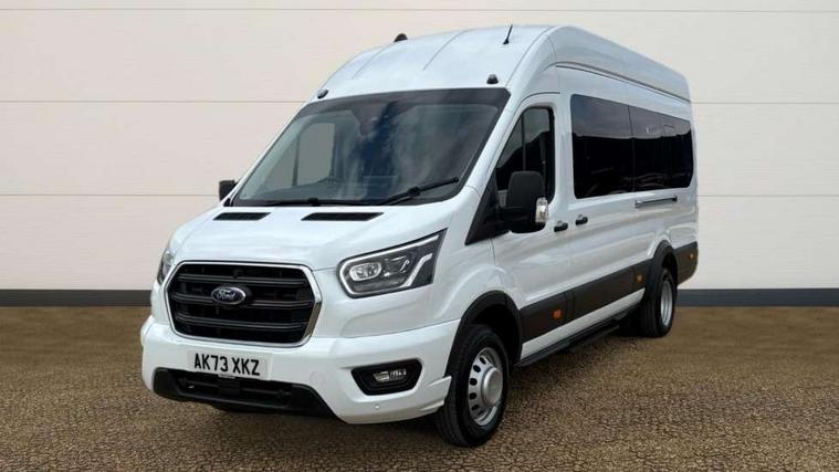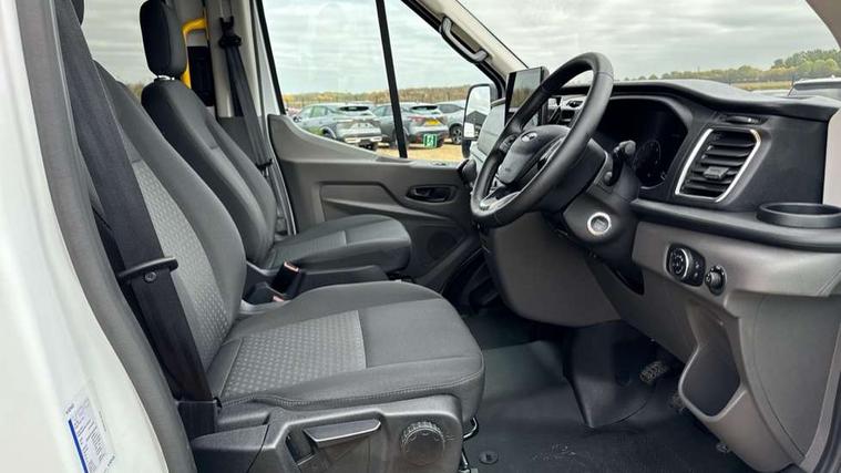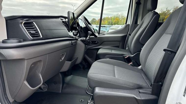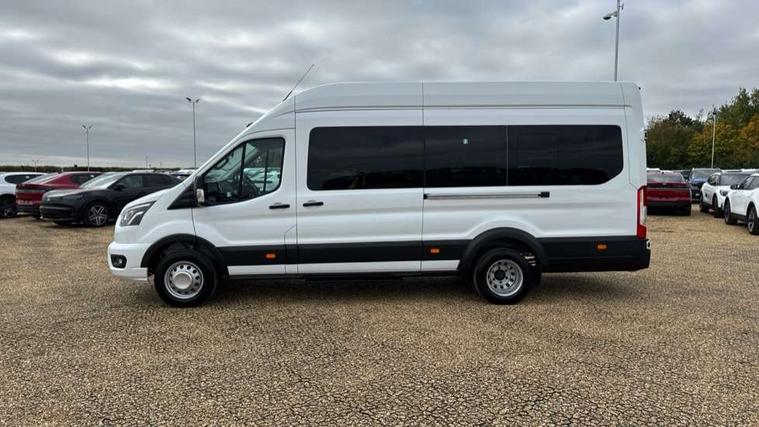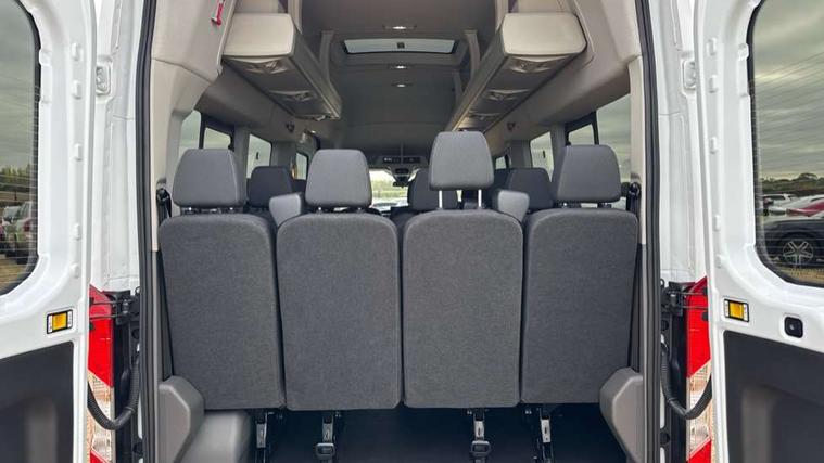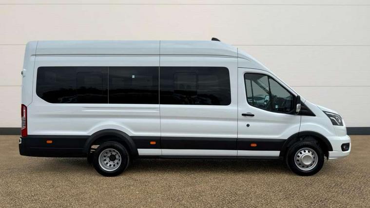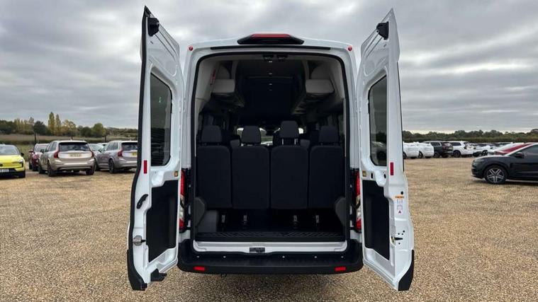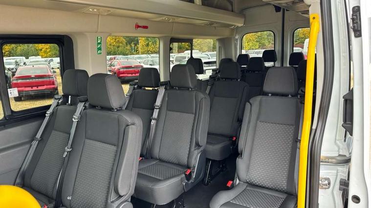 Instrument panel differentiation, PAS, Pre collision system with pedestrain detection with lane keeping aid, Selectable drive mode, Smart digital tachograph, Trip computer, Vehicle maintenance monitor, 270 degree rear cargo door with magnetic rentention, Auto wipers, Bi-xenon headlamps with LED daytime running lights, Chrome Grille, Day/Night inside mirror, Driver large head/short arm mirror, Driver one touch up/down power windows, Dual power heated signal mirrors, Electric rear window defroster, High intensity discharge headlamps, High mounted stop lamp, High roof line, Kerbside side load doors, Painted bumpers, Power side step, Privacy glass, Quickclear windscreen, Static bending headlights, Wide bodyside grey mouldings, Complete molded headliner, Completed rubber inside floor cover, Driver sunglasses roof storage, Glovebox with A4 file storage, Leather wrapped gear knob with aluminium surround, LED airline track load space lights, Load compartment light, Locking glovebox, Overhead airconditioning vents, Overhead LED reading lights, Overhead stowage racks, Premium feel steering wheel, Rake and reach steering adjustment, Rear climate control, Reclinable rear seats with armrests, Rear seat pack 8 - Transit minibus, Emergency hammer, Passenger airbag with deactivate switch, 2nd remote key, Door entry remote control unit with 2 fobs, Keyless start, Remote central locking, 2 x 12V power outlets, 62 mph engine governor, ABS + ESP + Hill start assist, Auto start/stop system, Electronic dynamic cornering control, Heavy duty battery, Heavy duty front axle, 16" steel wheels, Dual rear wheels, Steel spare wheel,