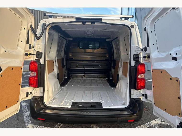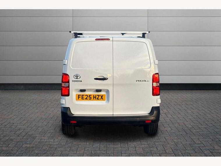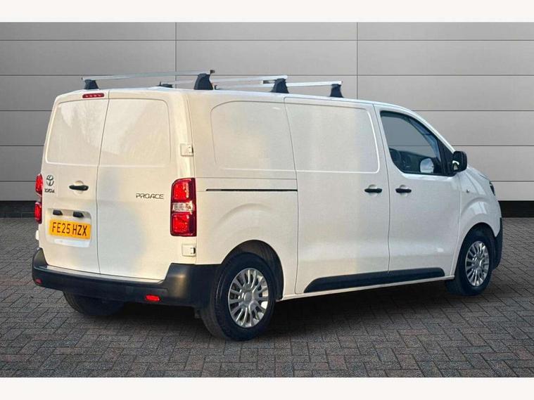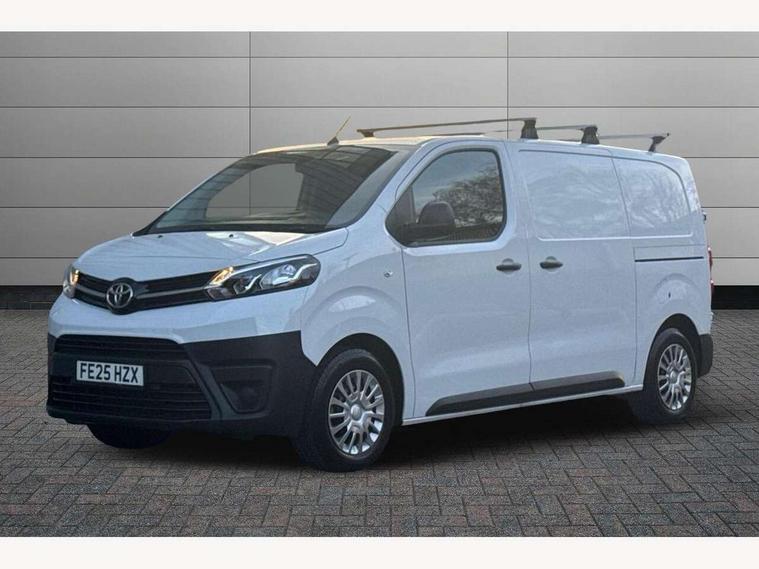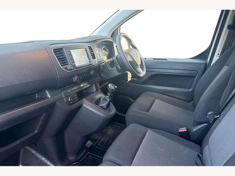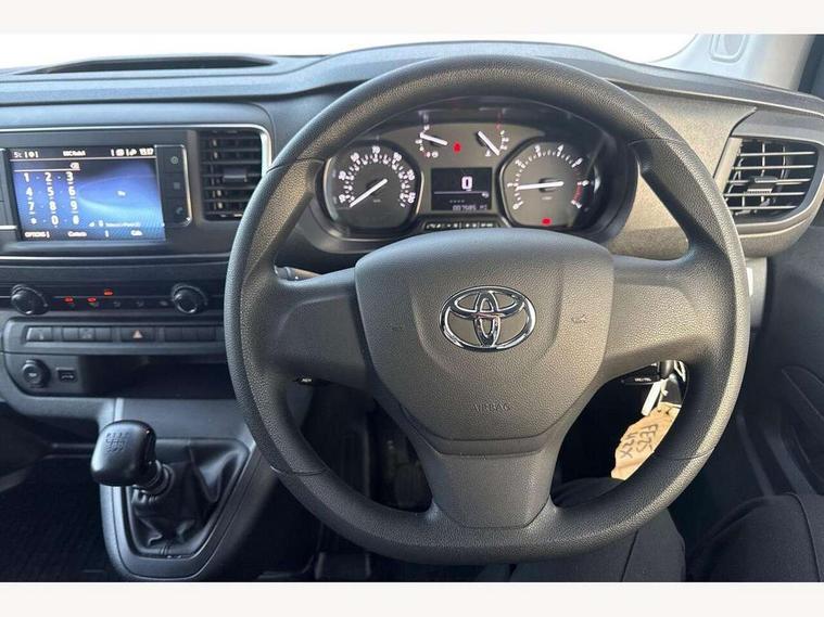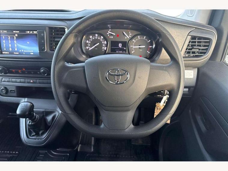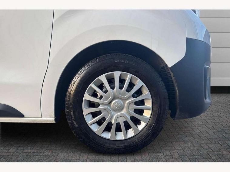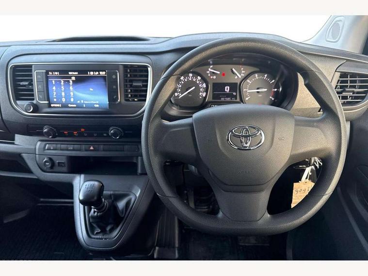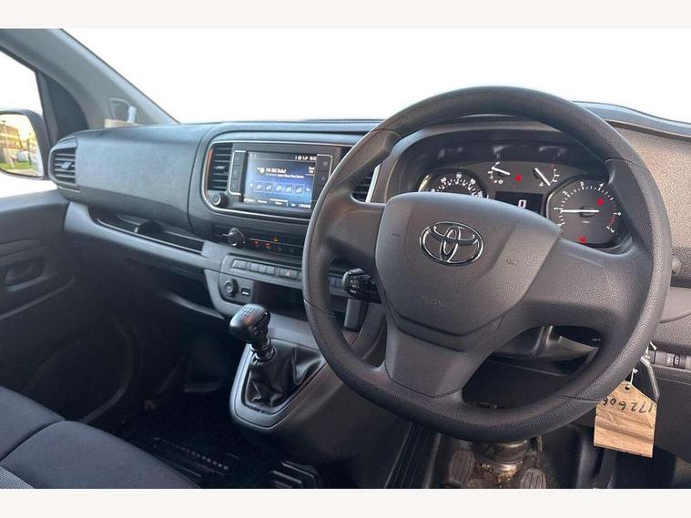 Bluetooth handsfree connectivity, Cruise control, PAS, Tyre pressure warning system (TPWS), 4 speakers, Digital radio (DAB), Radio/CD player, USB connector, 180 degree opening rear doors, Acoustic windscreen, Auto Headlights, Auto wipers, Black bumpers, Black door handles, Black protection moulding on side door, Body Coloured roof, Daytime running lights, Front power windows, Headlight cut-off reminder, Heated door mirrors, LED High mounted stop light, Manually adjustable day/night rear view mirror, Multi reflector halogen headlights, Panel rear wing doors, Power adjustable door mirrors, Rear combination lights, Short Antenna, Smoke tinted (30%) privacy glass on rear passenger window, Two manual sliding side doors, 2 seat front passenger bench, Driver seat armrest, Fabric seats, Front cup holders, Front room lights, Glovebox light, LED Driver and front passenger personal lights, Lighted and chilled upper glove box, Manually reclining and sliding driver and front passenger seats, Open upper dashboard storage compartment, Panel bulkhead with window and protective grille, Storage under passenger bench, Air conditioning and Smart cargo pack - Proace, Parking pack - Proace, Double front passenger airbag, Front passenger airbag on/off switch, Supplement restraint system (SRS) 2 airbags, Alarm, Deadlocks + 2 remote keys, Power door locks, 12V power front outlet, 12v socket in dashboard and rear, Adjustable speed limiter (ASL), Anti lock braking system (ABS), Brake Assist (BA), Stop/start function, Toyota traction select, Vehicle stability control (VSC) and hill start assist control (HAC), Full size spare wheel, Full wheel covers,