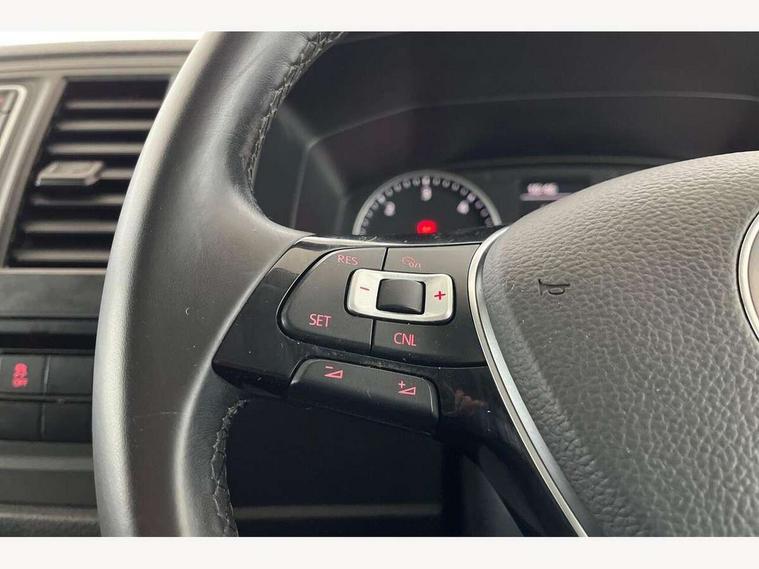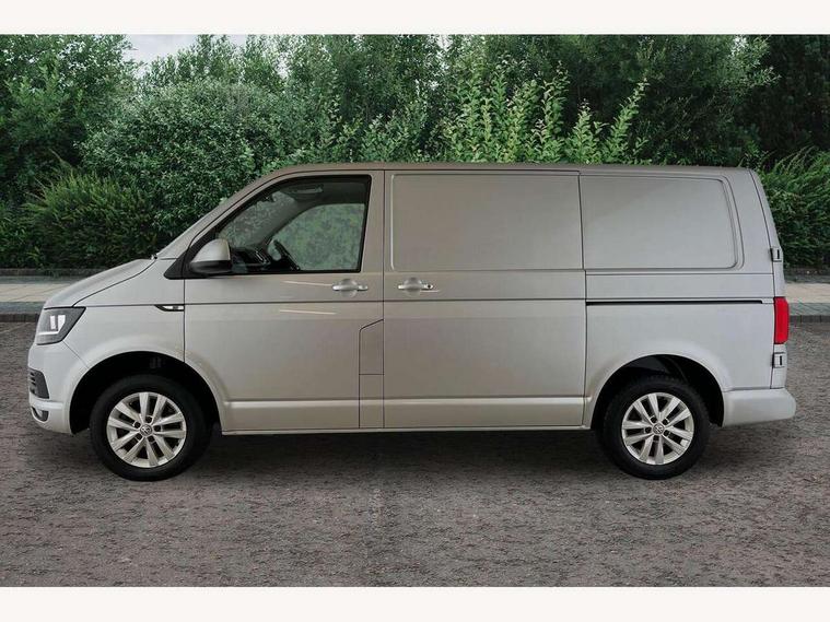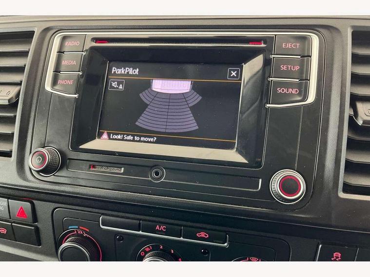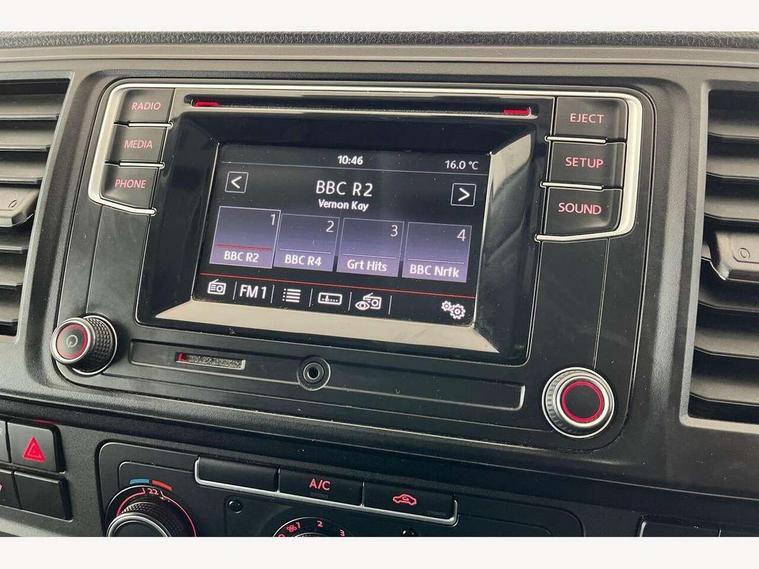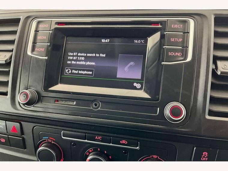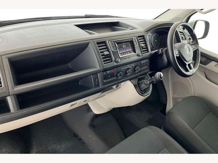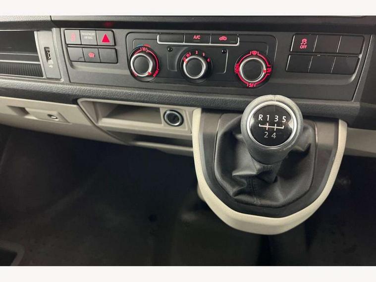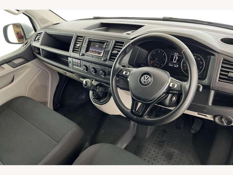 Bluetooth connectivity, Collision prevention assist, Digital clock, Driver alert with Multi-function display plus, Gearshift indicator, Headlight range control, Lights on warning buzzer, PAS, Rear door interior release lever, Rev counter, SD card slot, Service indicator, 4 speakers, Aux input socket, DAB radio/CD player, USB connection, 180 degree opening rear doors, 2 speed windscreen wipers/intermittent wash, 8 securing points for roof load rack system, Auto dimming rear view mirror, Automatic coming/leaving home lighting function, Electric front windows, Front and rear towing rings, Front fog lights with cornering function, Heat insulating glass, Heat reflective glass, Heated front windscreen, Laminated windscreen, Rear wing doors without windows, 1 coat hook, 1 hook on lower dash on front passenger side, 2 rear interior lights, switchable by door, 2 storage trays in dashboard, 2 sun visors folding and pivoted, 6 lashing points for securing loads, Additional 12v accessory socket, Cab interior light, Drinks holder, Driver's seat armrest, Dust/pollen filter, Front door pockets with bottle holder, Full height hardboard side lining, Half height hardboard side lining, Half height load lining, Height adjustable head restraints, Height and rake adjustable steering column, Interior entry steps, Interior roof trim - hardboard, Interior roof trim as headliner, Locking glovebox, Multifunction leather steering wheel, gearknob and gaiter, Open storage compartment in dash panel including mobile phone holder, Passenger seat with reach and rake adjustment, Rubber floor covering, Sheet steel flooring, Side roof frame trim, Storage box integrated in roof headliner, Storage compartments in doors, Storage compartments in outer side of driver & passenger seats, Storage net on lower dash passenger side, Cab comfort pack - Transporter Van, Electric pack A - Transporter, Exterior pack - Transporter, Lights and vision pack - Transporter, Non smoker pack, 3 point inertia reel belt on all seats, Brake pad wear indicator, Front passenger airbag deactivation, Height adjustable seatbelts with tensioners, Anti-theft alarm with rear control in cab, backup horn and towing protection, Locking wheel bolts, 70 litre fuel tank, ABS with electronic brake distribution, ASR traction control, Diesel particulate filter, EDL, Electronic differential lock, Engine braking control (MSR), ESP, Hill start assist, Traction control, Platinum grey trim, 16" Clayton alloy wheels,