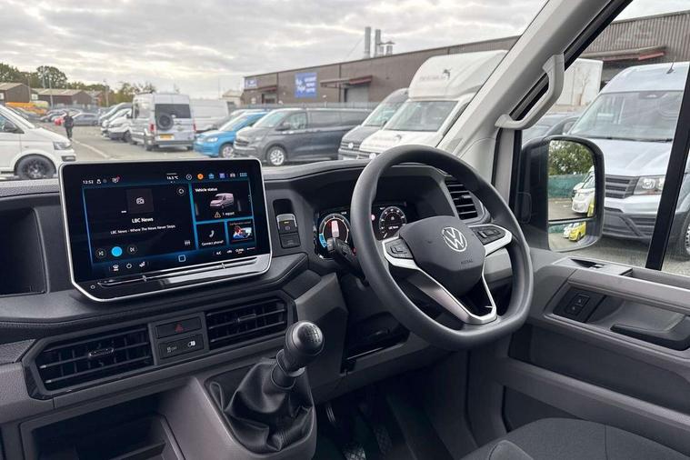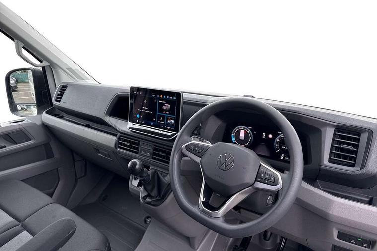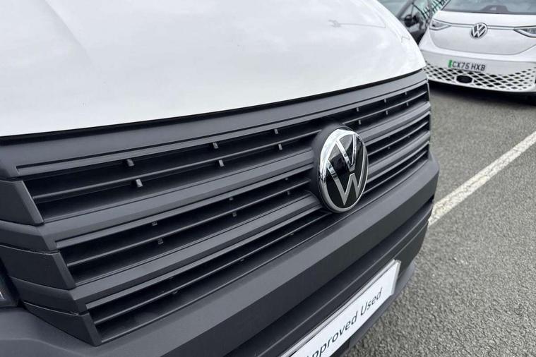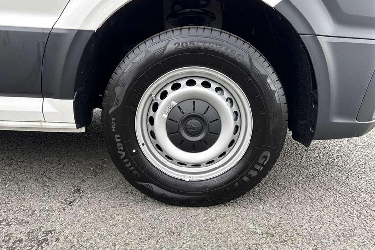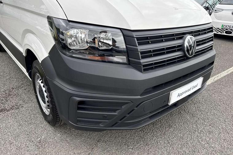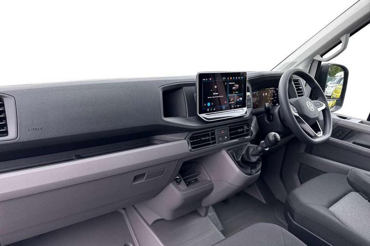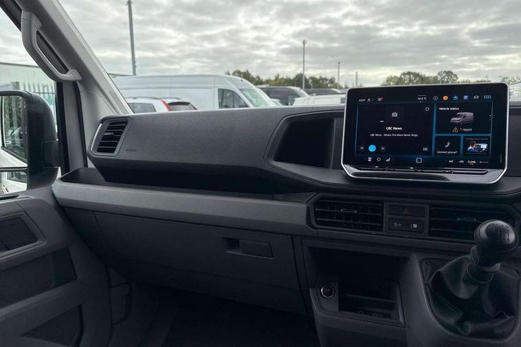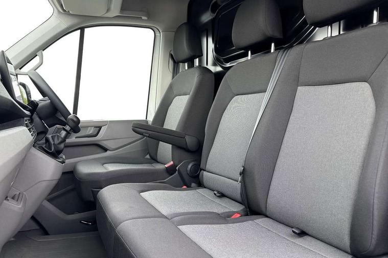 Bluetooth, Digital clock, Driver alert system, E-call + We connect basic preparation, Front and rear parking sensors, Instrument cluster, Lane keeping assist, Lights on warning buzzer, Locking fuel cap, Multi-function Display Plus, Rev counter, Service indicator, Speedometer, Voice control system, Composition media with 6.5" with we connect plus prep, 4 speaker, multifun display plus, USB, mob interface, app con, "We connect function", DAB Radio, Auto low beam mode, Leaving home function and manual coming home function, Black unpainted plastic front bumper, Cab doors, Convex and wide angle mirror, Driver seatbelt warning light, Electric windows, Heat insulating glass, Indicators in front door mirrors, Manually adjustable door mirrors, One towing eye in front, Special identification plate, Unpainted radiator grille, Air recirculation system, Ashtray, Centre console storage tray, CFCU preparation, Charcoal filter, Document holder on centre console, Drinks holders, Electromechanical Servotronic steering, Electronically controlled heating system, Fully adjustable suspension type driver seat, Height adjustable head restraints, Height and reach adjustable steering wheel, Illuminated glove compartment with lockable lid, Interior light, including 2 reading lights, Interior light, switchable by door, Jack and tool kit, Multifunction steering wheel, Preparation for interface for external use with terminal block, Storage compartments in doors and in step, right, Storage tray on dashboard, Two 12V outlets in the cab (in the dashboard), Without rear side trim panel passenger load compartment, Non-smokers pack - Crafter, 3 point inertia reel belt on all seats, Automatic hazard light with emergency braking, Crosswind assist, Driver and front passenger airbag with front passenger airbag deactivation, Height adjustable seatbelts for outer cab seats, 1 rigid key, Engine immobiliser, ABS, Automatic post collision braking system, EBA, EBD, EDL, ESP, Front disc brakes, HBA, Hill start assist, Parking brake - hill hold control, Start and stop system with regenerative braking, TCS, Hub cap covers,