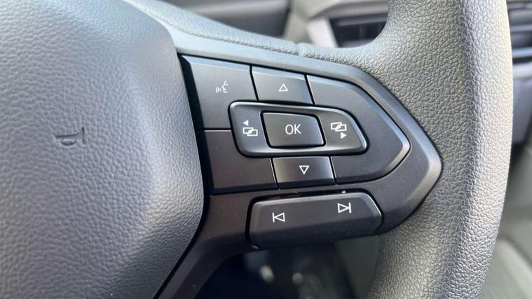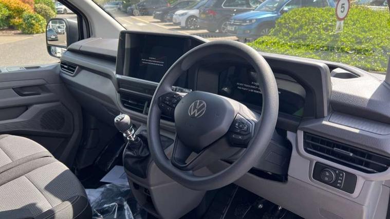 12" digital drivers display, 13" touchscreen infotainment display with wireless app connect and DAB radio, 5G Modem, Apple CarPlay and Android Auto, Cruise control, Dynamic road sign display, eCall emergency system, Electromechanical speed sensitive power steering, height and longitudinally adjustable steering column, Lane assist, Preparation of VW connect and connect plus, Wrong way driver warning, 4 speakers - 2x dashboard, 2x cab doors, Grained black door handles, Heat reflecting side window glass, High beam control, Laminated windshield made of heat-reflecting glass, LED rear combination lamps, Rear Transporter nameplate in black grained decorative trim, Vehicle opening configuration 1x 1st row of seats, 2x all doors, 2x 15-W USB data/charging ports in dashboard and 1x USB-C, 1x USB-A center bottom, 2x LED lights in load compartment, 4 way height and tilt adjustable head restraints, Black plastic scuff plate for sliding door in cargo without illumination, Cabin interior lighting, Lashing rings for reinforced floor covering, Narrow centre console with cup holder and compartment for mobile phone, Overhead storage compartment, Plastic gear lever, Roof grab handle on front passenger side, Rubber floor covering in cab, Standard glove compartment, Striped fabric upholstery, Without passenger seats in load compartment, Exterior pack 1 - Transporter, Interior trim pack - Transporter, Driver and front passenger airbag with front passenger airbag deactivation, Dual tone horn, Front and curtain airbags for driver and front passenger, Seat belt pretensioner for driver seat, Electronic immobiliser, Preparation for alcohol ignition interlock, 5+ Promise, Alternator - 230A, Electronic stability control, ABS, ASR with deactivation button, hill start assist and brake assist system,