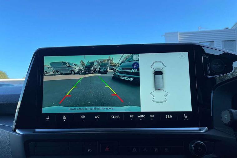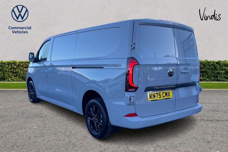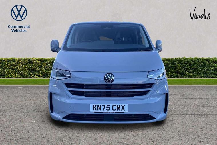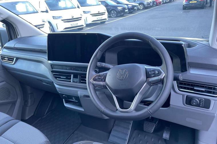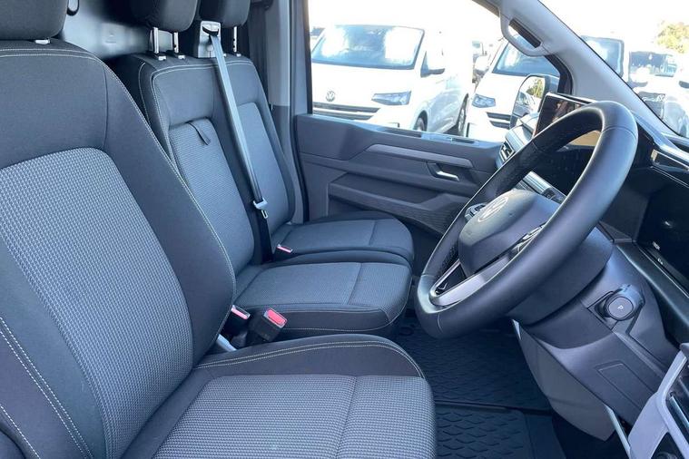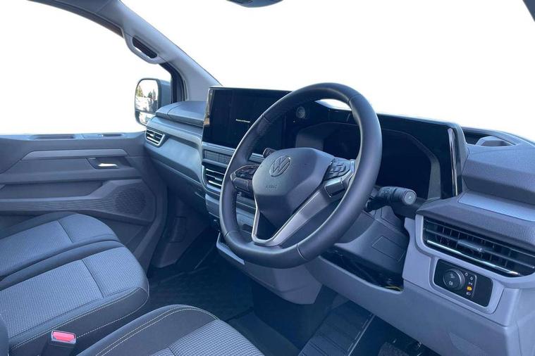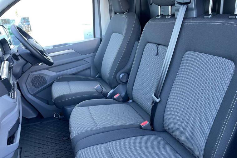 12" digital drivers display, 13" touchscreen infotainment display with wireless app connect and DAB radio, 5G Modem, Adaptive cruise control, Apple CarPlay and Android Auto, Dynamic road sign display, eCall emergency system, Electromechanical speed sensitive power steering, height and longitudinally adjustable steering column, Lane and blind spot assist with exit warning system, Preparation of VW connect and connect plus, Traffic jam assist, Wireless mobile phone charging, Wrong way driver warning, Body colour bumpers, Body coloured door handles, Body coloured door mirrors, Body coloured radiator grille, Electrically heated, adjustable and folding door mirrors, Heat reflecting side window glass, Mud flaps front and rear, Rear Transporter nameplate in black grained decorative trim, Vehicle opening configuration 1x 1st row of seats, 2x all doors, 12V outlet in centre console and 12V outlet on rear right D-pillar, 2x 15-W USB data/charging ports in dashboard and 1x USB-C, 1x USB-A center bottom, 2x LED lights in load compartment, 3x additional super bright LED lights in load compartment, 4 way height and tilt adjustable head restraints, 5 additional USB-C charging ports, Black plastic scuff plate for sliding door in cargo without illumination, Cabin interior lighting, Gear selector lever on steering wheel, Glasses compartment in driver side roof, Grab handle on A-pillar passenger side, Illuminated lockable glovebox, Lashing rings for reinforced floor covering, Narrow centre console with cup holder and compartment for mobile phone, Overhead storage compartment, Rubber floor covering in cab, Striped fabric upholstery, Without passenger seats in load compartment, Driver and front passenger airbag with front passenger airbag deactivation, Dual tone horn, Front and curtain airbags for driver and front passenger, Seat belt pretensioner for driver seat, Anti theft alarm system with interior monitoring in cab, backup horn and towing protection, Electronic immobiliser, Lockable wheel bolts, Preparation for alcohol ignition interlock, 5+ Promise, Alternator - 230A, Electromechanical brake booster, Electronic stability control, ABS, ASR with deactivation button, hill start assist and brake assist system,