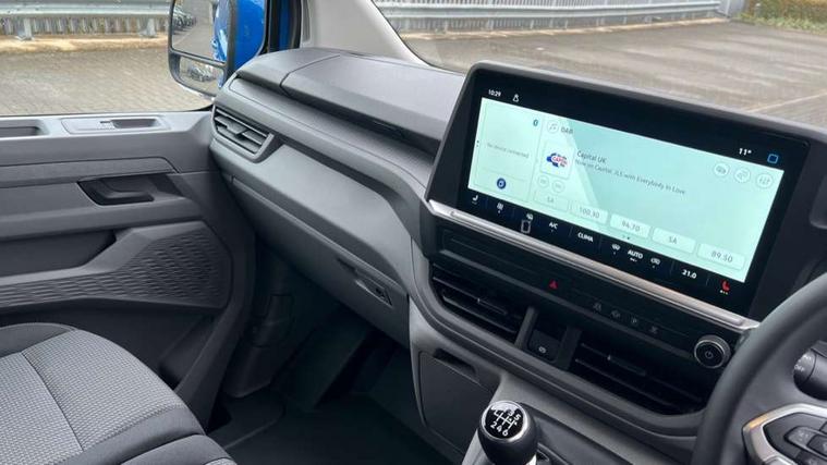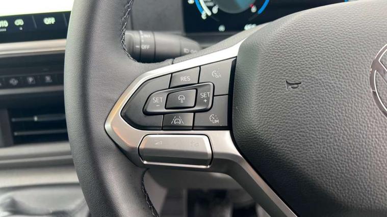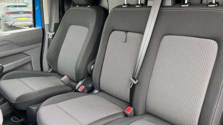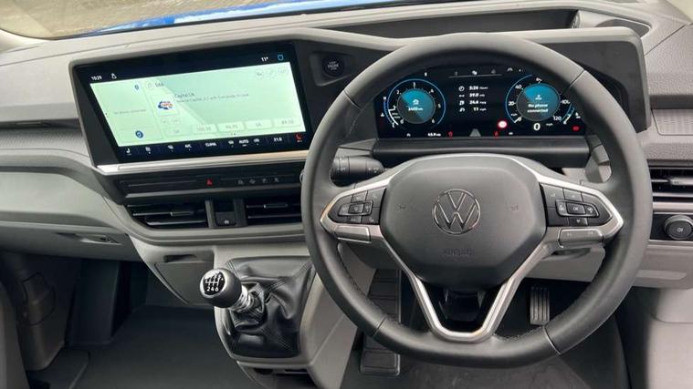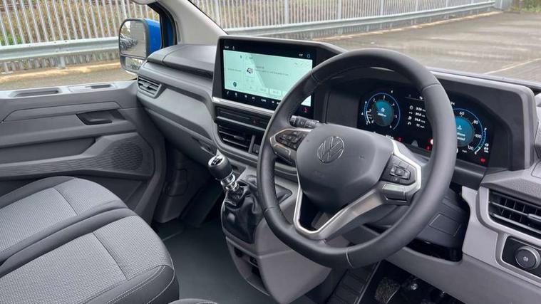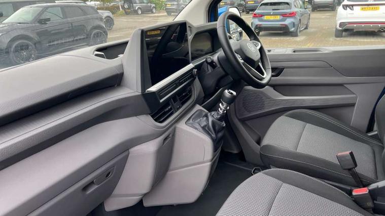 12" digital drivers display, 13" touchscreen infotainment display with wireless app connect and DAB radio, 5G Modem, Adaptive cruise control, Apple CarPlay and Android Auto, Dynamic road sign display, eCall emergency system, Electromechanical speed sensitive power steering, height and longitudinally adjustable steering column, Lane and blind spot assist with exit warning system, Preparation of VW connect and connect plus, Wireless mobile phone charging, Wrong way driver warning, Body colour bumpers, Body coloured door handles, Body coloured door mirrors, Body coloured radiator grille, Electrically heated, adjustable and folding door mirrors, Heat reflecting side window glass, Mud flaps front and rear, Rear Transporter nameplate in black grained decorative trim, Vehicle opening configuration 1x 1st row of seats, 2x all doors, 12V outlet in centre console and 12V outlet on rear right D-pillar, 2x 15-W USB data/charging ports in dashboard and 1x USB-C, 1x USB-A center bottom, 2x LED lights in load compartment, 3x additional super bright LED lights in load compartment, 4 way height and tilt adjustable head restraints, 5 additional USB-C charging ports, Black plastic scuff plate for sliding door in cargo without illumination, Cabin interior lighting, Glasses compartment in driver side roof, Grab handle on A-pillar passenger side, Illuminated lockable glovebox, Lashing rings for reinforced floor covering, Leatherette gear lever, Narrow centre console with cup holder and compartment for mobile phone, Overhead storage compartment, Rubber floor covering in cab, Striped fabric upholstery, Without passenger seats in load compartment, Driver and front passenger airbag with front passenger airbag deactivation, Dual tone horn, Front and curtain airbags for driver and front passenger, Seat belt pretensioner for driver seat, Anti theft alarm system with interior monitoring in cab, backup horn and towing protection, Electronic immobiliser, Lockable wheel bolts, Preparation for alcohol ignition interlock, 5+ Promise, Alternator - 230A, Electromechanical brake booster, Electronic stability control, ABS, ASR with deactivation button, hill start assist and brake assist system,