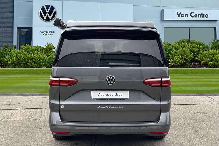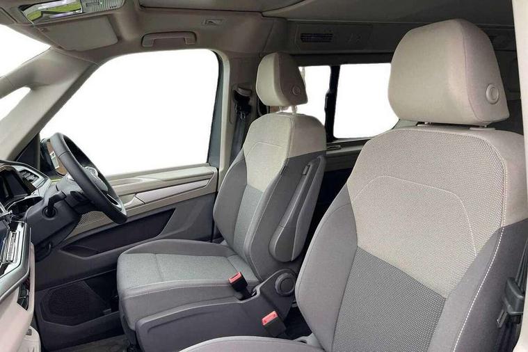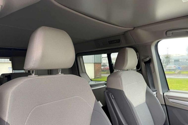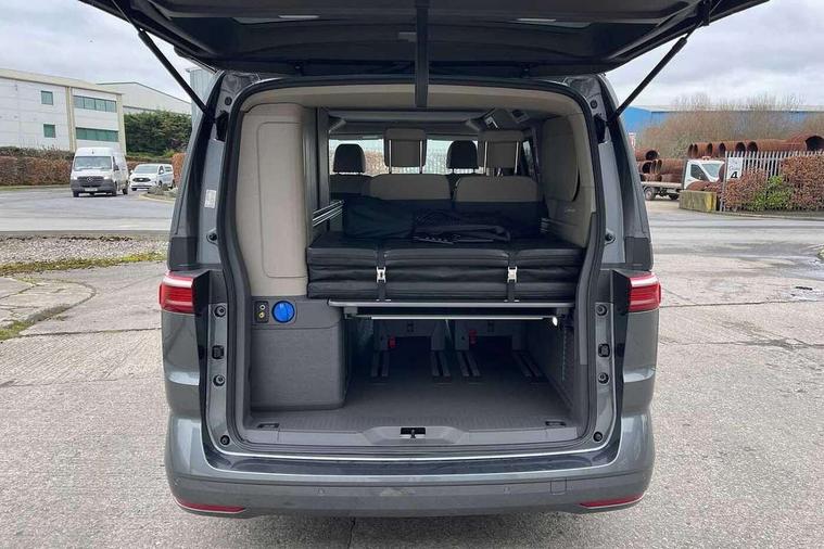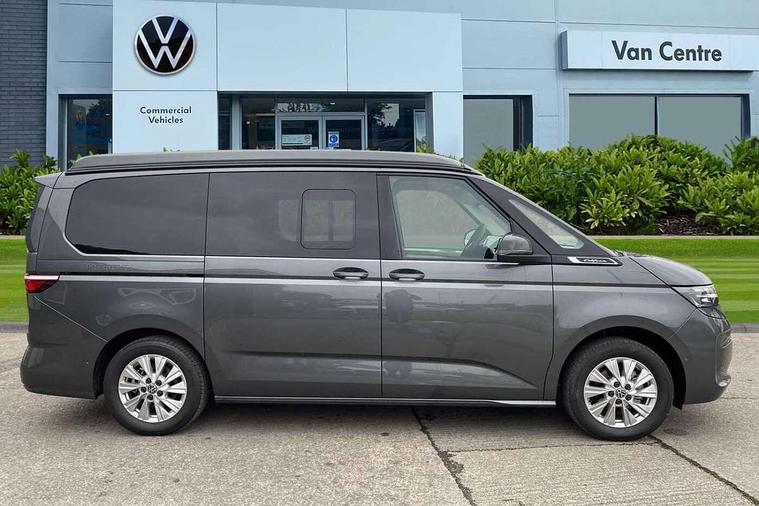 AppConnect including wireless Apple CarPlay, California on tour app, Digital cockpit pro, eCall emergency system, Function control unit, IDA voice assistant and voice enhancer, Lane keeping system Lane Assist, Mobile phone interface, Multifunction camera, Online service, with OCU, with head unit coding, without WFS federation, PAS, Preparation for online services, Tailgate with window aperture, Traffic sign recognition, Turn assist with evasive assistance, 2 USB-C ports at the front, 4 USB-C charging sockets in the passenger compartment, 8 passive speakers, Digital radio reception (DAB+), 65% light absorbing privacy glass, A-pillar, D pillar and tailgate, All weather light, Ambient lighting in door area, Electro hydraulic elevating roof, with three windows including one front passengers panorama opening, canvas in Basalt Grey, Four speed control for windscreen wipers, Front window in laminated safety glass with heat and noise-insulating, Heated windscreen, High gloss black door mirrors, Molding between headlamps painted to glossy black, Nameplate set California, Rear boot, Sliding door on the left passenger compartment, Sliding door on the right passenger compartment, Sliding window in front and fixed window in rear in rear passenger compartment at right, Tailgate closure without unlocking function from the inside, Windscreen wiper intermittent control, 2 single seats with integrated seatbelt and sleeping mat, 230V interver with socket on driver seat, Additional interior noise attenuation, Alcohol interlock, Armrest on front swivel seats in both sides with electric lumbar support, Darkening roller blinds and thermo mats, Drawers under the seats in the driver and passenger compartment + 2 waste bins, Front and rear headrests, Kitchen with outdoor folding table for cooking in décor 1, Lockable glove compartment without lighting, Multifunction leather steering wheel with paddle shifters, Plastic floor covering in passenger/load compartment, Single front passenger seat, Sleeper seats, Surround lighting in door area, Swivel seat on left with height adjustable including drawer, Swivel seat on right with height adjustable including drawer, 3x3 point automatic seatbelts at the rear outside with ECE label, with/without belt tensioner, Advanced driver attention, Autonomous emergency braking front assist with pedestrian and cyclist monitoring, Driver and front passenger airbags with front passenger airbag deactivation button, Drowsiness detection, First aid kit with warning triangle and safety vest, Front disc brakes, Height adjustable three point automatic seatbelts at front with belt and end fitting tensioners, Side and curtain airbags for driver and front passenger, curtain airbags for outer seats in rear, centre airbag in front, Swerve support and oncoming vehicle braking when turning, Tyre pressure loss indicator, Anti theft alarm system with interior monitoring in cab, backup horn and towing protection, Central locking system with keyless locking and starting system keyless advanced with safelock, Lockable wheel bolts, Scale light grey decorative inlays, Full wheel covers, Tool kit, Trims for alloy wheels, Tyre mobility kit,
