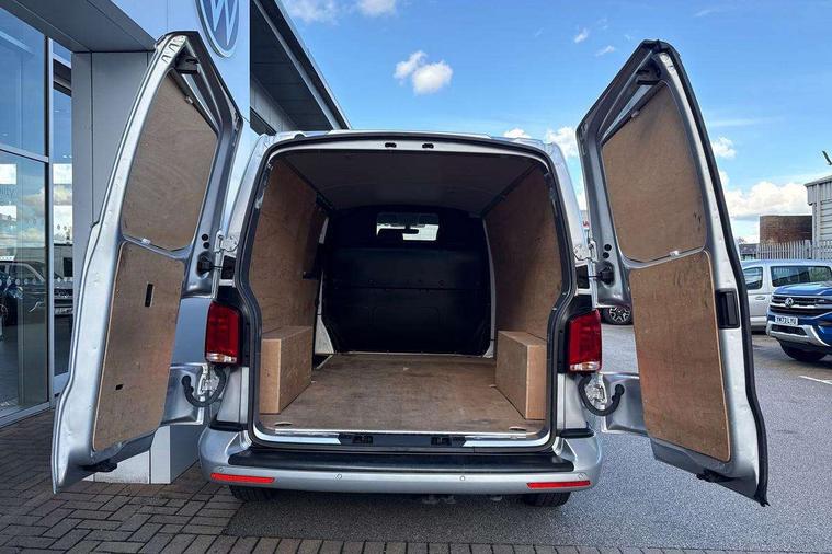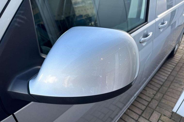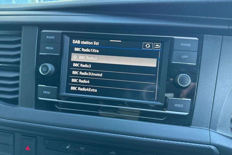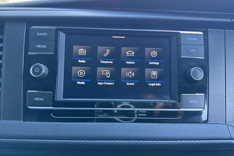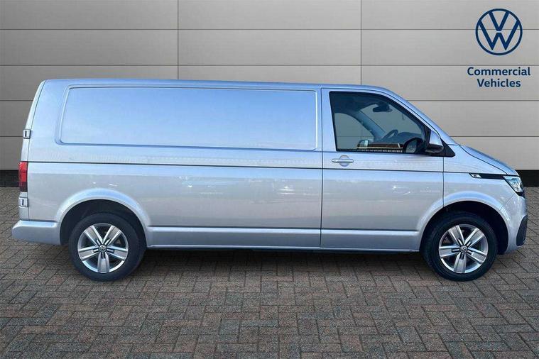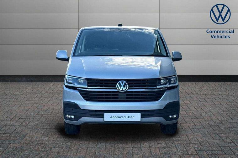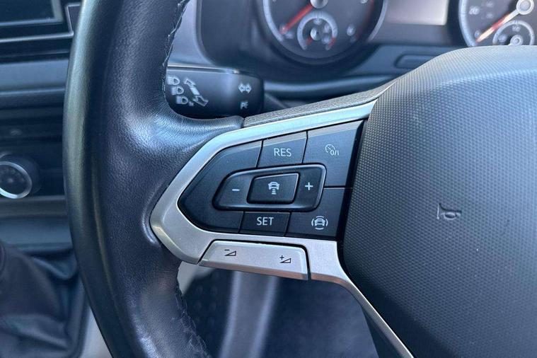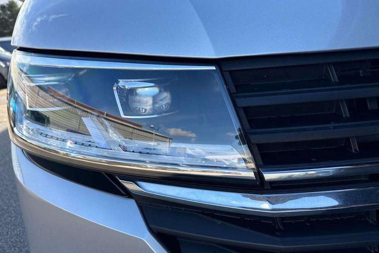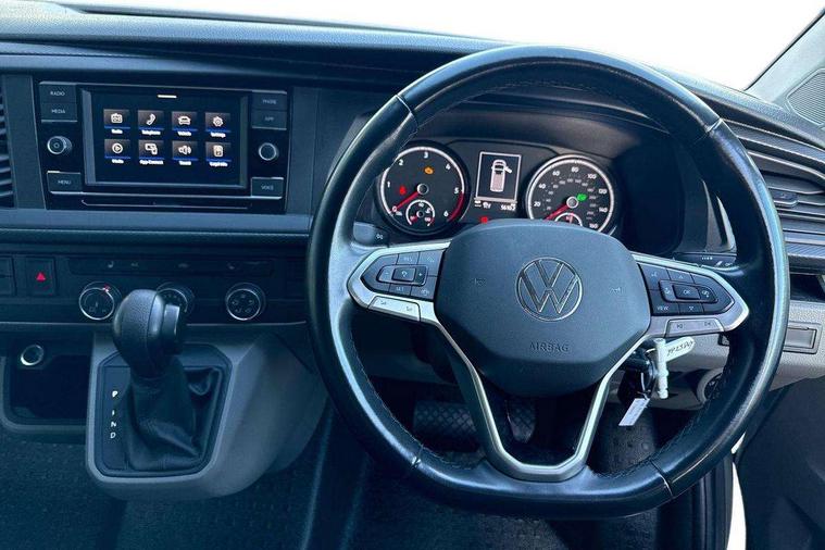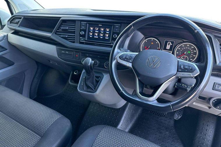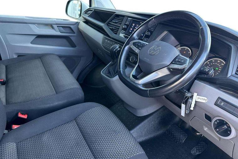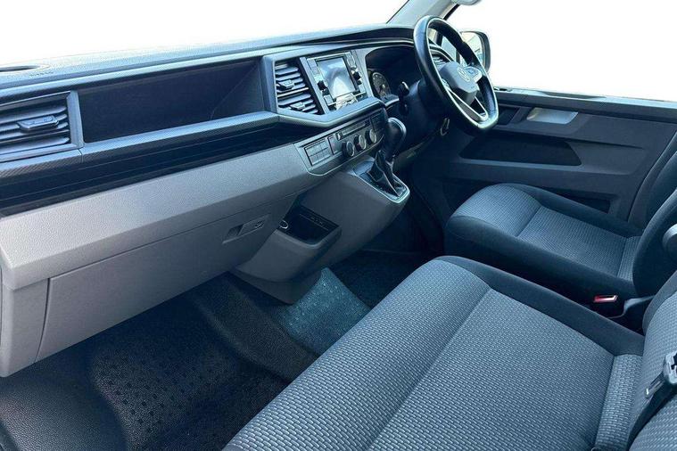 Adaptive cruise control, Cross wind assist, Dimmable illuminated instruments, Driver alert with Multi-function display plus, eCall emergency system, Forward collision warning front assist with autonomous emergency braking, Mobile phone interface, Multi function display plus with black and white display, 2 USB interfaces type C in dashboard, 4 speakers with 2 tweeters and 2 woofers, Composition colour radio with 6.5" touchscreen, Digital radio reception (DAB+), Volkswagen app connect, Automatic headlight control, leaving home and manual coming home feature, Closing rear wing door with unlatching from the inside, Front fog lamps with cornering light, Heat insulating glass (green) in cab and passenger/load compartment, Heated front windscreen, Left convex exterior mirror, Power folding adjustable door mirrors with separately heated, Radiator grille with 2 chrome trims, Rear wing doors without window apertures, Right convex exterior mirror, Transporter nameplate on the rear fender, Windshield wiper intermittent control with rain sensor for windshield wipers, 3 spoke leather wrapped multi function steering wheel, Auto dimming breakaway interior rear view mirror, Comfort headliner in cab, hardboard roof trim in passenger and load compartment, Dust/pollen filter, Front and rear left without window closed side panel in load compartment, Front seats on the right in 1st row of seat, Glove compartment with illumination, Heavy duty tool kit and jack, High partition, Interior plastic loading edge protection, LED Interior lighting in load and passenger compartment, Manual adjustable lumbar support for right single seat in 1st row seats, Refrigerant R134a, Standard lower part dashboard in palladium, Storage compartments on cab seats and reading light, Without right side window apertures in passenger and load compartment, Comfort pack - Transporter, Exterior pack without fog light- Transporter, Non smoker pack - Transporter, 3 point height adjustable seat belts on outer seats cab with electric pretensioners, Driver and front passenger airbag with front passenger airbag deactivation, Warning buzzer and light for driver and front passenger seat belt not fastened, Without child safety lock in passenger compartment, Anti theft alarm system with interior monitoring in cab, backup horn and towing protection, Lockable wheel bolts, 16" chassis with 16" brake system, Diesel particulate filter, Electronic stability control, ABS, ASR with deactivation button, hill start assist and brake assist system, Start/stop system with regenerative breaking, 17" Devonport alloy wheels,