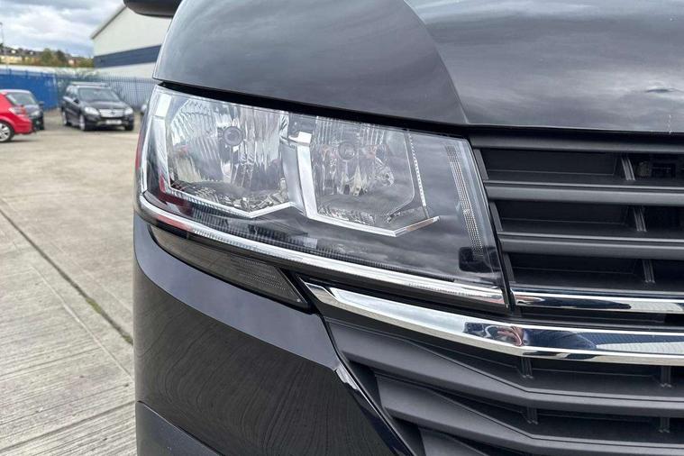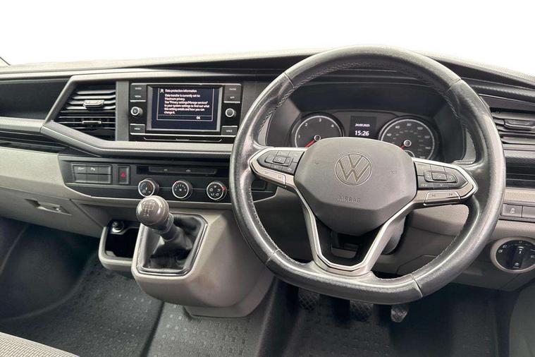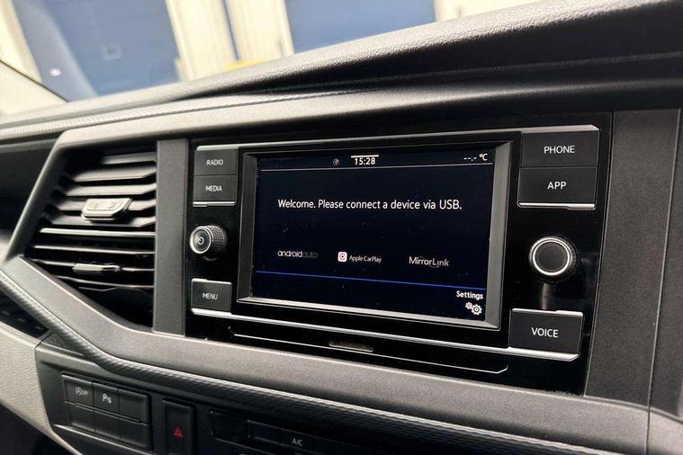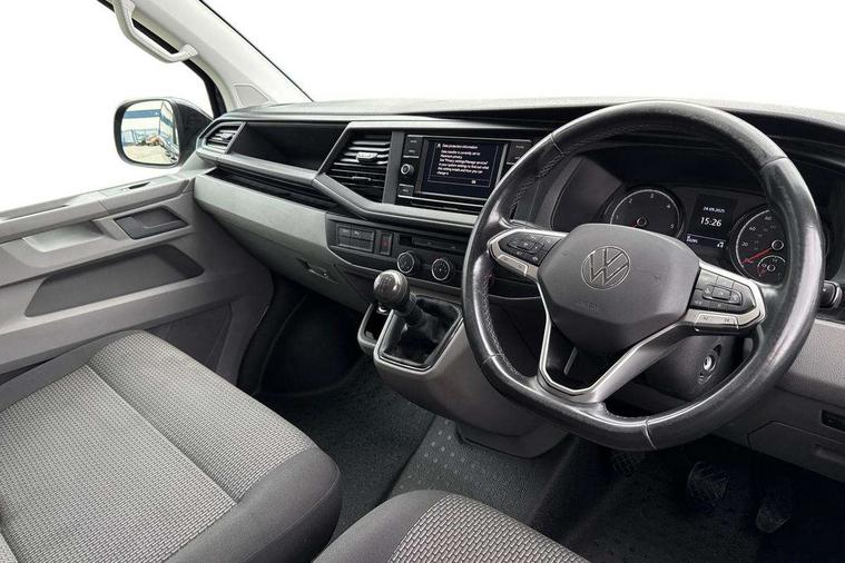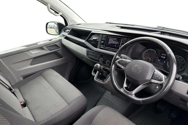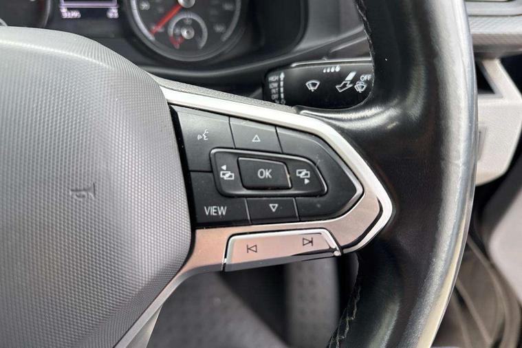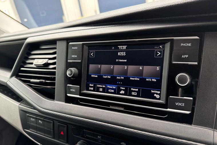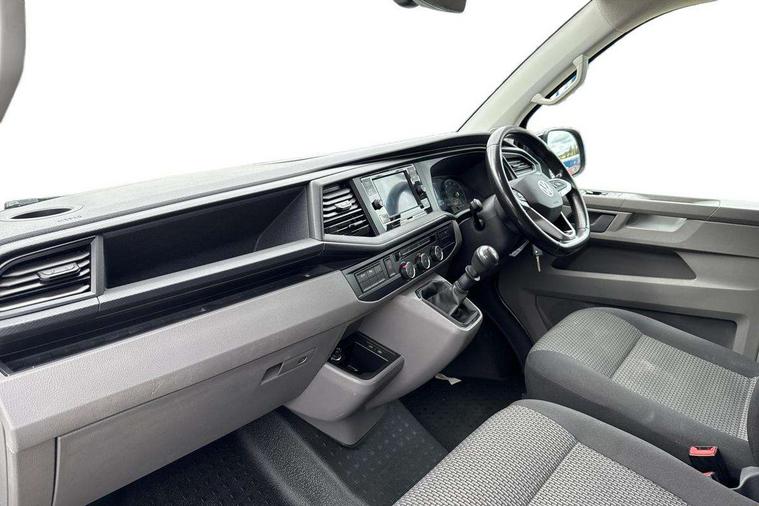 Adaptive cruise control, Cross wind assist, Dimmable illuminated instruments, Driver alert with Multi-function display plus, eCall emergency system, Electromechanical speed sensitive power steering, height and longitudinally adjustable steering column, Forward collision warning front assist with autonomous emergency braking, Mobile phone interface, Multi function display plus with black and white display, 2 USB interfaces type C in dashboard, 4 speakers with 2 tweeters and 2 woofers, Composition colour radio with 6.5" touchscreen, Digital radio reception (DAB+), Volkswagen app connect, Automatic headlight control, leaving home and manual coming home feature, Closing rear wing door with unlatching from the inside, Front fog lamps with cornering light, Heat insulating glass (green) in cab and passenger/load compartment, Heated front windscreen, Left convex exterior mirror, Power folding adjustable door mirrors with separately heated, Radiator grille with 2 chrome trims, Rear wing doors without window apertures, Right convex exterior mirror, Transporter nameplate on the rear fender, Windshield wiper intermittent control with rain sensor for windshield wipers, 3 spoke leather wrapped multi function steering wheel, Auto dimming breakaway interior rear view mirror, Comfort headliner in cab, hardboard roof trim in passenger and load compartment, Dust/pollen filter, Front and rear left without window closed side panel in load compartment, Front seats on the right in 1st row of seat, Glove compartment with illumination, Heavy duty tool kit and jack, High partition, Interior plastic loading edge protection, LED Interior lighting in load and passenger compartment, Manual adjustable lumbar support for right single seat in 1st row seats, Refrigerant R134a, Standard lower part dashboard in palladium, Storage compartments on cab seats and reading light, Without right side window apertures in passenger and load compartment, Comfort pack - Transporter, Exterior pack without fog light- Transporter, Light and vision pack - Transporter, Non smoker pack - Transporter, 3 point height adjustable seat belts on outer seats cab with electric pretensioners, Driver and front passenger airbag with front passenger airbag deactivation, Warning buzzer and light for driver and front passenger seat belt not fastened, Without child safety lock in passenger compartment, Anti theft alarm system with interior monitoring in cab, backup horn and towing protection, Lockable wheel bolts, 16" chassis with 16" brake system, Additional 12V socket, Diesel particulate filter, Electronic stability control, ABS, ASR with deactivation button, hill start assist and brake assist system, Start/stop system with regenerative breaking, 16" Clayton alloy wheels,