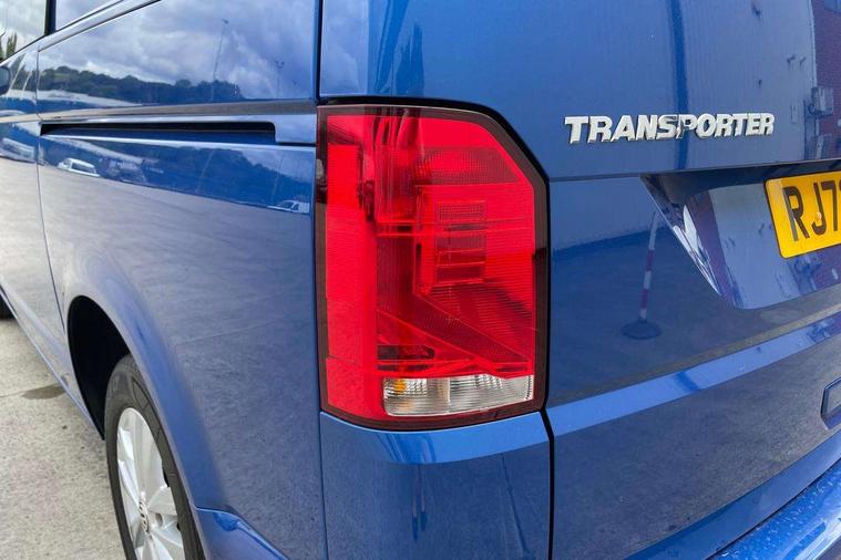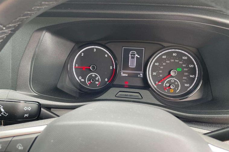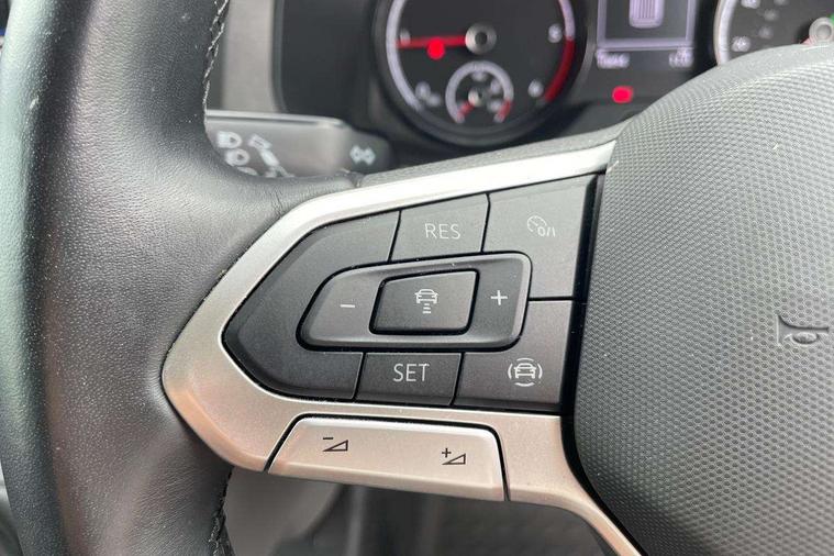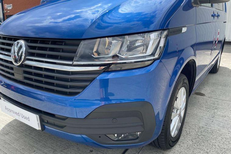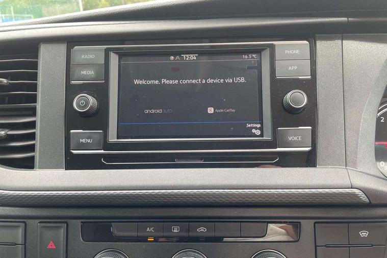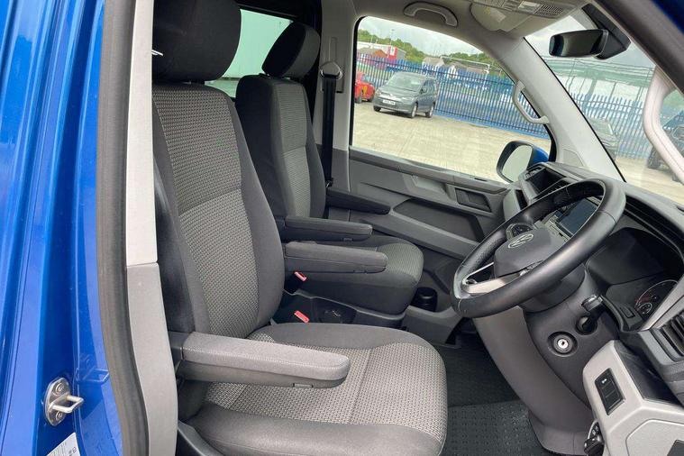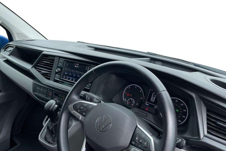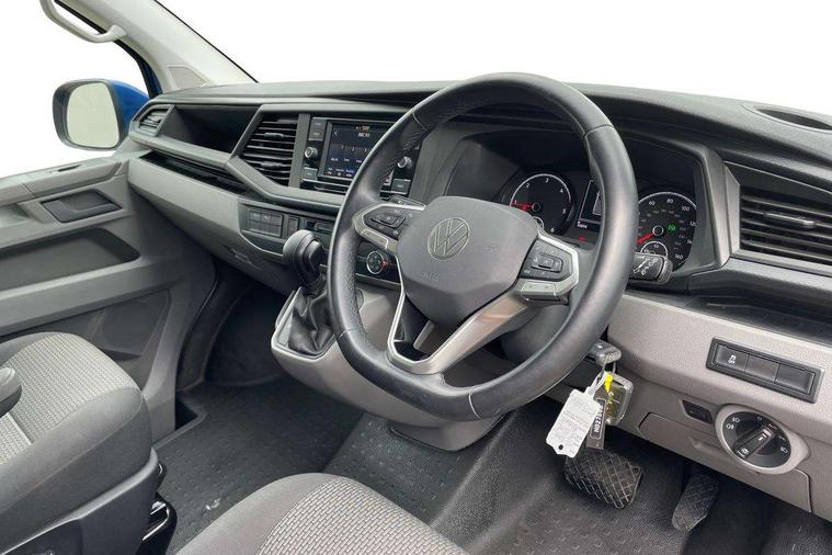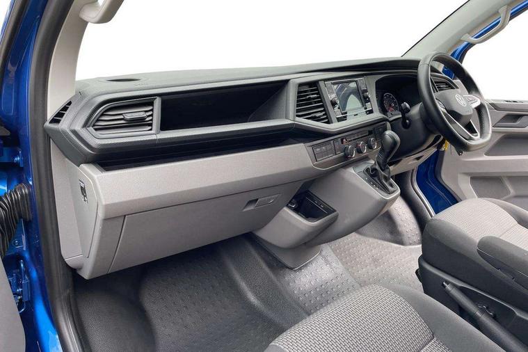 Adaptive cruise control, Child seat anchors ISOFIX and top tether in 2nd row of seats, Cross wind assist, Dimmable illuminated instruments, Driver alert with black and white multi function display plus, eCall emergency system, Forward collision warning front assist with autonomous emergency braking, Headlight range control, Mobile phone interface, Without voice control, 2 USB interfaces type C in dashboard, 4 speakers with 2 tweeters and 2 woofers, Composition colour radio with 6.5" touchscreen, Digital radio reception (DAB+), Volkswagen app connect, Automatic headlight control, leaving home and manual coming home feature, Front fog lamps with cornering light, Green heat insulating glass, Heated front windscreen, Illuminated steps in passenger/load compartment, Left convex exterior mirror, Power folding adjustable door mirrors with separately heated, Privacy glass from the B-pillar and heat-insulating glass in front, Radiator grille with 2 chrome trims, Rear window with heated insulating glass, heated rear window wiper and washer system, Right convex exterior mirror, Tailgate closing with unlatching from the inside, Transporter nameplate on the rear fender, Windshield wiper intermittent control with rain sensor for windshield wipers, Without adhesive film, 3 spoke leather wrapped multi function steering wheel, Additional sound deadening measures in cab and passenger compartment, Auto dimming breakaway interior rear view mirror, Comfort headliner in cab, hardboard roof trim in passenger and load compartment, Dust/pollen filter, Folding grab handles and storage compartments on cab seats, reading light, Front seats on the right in 1st row of seat, Glove compartment with illumination, Heavy duty tool kit and jack, Interior plastic loading edge protection, Lashing rings for load restraint system, LED Interior lighting in load and passenger compartment, Manual height adjustable and lumbar support for driver and single passenger seats, Medium height for vehicles with window aperture hardboard side trim panels in passenger/load compartment, Refrigerant R134a, Standard lower part dashboard in palladium, Without partition, Without seats in 3rd row of seats, Comfort pack - Transporter, Exterior pack without fog light- Transporter, Light and vision pack - Transporter, Non smoker pack - Transporter, 3 point height adjustable seat belts on outer seats cab with electric pretensioners, Driver and front passenger airbag with front passenger airbag deactivation, Power operated child safety lock, Warning buzzer and light for driver seat belt not fastened, Anti theft alarm system with interior monitoring in cab, backup horn and towing protection, Lockable wheel bolts, 16" chassis with 16" brake system, Additional 12V socket, Diesel particulate filter, Electronic stability control, ABS, ASR with deactivation button, hill start assist and brake assist system, Speed limiter, Start/stop system with regenerative breaking, 16" Clayton alloy wheels, Wheel trims,