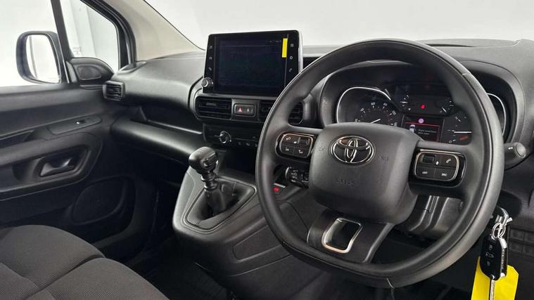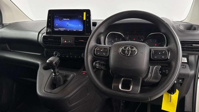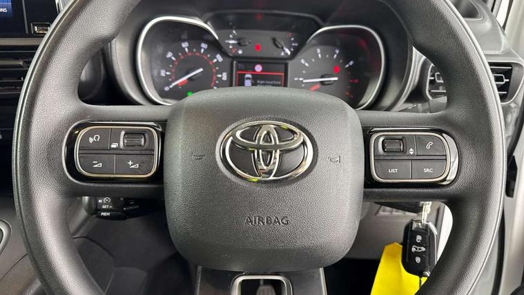 8" touchscreen multimedia display, Analogue speedometer, Analogue tachometer, Audio switch on steering and and steering wheel mounted controls, Bluetooth handsfree connectivity, Cruise control, Cruise control switch behind steering wheel, Display audio with apple carplay/android auto, Dynamic guide lines on reversing camera, eCall emergency system, LCD screen and pictogram, Monochrome multi information display, MyT connected services, PAS, Reversing camera with front and rear parking sensor, Satin chrome surround on multimedia display, Smart phone integration with Android auto & Apple CarPlay, Tyre pressure warning system (TPWS), USB connector X 2, 2 speakers, Aux-in connector, Digital radio (DAB), 180 degree opening rear doors, Anti jam protection on windows, Auto Headlights, Auto wipers, Black door handles, Black front and rear bumpers, Black protection moulding on side door, Black upper front grille, Day-and-night rear view mirror, Daytime running lights, Electric front windows with one touch up/down facility, Electronically foldable wing mirrors, Front fog lights, Gloss black door mirrors, Headlights with cornering function, Heated and power adjustable door mirrors, Panel rear wing doors, Power retractable door mirrors, Privacy glass 30% smoke tint, Roof antenna, Roof rails, Roof rails predisposition, Tinted windows, Two manual sliding side doors, 2 seat front passenger bench, 3 spoke urethane steering wheel, Additional tray on passenger dashboard, Black interior door handles, Bottle holders (0.5L), Cargo area lighting and 3 bulbs, Cargo deck load hook x6, Chrome insert on gear shift, Closed upper driver dashboard storage compartment, Closed upper passenger dashboard storage compartment, Cooler in glovebox, Driver seat armrest, Fabric seats, Foldable backrest for passenger seats, Front bottle holders, Front room lights, Full metal bulkhead, Gear shift indicator, Glovebox with lid driver side, Height adjustable front headrests, In-floor storage box, LED Driver and front passenger personal lights, Manual air conditioning, Manual height adjustable drivers seat with lumbar support, Manually reclining and sliding front passenger seats, Mirror on driver sun visor, Open glovebox passenger side, Open tray on passenger dashboard, Overhead driver and front passenger storage, Panel bulkhead, Plastic floor trim in cargo area, Plastic load floor protection, Pollen filters, Row 1 carpet floor, Row 3 panel on both sides (in place of window), Rubber cargo liner, Rubber floor mats in load area, Satin chrome insert on steering wheel, Smart cargo, Urethane gear shift, Passenger airbag, Supplement restraint system (SRS) 2 airbags, 2 remote keys, Central locking, Key starting system, Adjustable speed limiter (ASL), Anti lock braking system (ABS), Brake assist, Downhill Assist Control (DAC), Electronic brake force distribution (EBD), Electronic parking brake, Electronic Stability Control (ESC), Hill start assist, Stop/start function, Vehicle stability control, 16" 5 triple spoke steel wheels with wheel caps, Full size spare wheel,