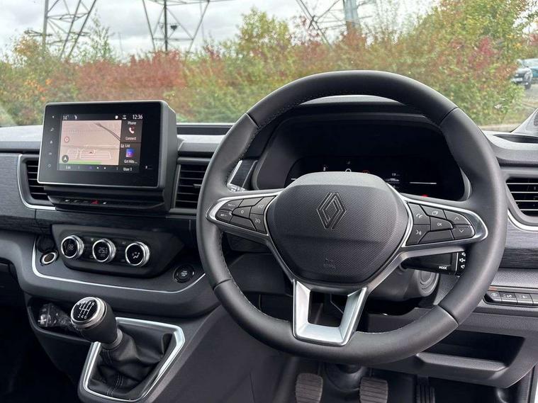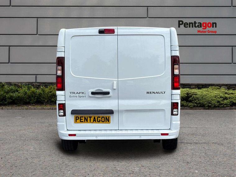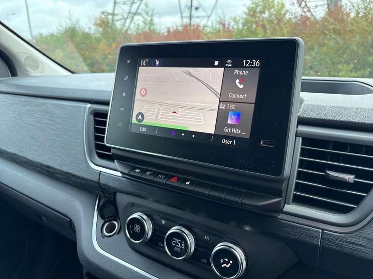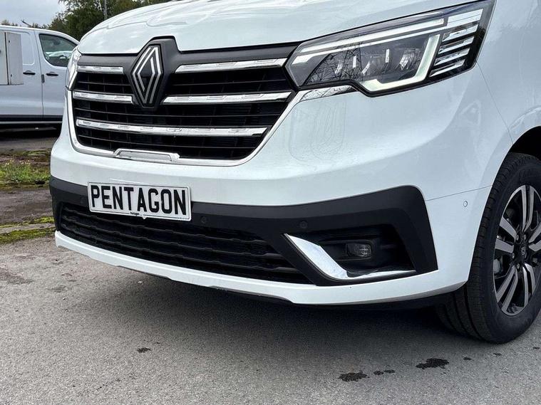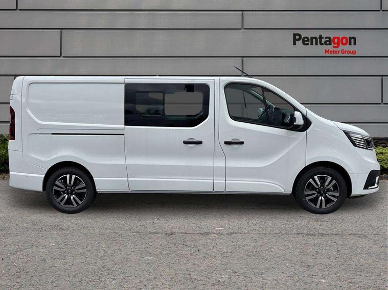 360 degree parking sensors (front, rear and lateral ultra sonic sensors), 7" Colour TFT driver information display, Driver attention alert, Driver drowsiness warning, E-Call - automated emergency call, Easy link navigation with 8" touchscreen DAB radio with bluetooth, USB + aux input, compatible with Apple CarPlay and Android Auto, ECO mode button, Gearshift indicator, Intelligent Speed Assist, Lane departure warning system, PAS, Rear parking camera, Trip computer, Wireless smart phone integration with Android auto & Apple CarPlay, Automatic high beam, Blind spot mirror on passenger sunvisor, Body coloured door mirrors, Body coloured door rail and rear tail light column with chrome grille, Body coloured front bumper, Body coloured side mouldings, Chrome Grille, Electric folding door mirrors, Electric front windows with one touch drivers window, Front fog lights, Full LED headlights with C-shaped DRL, New brand identity, Roof bar fixings, Side loading door - L and R glazed with opening window, Wide view mirror, 12V power socket in front, 16 load anchorage points, 2nd row of 3 passenger seats Individual seats with adjustable headrests, ISOFIX (left & right seat), 2 armrests, Climate control, Closed glovebox, Glazed full bulkhead, Height adjustable drivers seat with armrest and lumbar adjustment, Interior LED cabin lighting, Interior side panels - load area, Interior side panels up to windows, Java cloth upholstery, LED load space lighting, Premium dashboard with horizontal grain and chrome styling, Premium faux leather steering wheel, Look pack - Trafic, Parking pack - Trafic, Visibility pack - Trafic, 3 point height adjustable seatbelts with pretensioners and load limiter, Driver and passenger airbags, Driver and passenger seatbelt reminder, Front lateral and curtain airbags and passenger airbag with deactivation, Alarm - Thatcham T1 volumetric alarm, Alcohol interlock pre-device, Deadlocking, Electronic immobiliser, Hands free key card with push button stop/start function, Keyless entry system, Remote central locking, 20L AdBlue tank, 4 disc brakes, 6 speed gearbox, 80 litre fuel tank, ABS with EBD (Electronic Brake force Distribution), Active emergency braking system, ESC (Electronic Stability Control) with Hill Start Assist and Grip Xtend, 17" Avens diamond cut alloy wheels,